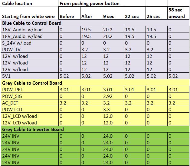 Hi Budm, I captured as much of this info as possible in the attached table. It shows the voltages with power to the TV and before the Power Button is pressed, after the Power button is pressed, after 9 sec (relay clicks), after 22 sec (another click), after 25 sec (third click and led on Control board goes off, and finally after 58 sec when the TV shuts itself off and then stays in that condition unless unplugged.