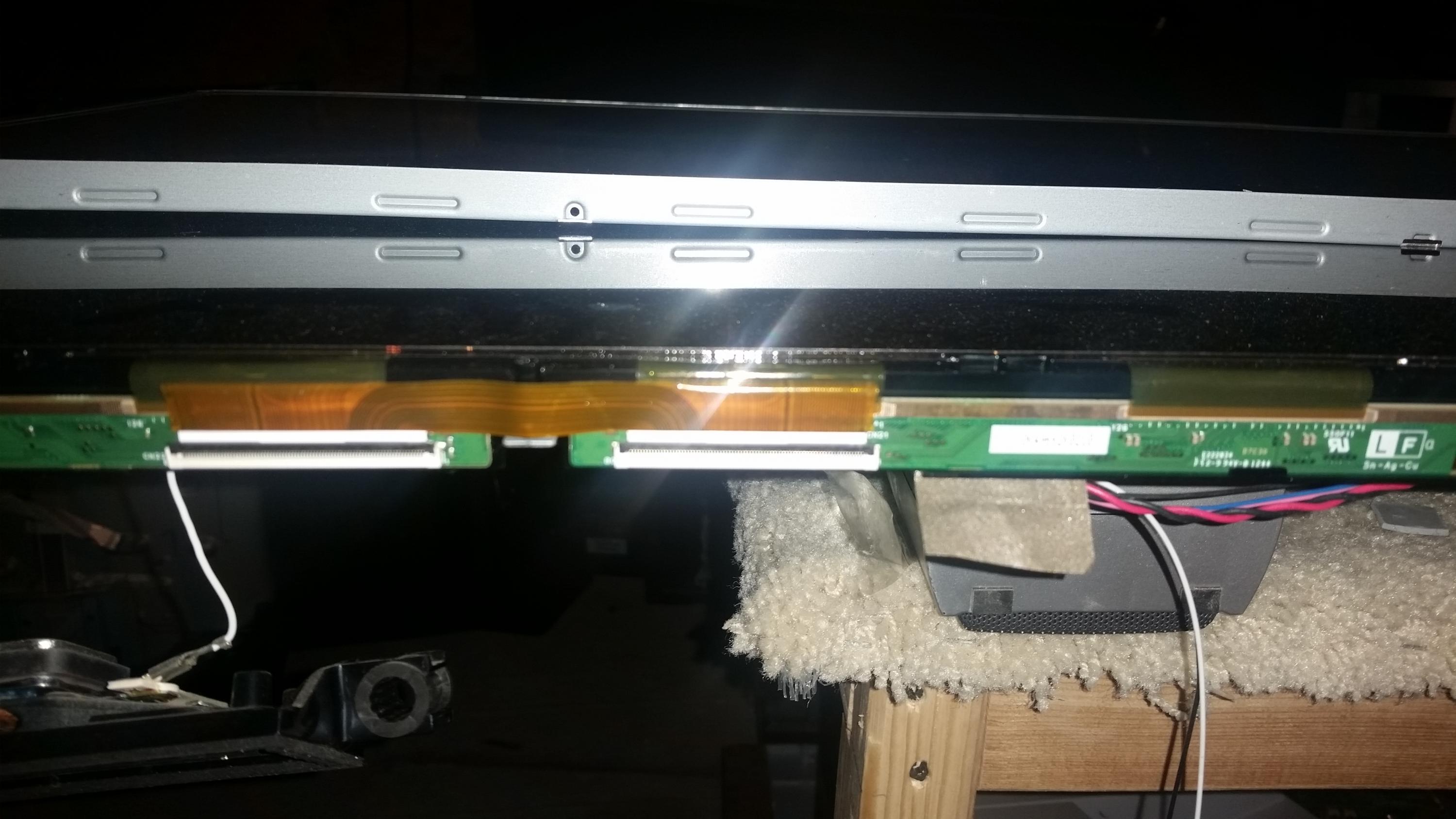 When removing the left hand ribbon cable from the T-con board, a white image is displayed on that half of the screen and a black screen is shown on the right. If I gently rub the ribbon cable on the right an image or purple black bars appear. The cable doesnt appear damaged, and if swapped with the other ribbon cable the same flickering symptoms can be seen.
