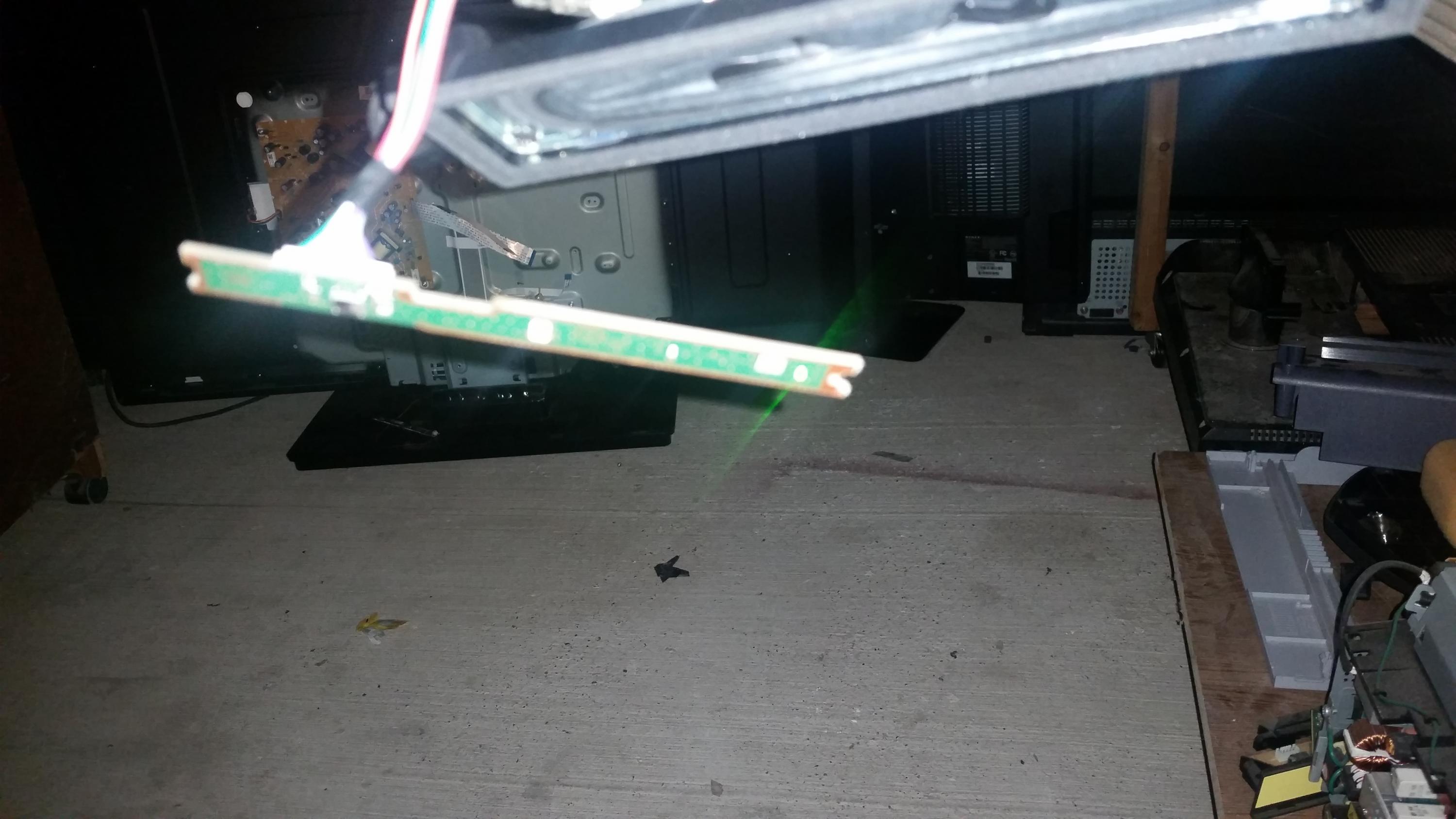 He had opened the TV from the back, trying to get to the backlight, supposedly gave up, reassebled everything and gave the TV to me.