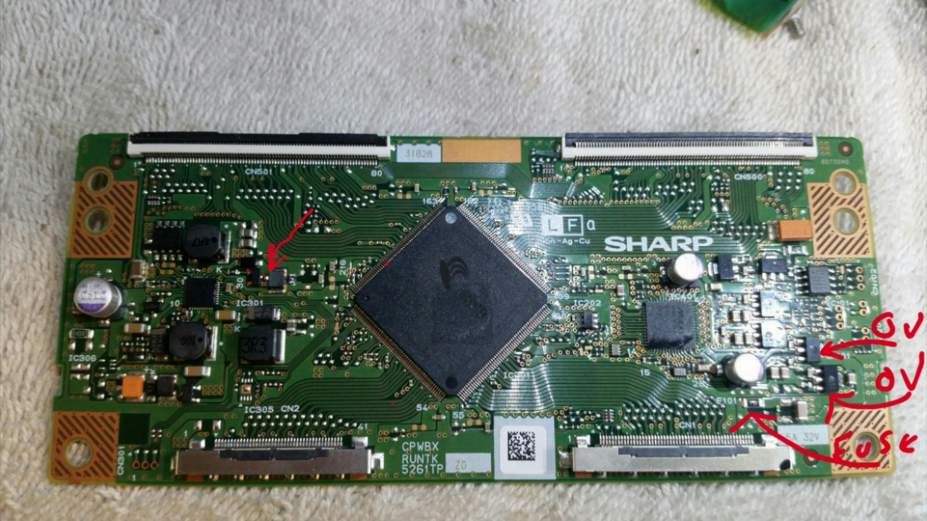 SMD transistor is shorted..saw a video that shopjimmy has with this same t-con and they explain that if that small smd transistor was shorted it was caused by the panel it self being shorted by that shorting the t-con even if I add a new t-con..