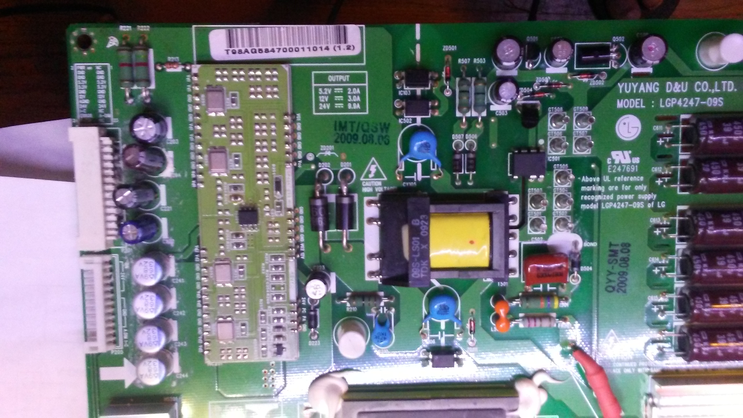 Found an lg42sl80 that was thrown out. I'm trying to learn how to repair modern sets and figured this would be a good way to do it. The set will not power up, it goes through a self check or something, relay clicks on cycles through the LEDs then clicks off again and repeats. At first look I found two shorted power mosfets and a fuse as well as a four bad caps, all parts have been replaced and I've managed to get standby 5v. I've downloaded the service manual and tried the procedure to power up the power supply, but no luck the 12v and 24v should come on but they do not.Readings on conector p201 are