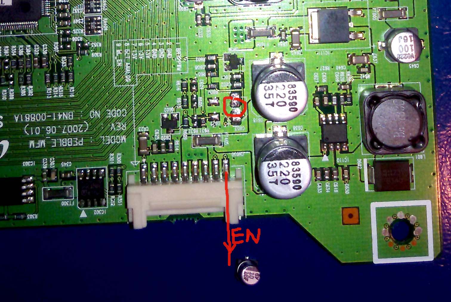 At this point I was happy with the result, but decided to track the signal down into the mysterious area of the logic board. And that signal was there. It turned out, that logic board was driving EN line correctly. So what happened ? You are not aware of one step which I skipped: I desoldered some 100u cap because it obstructed tracking the trace down. And this damn cap had shorted, connecting EN to ground in a shortsolid way. Now works like a charm. (more like a 2007 charm)