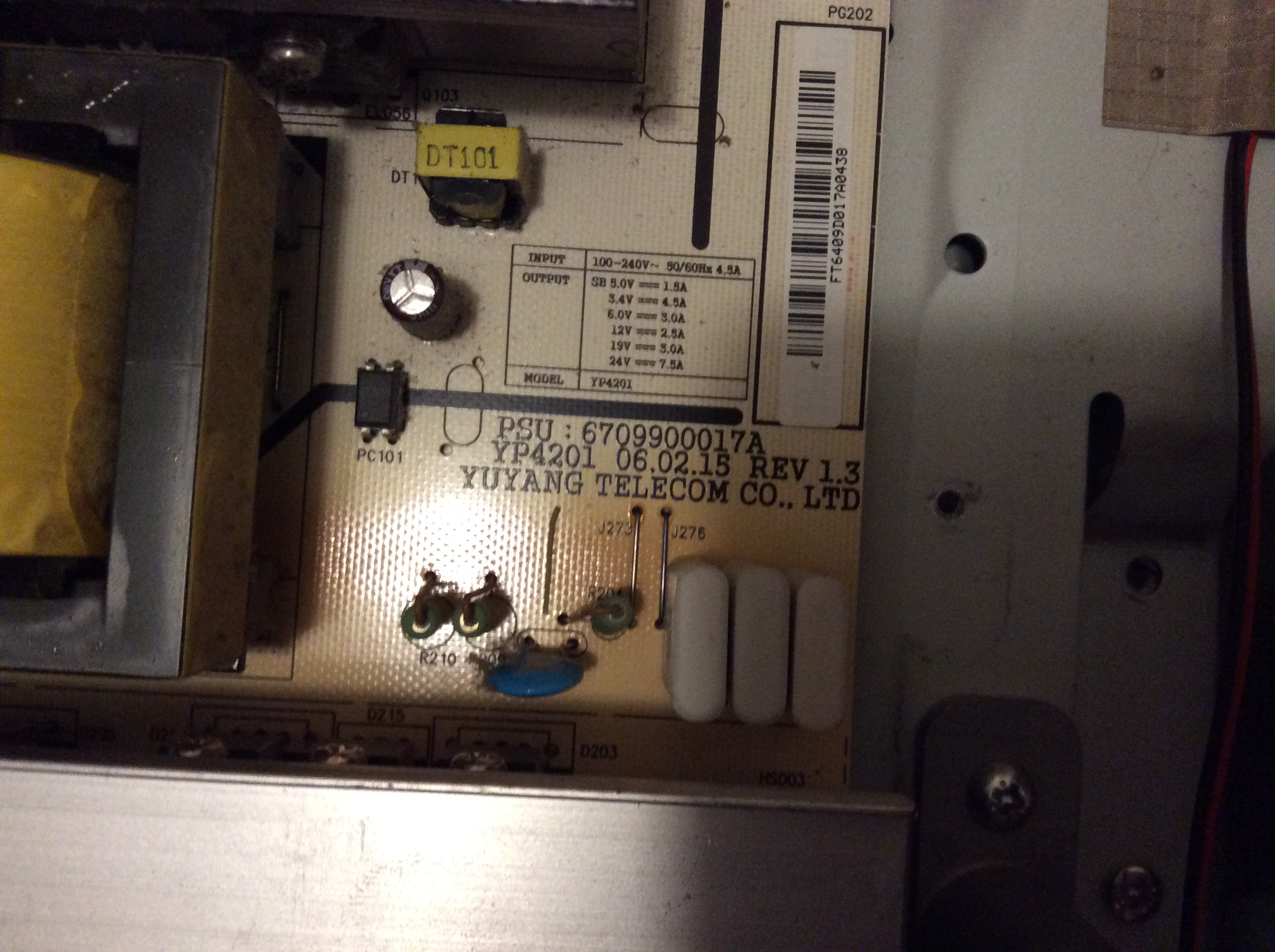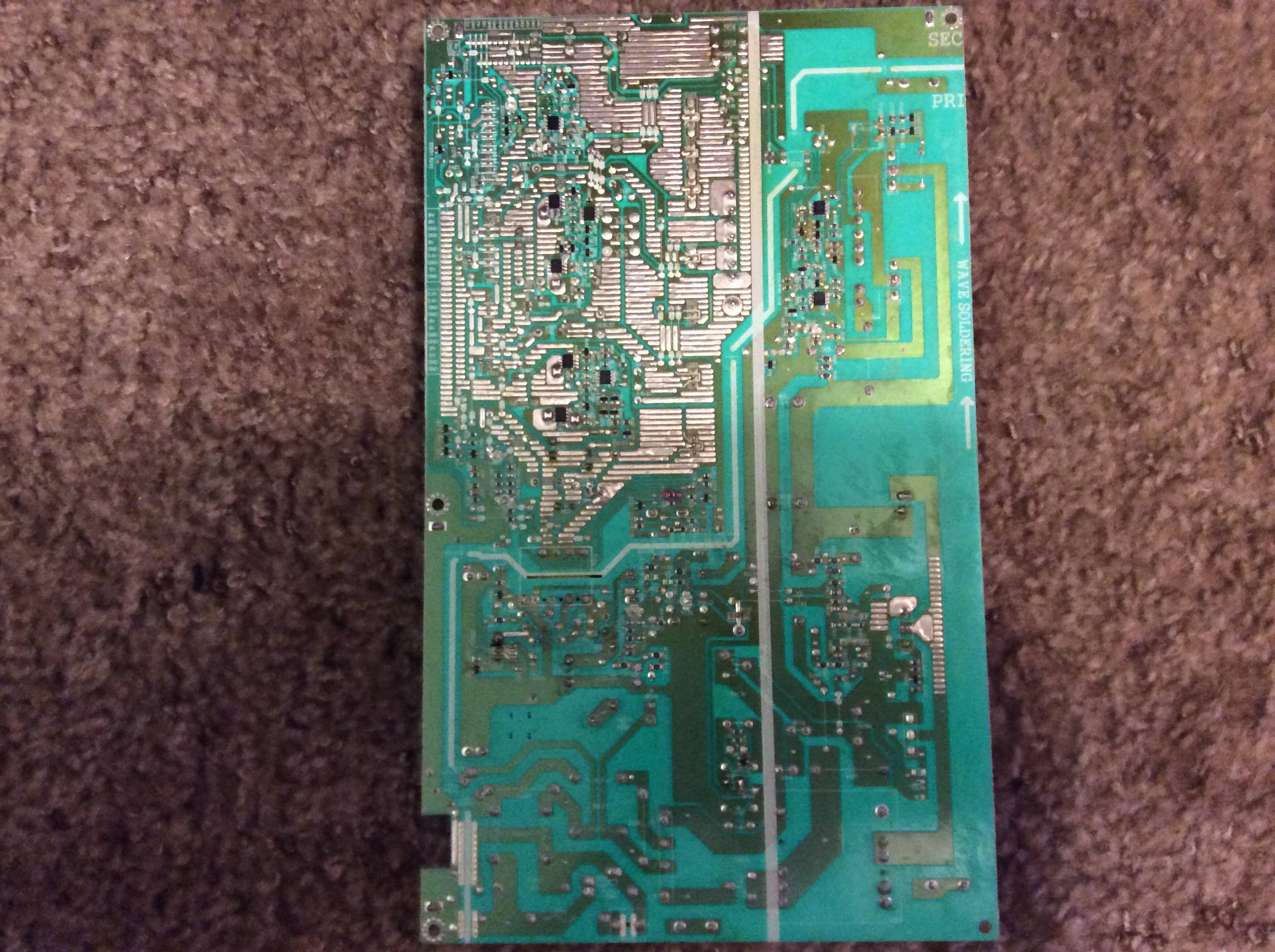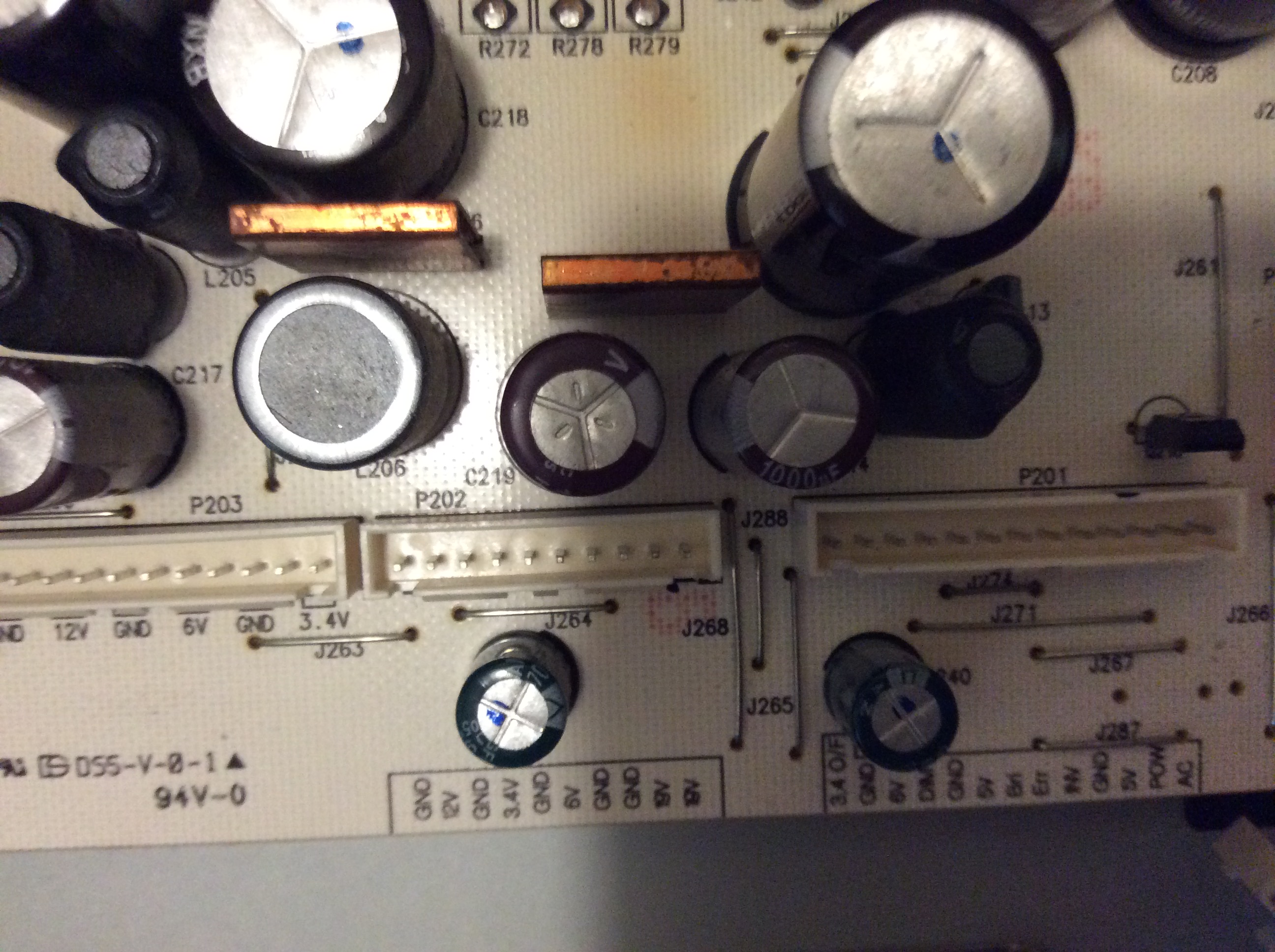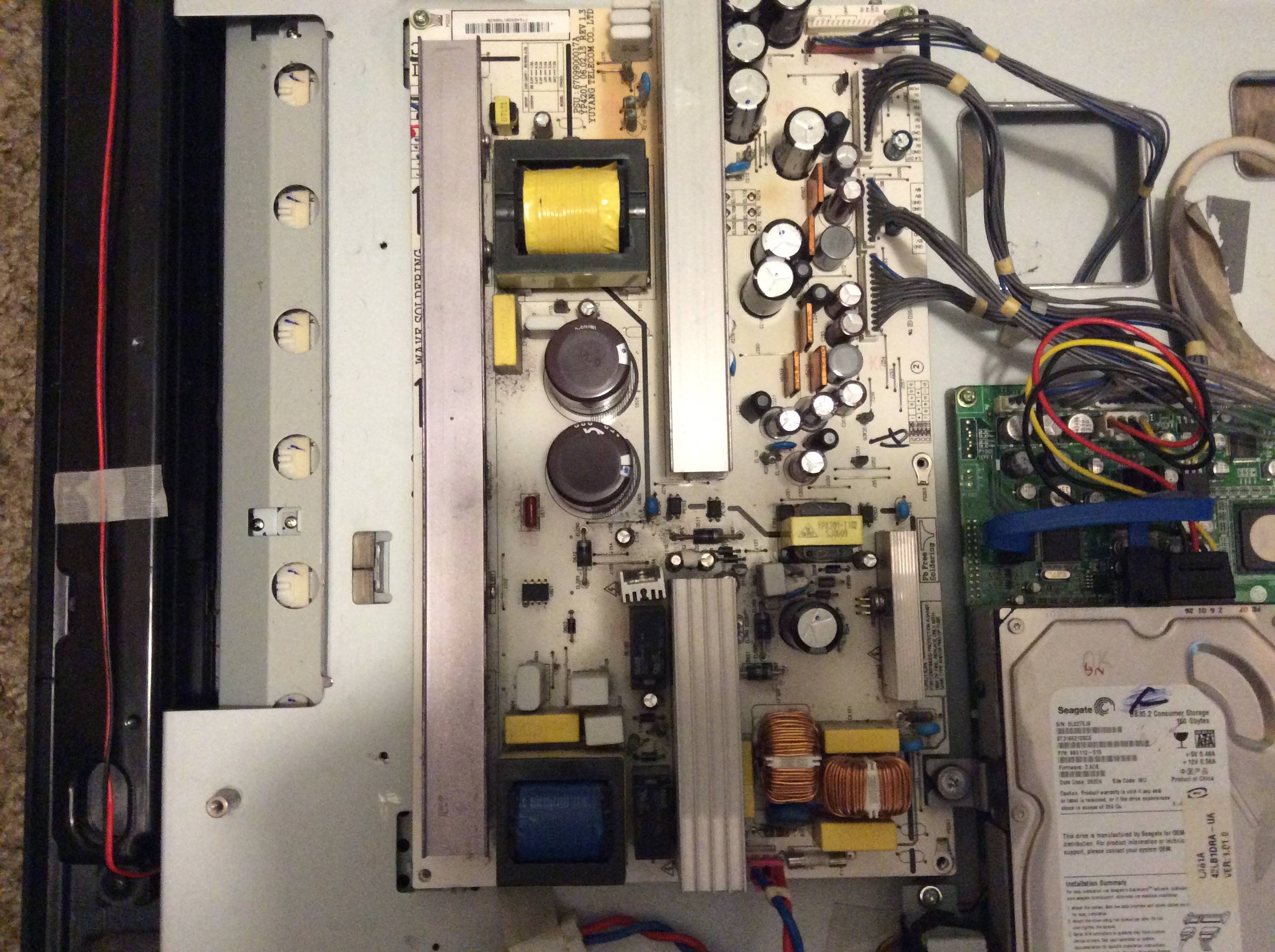 I recently got this set for free off a craigslist ad and I need some help on getting it working again. When I first brought it home and plugged it in, the backlight would come on, but that was it. I researched the problem and found that there were some capacitors that were known for going bad on this TV's main power supply board, most notably C235. When I opened it up to no surprise, C235 was blown. I decided to replace C235 and the 3 others that were like it (C201, C202, and C219 I believe) even though they hadn't failed yet with some 25v 2200uF nichicon caps (the original caps were only 10v, same value though).