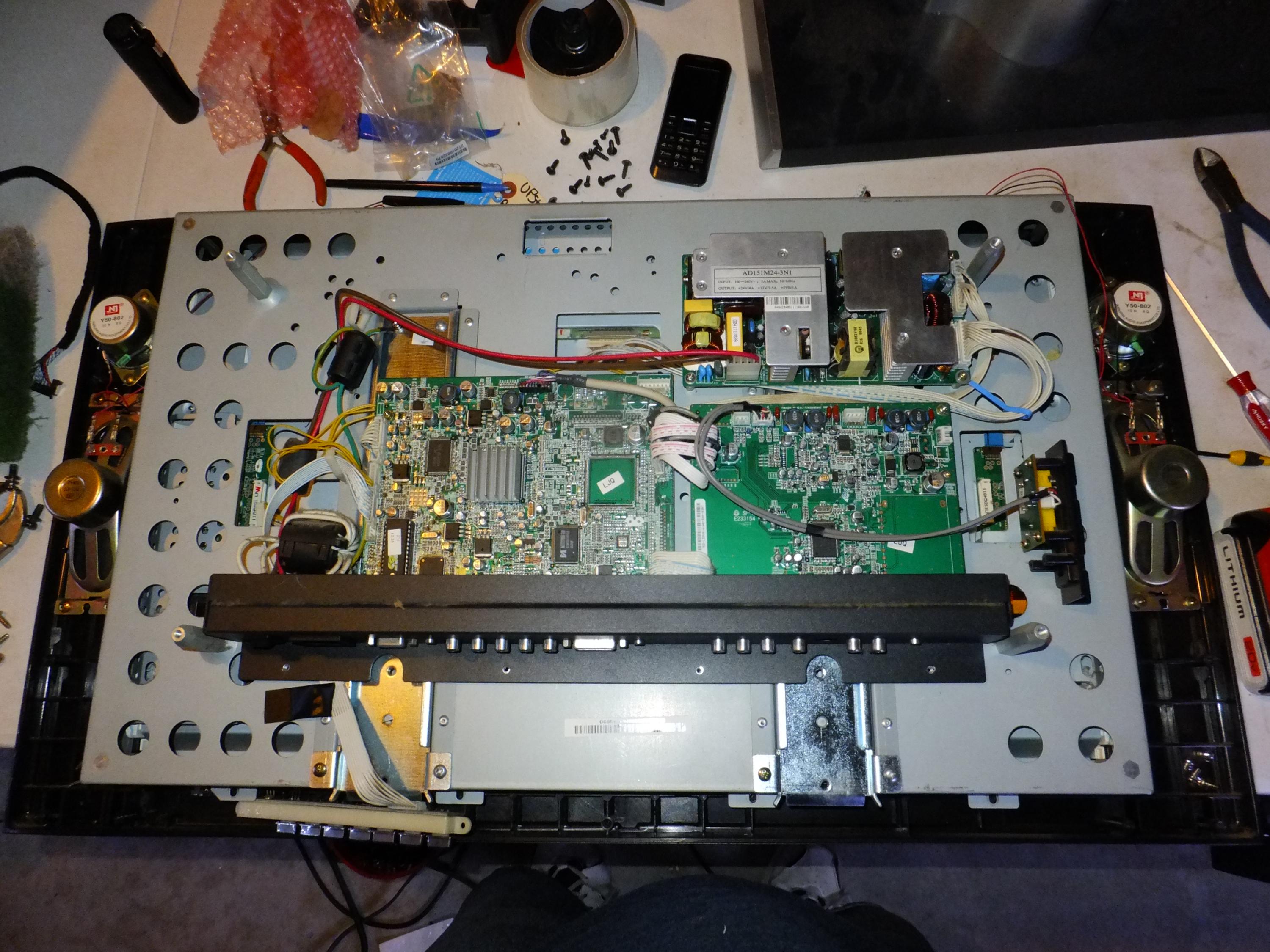 Upon opening there is no visible bad parts. So then I tare it apart to inspect the inverter boards and no bad caps on those either. I now suspect the lamps and I will be checking those in the next few days.