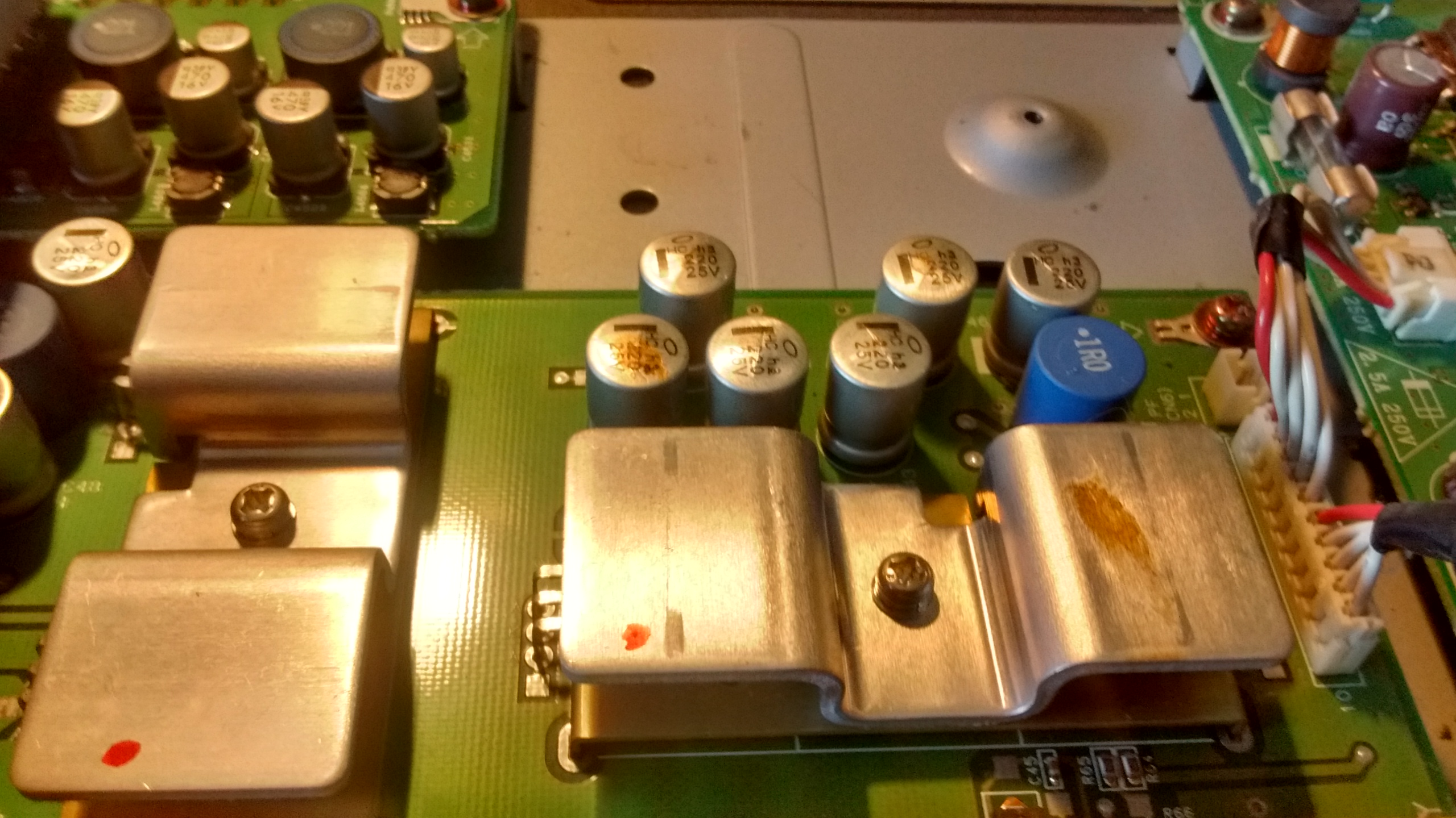 Solution: Six 220uF 25V out of nine caps on the power board were blown. Replaced all nine with 220uF 25V caps.