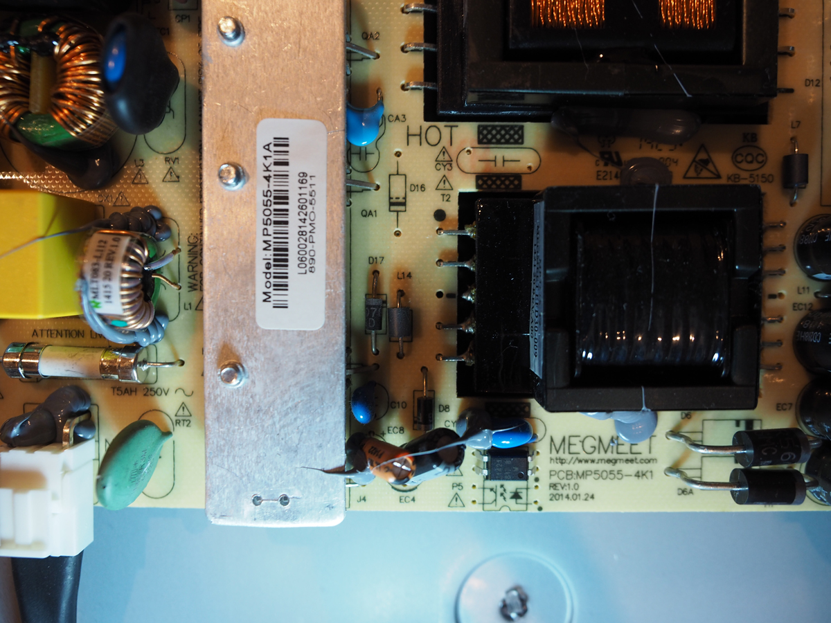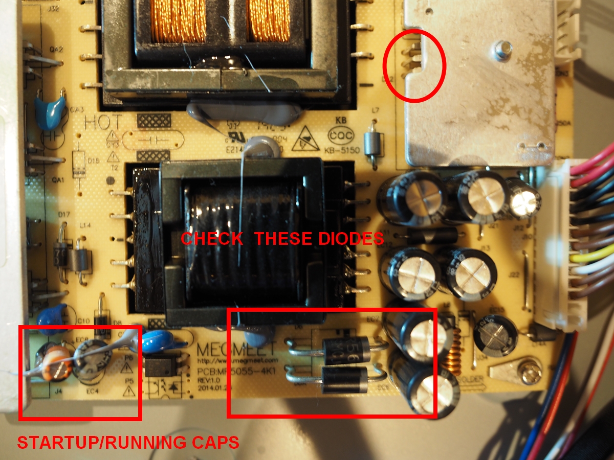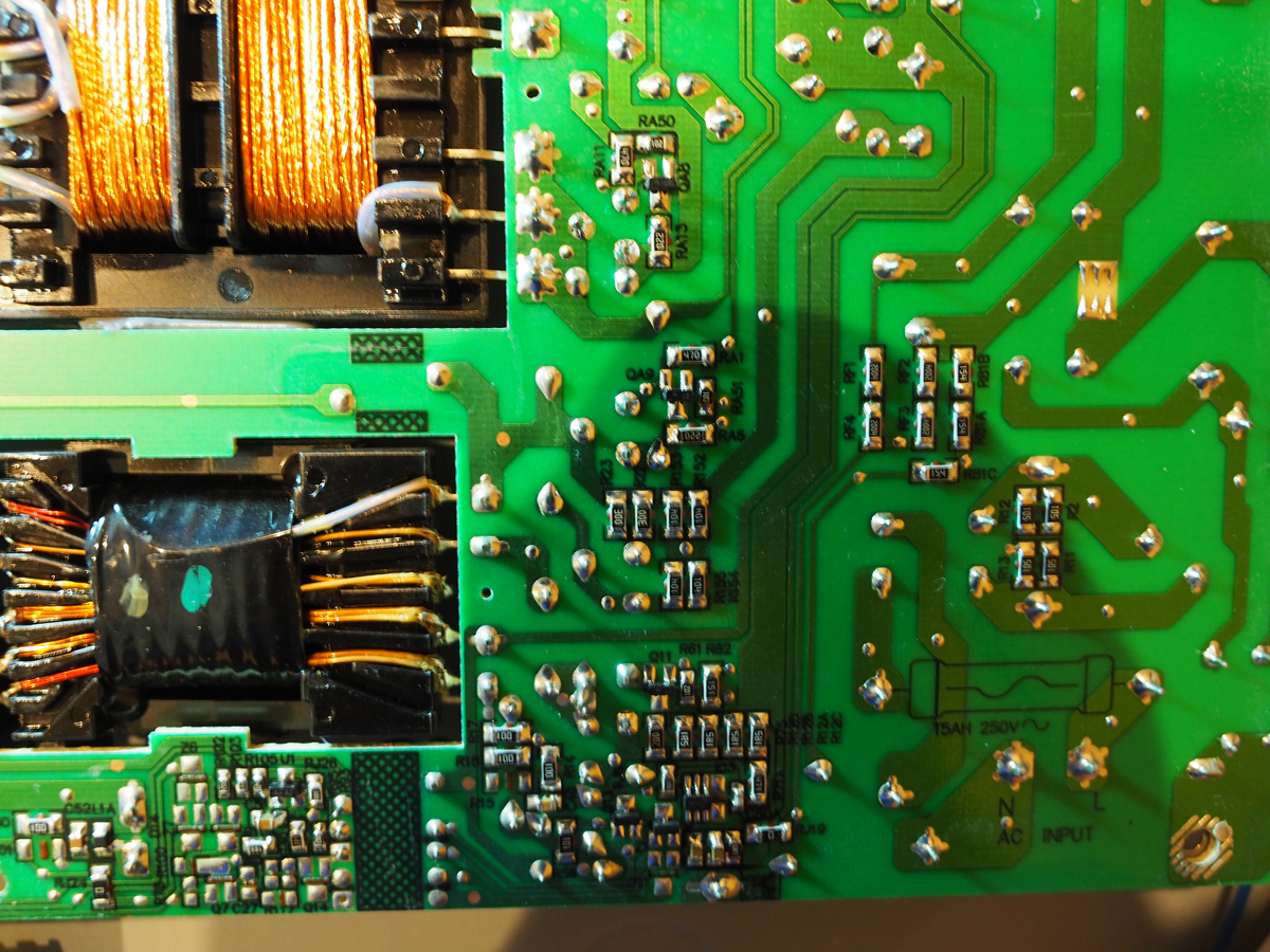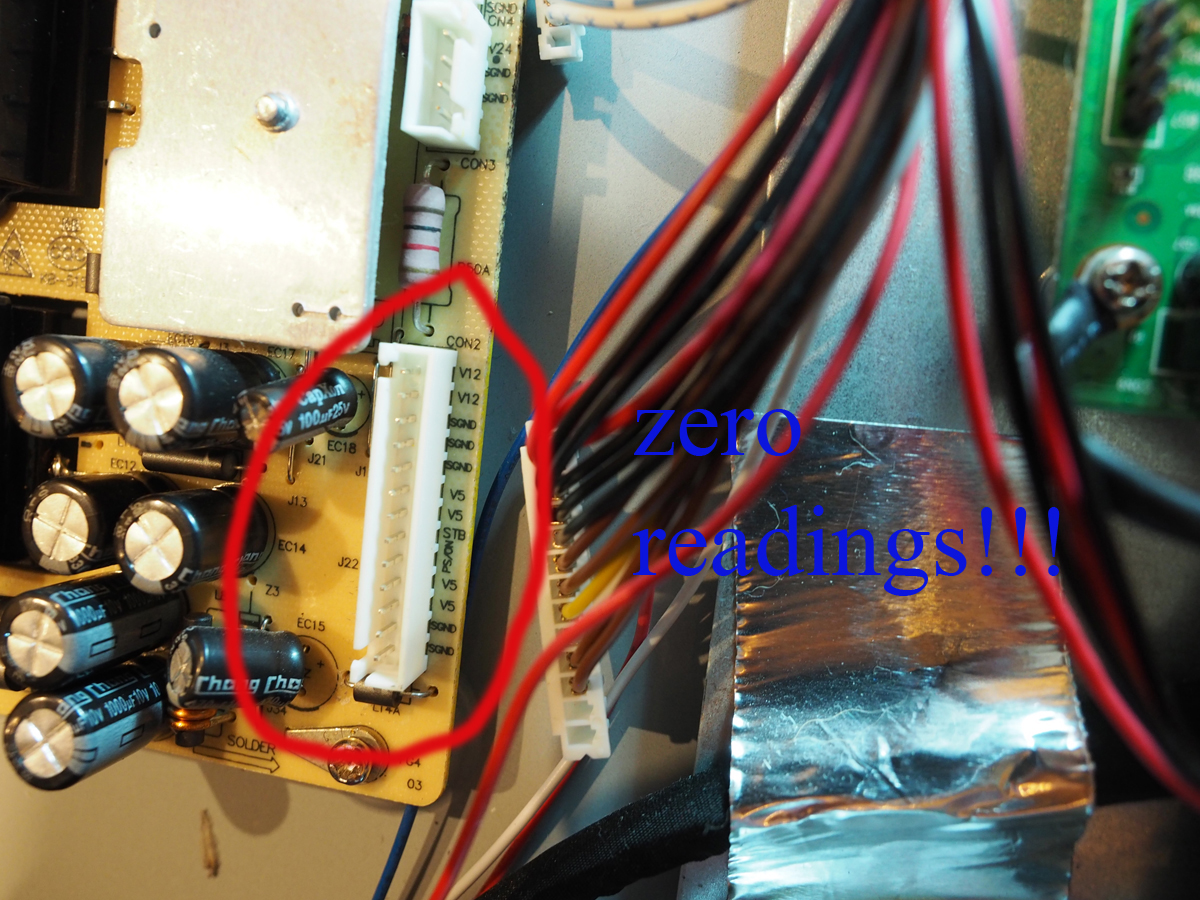 Hello everyone please help me troubleshoot this tv. It has no stand by light thus it will not power on... all the sudden. Here are some pictures. I assume the problem lie somewhere on the power supply board (PSB).. So here are some close up pictures of it. The fuse is good and but i got zero reading at those areas circled in red. Thank you so much for any helps/suggestions.