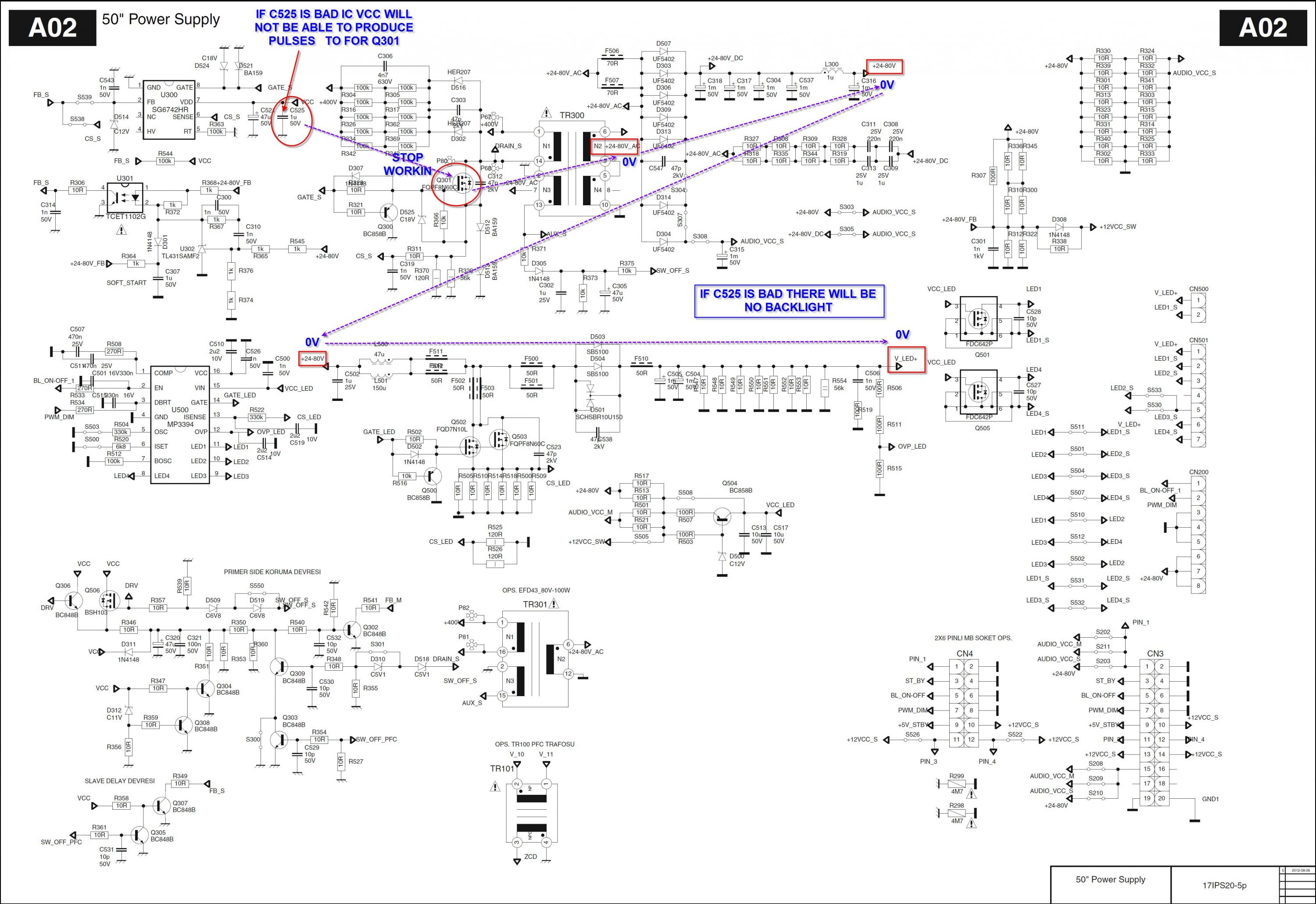 Hi Sorry to jump on to this thread but my issues are the same as above largely. I am trying to sort no backlights ona JVC LT50 TW60J with the dreaded 17IPS20 board. Have followed closely the many threads on this especially the excellent youtube video by ReecyBurger123 which was very helpful but seem to now have reached a dead end. The set has a working screen with an occasional flash of backlight at startup but most of the time backlight's remain stubbornly dead. I was convinced it was a LED problem so checked to find odd faulty LEDs but once all were fixed and and each strip tested and working I get no backlight on connecting up the whole series and firing the set up. The LED out from the board goes straight to 156v and remains there constantly. But no 180-190v startup voltage. With the LEDs in place I get 156v at the beginning of the LED circuit and 95v at the end of the LED circuit on the return to the board. Reading all the threads I am left with suspecting the startup boost. Any help if pointing me to the likely board culprits would be very appreciated as nearing wits end on this issue!