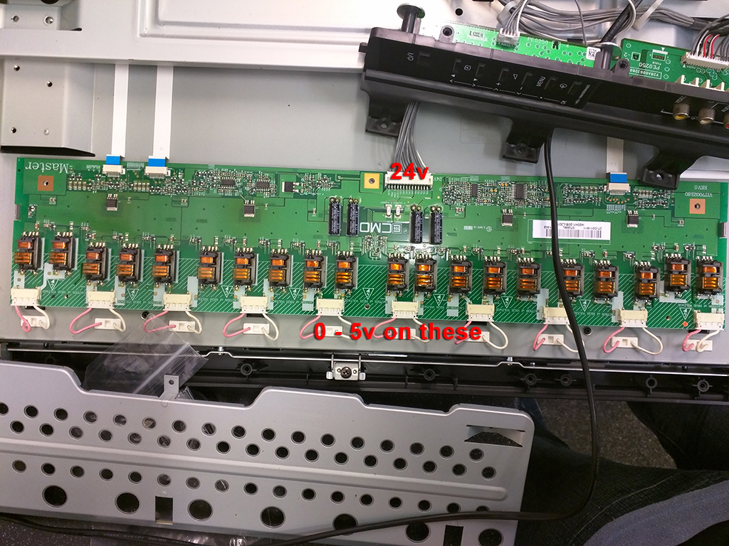 I thought the tcon was the issue but on more digging, I feel there is an issue with the inverters. Come to think of it, I've never tested these before. I got 24v going to the inverters (both) but testing the pink and white wires, I get 0v - 5vdc. Should I see a higher volts on all points?