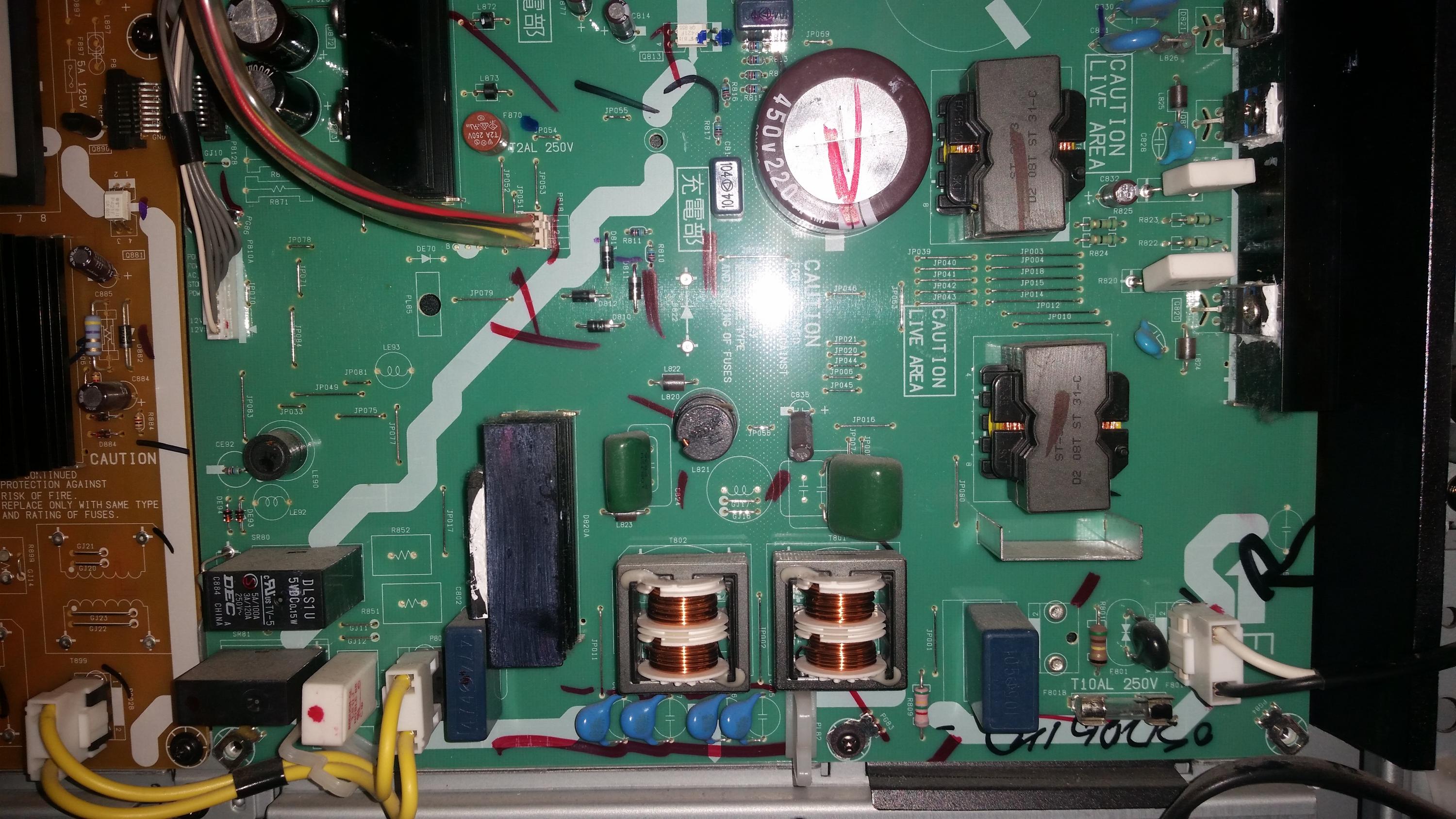 How much DC V is on the main filter capacitor on the primary side of the PSU when the TV is turned on? Careful, there can be close to 400V on that thing!