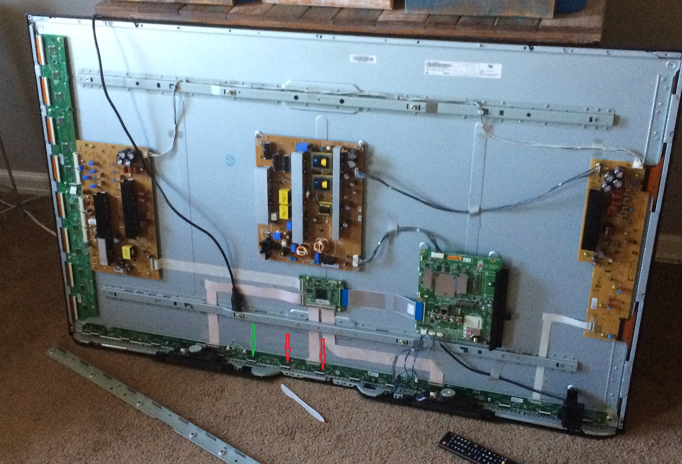 Disconnecting and reconnecting the ribbon cables marked with a red arrow did not fix the issue. When I leave the ribbon cables under the red arrows disconnected there is no change in the picture. When I disconnect the ribbon cable under the green arrow, there is a new thinner black bar next to the existing black bar, but it is not as black as the original one. This is leading me to believe it may be the panel itself that is the problem.