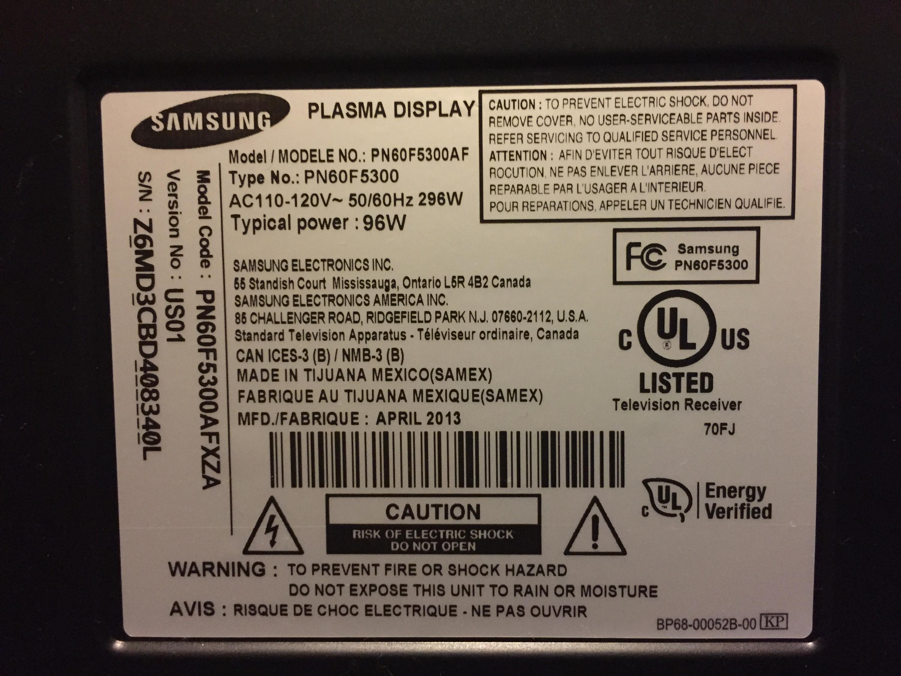 I have a 60 inch Samsung Plasma TV (PN60F5300AFXZA). It is about three years old. I went to turn it on one day and it wouldn't turn on. There was no video and no sound, but the standby light was on. I unplugged everything and let it sit overnight unplugged. I tried the next day to turn it on (with just the power cord plugged into the wall), and it still didn't turn on.