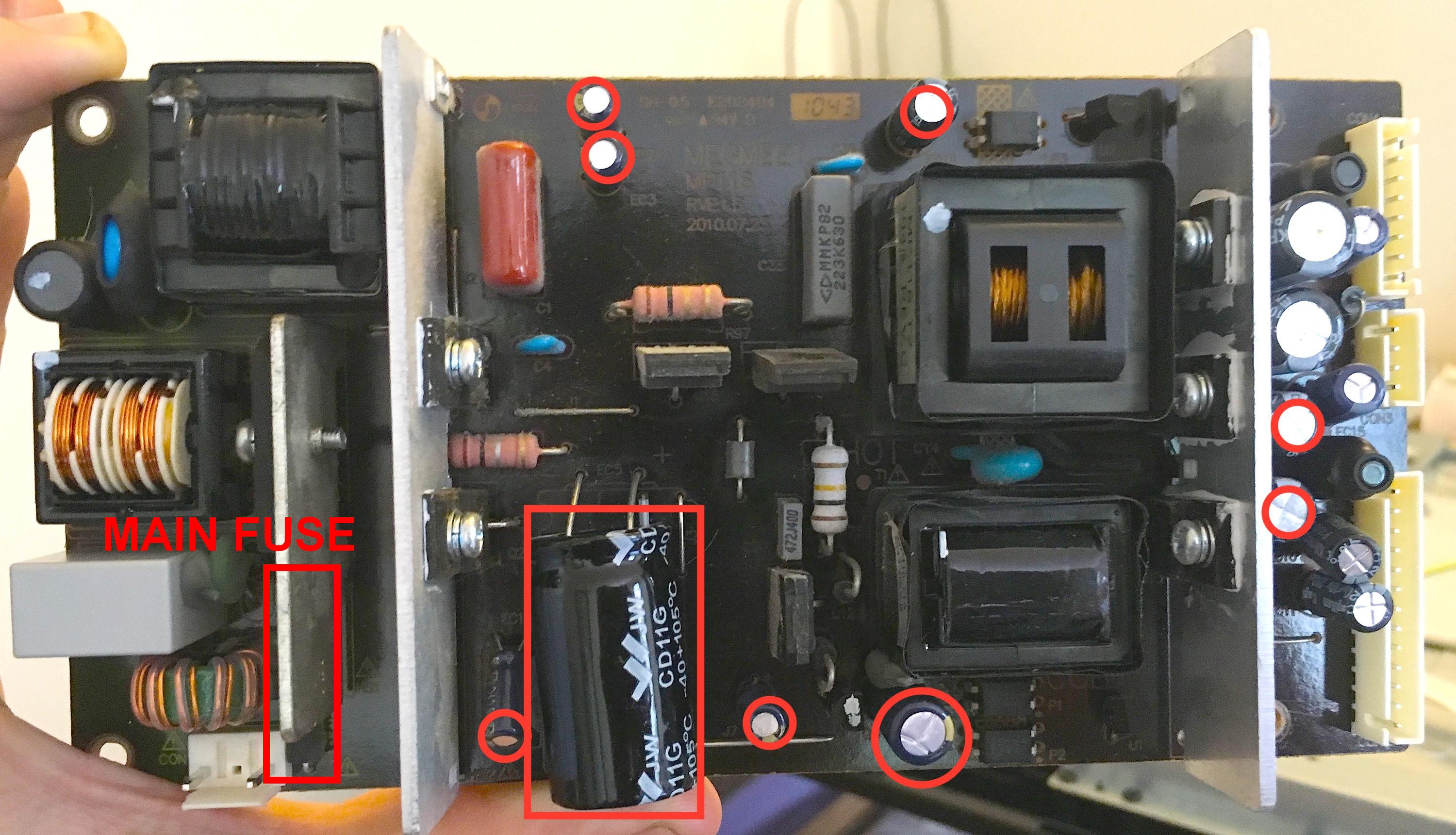 I've attached a picture of the PSU with all the capacitors I've replaced highlighted. The huge capacitor in the middle and the two at the far side were the only obviously bulging ones. I replaced the others in the middle section after finding the other post about this set (which admittedly had a different symptom).