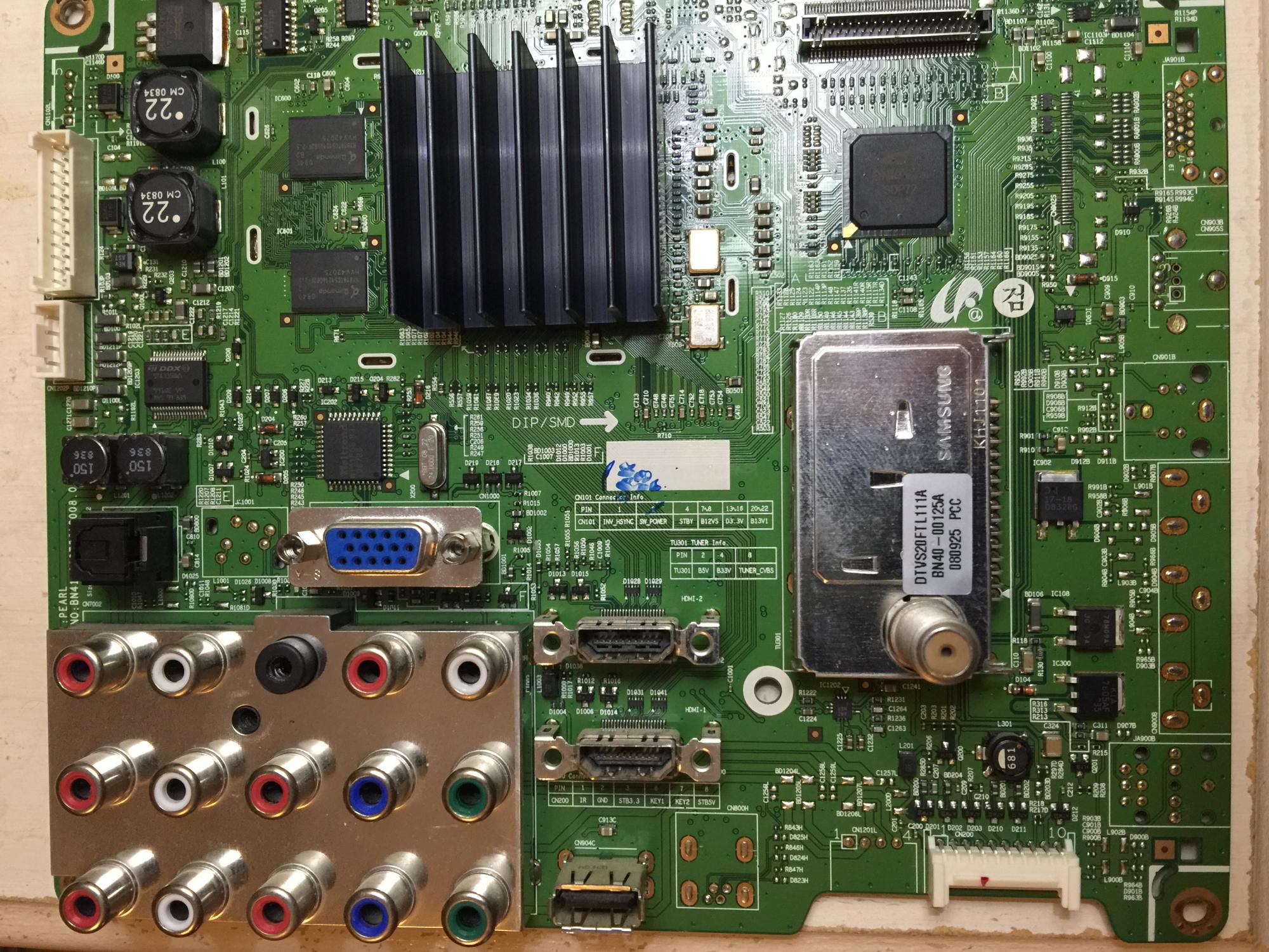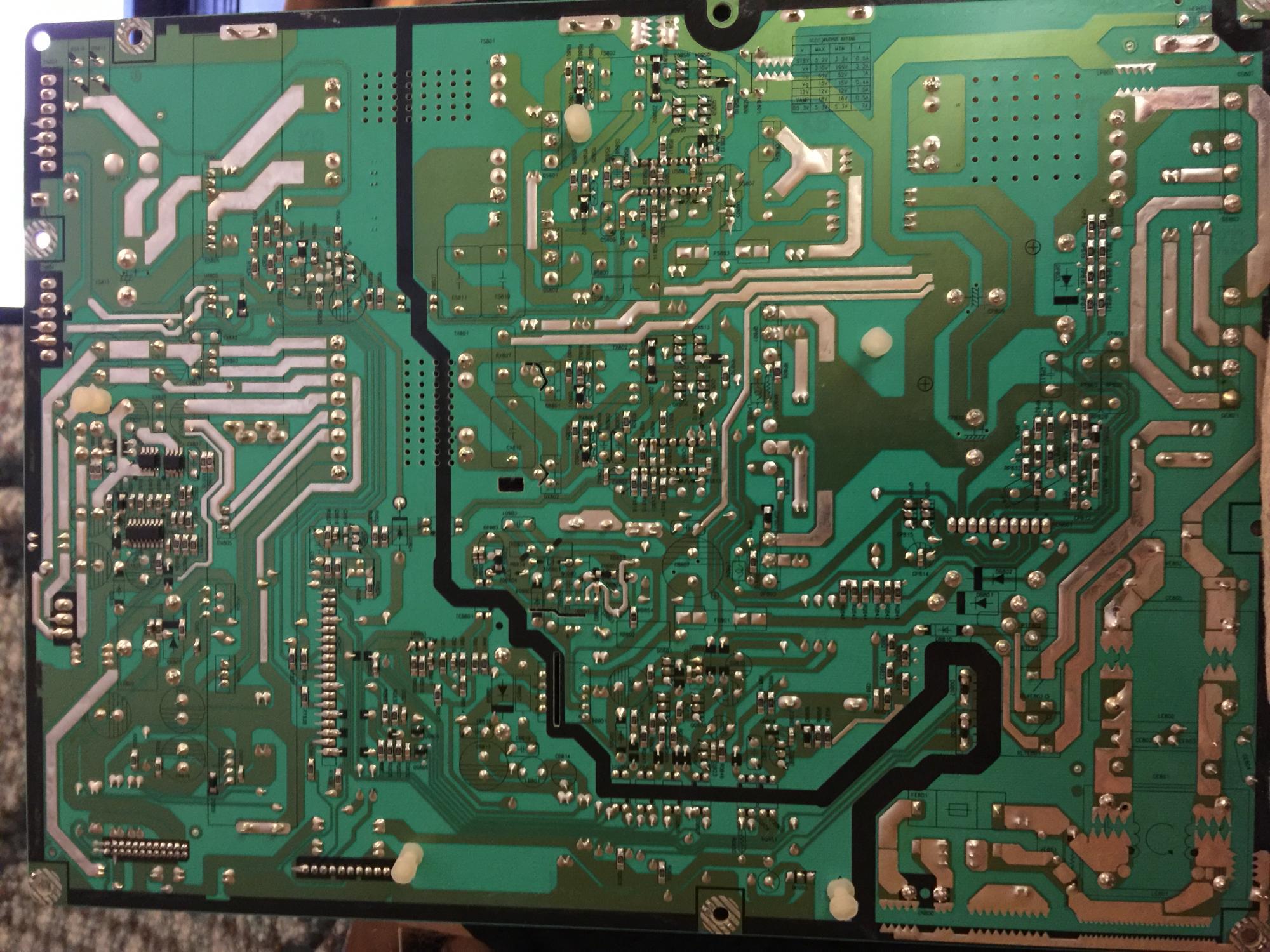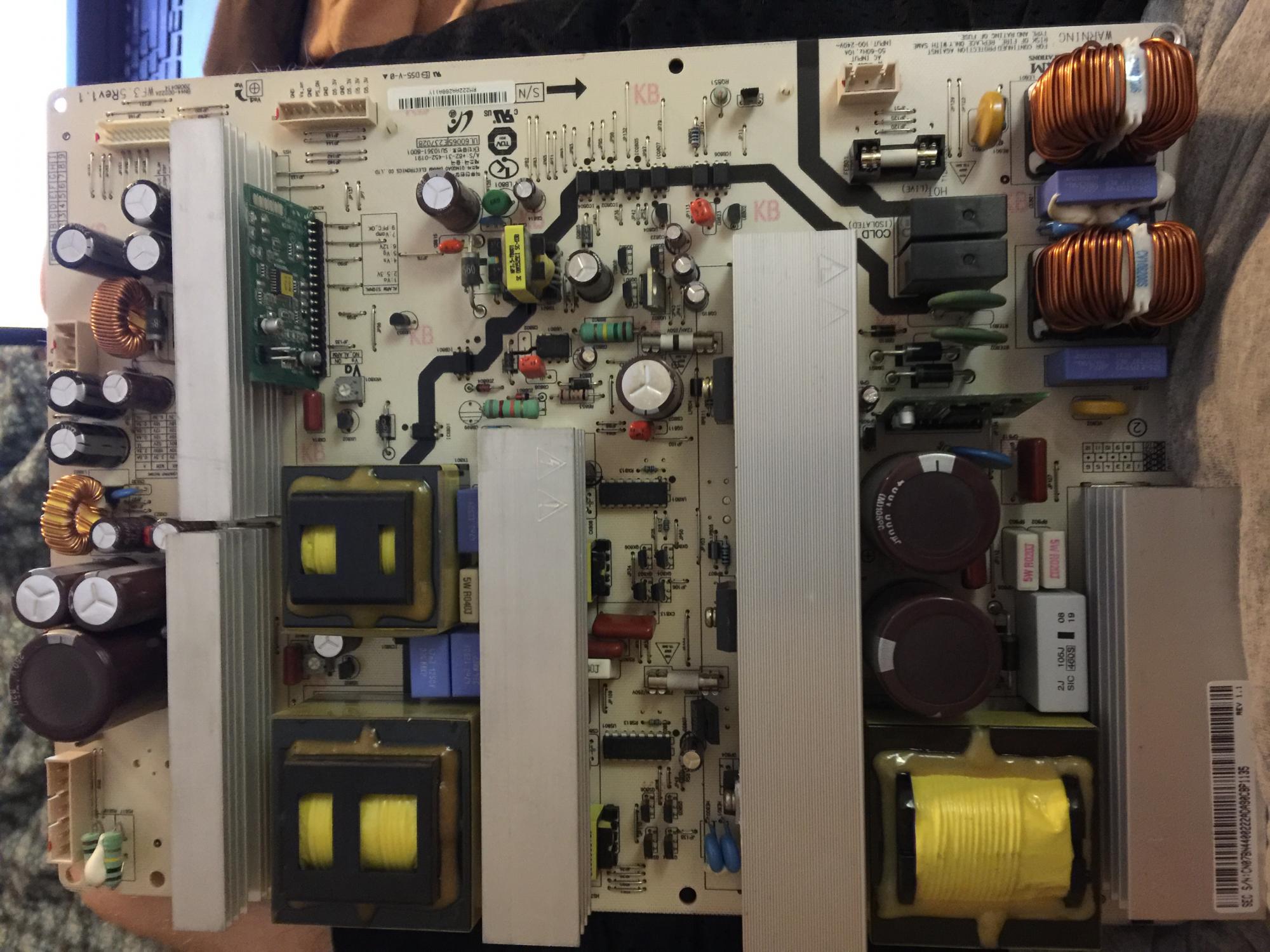 I have a Samsung plasma that powers on with a relay click and powers down. It starts as soon as its plugged in and doesn't stop until I unplug it. I replaced IC101 and C102 on the main board with no change. I can jump PS-ON to GND to keep it from cycling to get voltage readings.