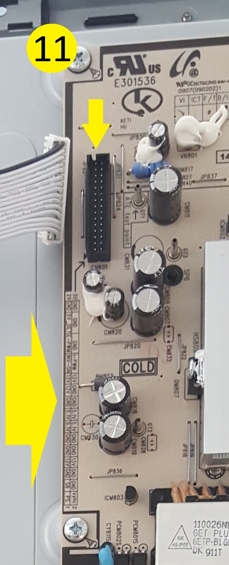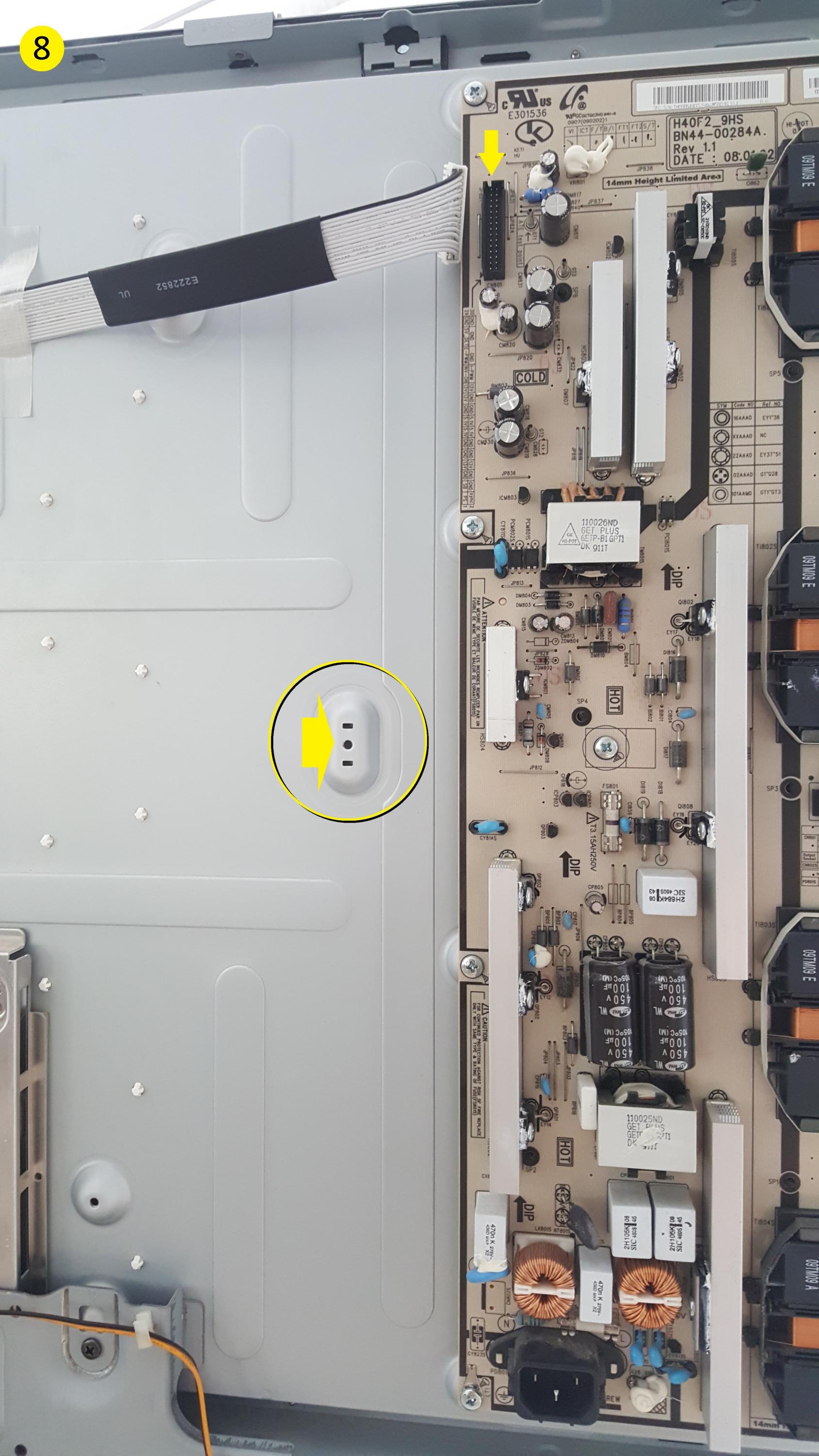 I disconnect the ribbon cable from the power board (PICTURES 8, 8a, 9, 9a, 10) and connected the power cable and BACLIGHT IS ON in the TV.