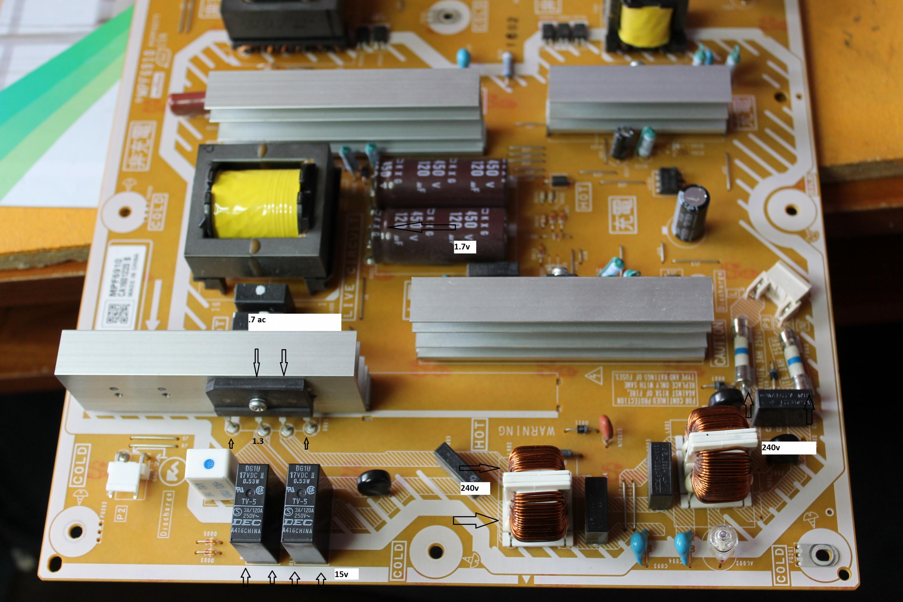 I did not bother isolating the boards as I did not see the point but 337v and that is only present when the relays latch on initial power on and the F15v is generated. If the TV is not turned on from standby then they de energise and the 337V fades.
