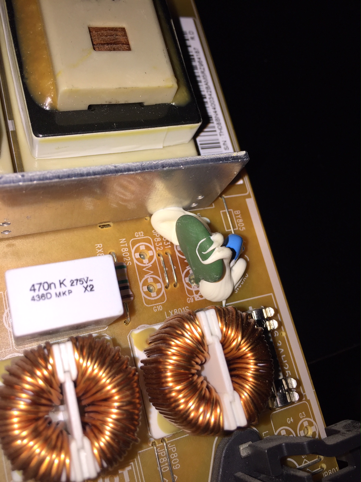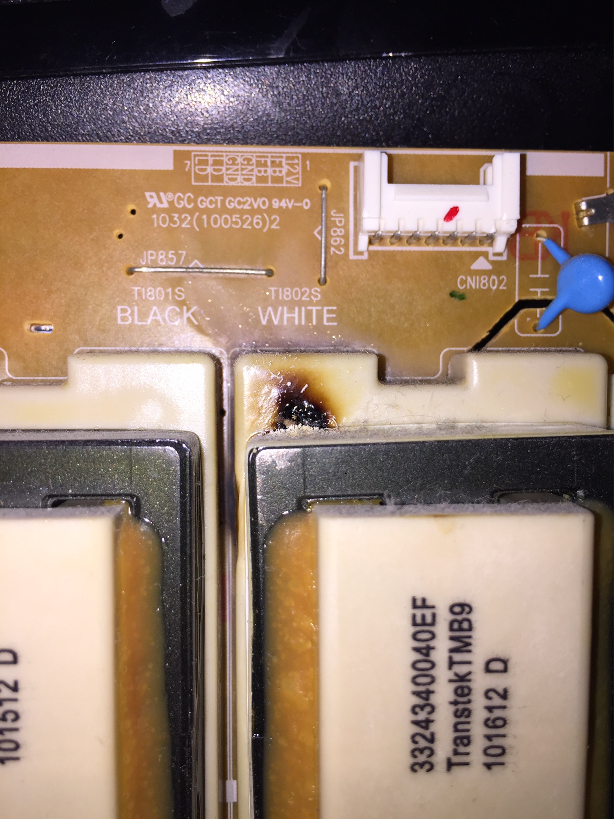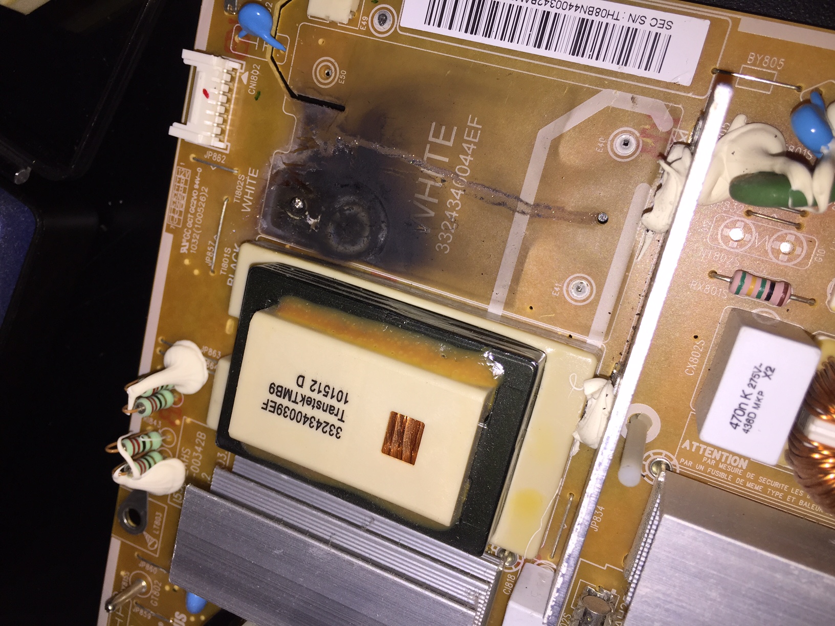 I opened the TV and saw the power supply board with a transformer burnt. Here's the pictures.