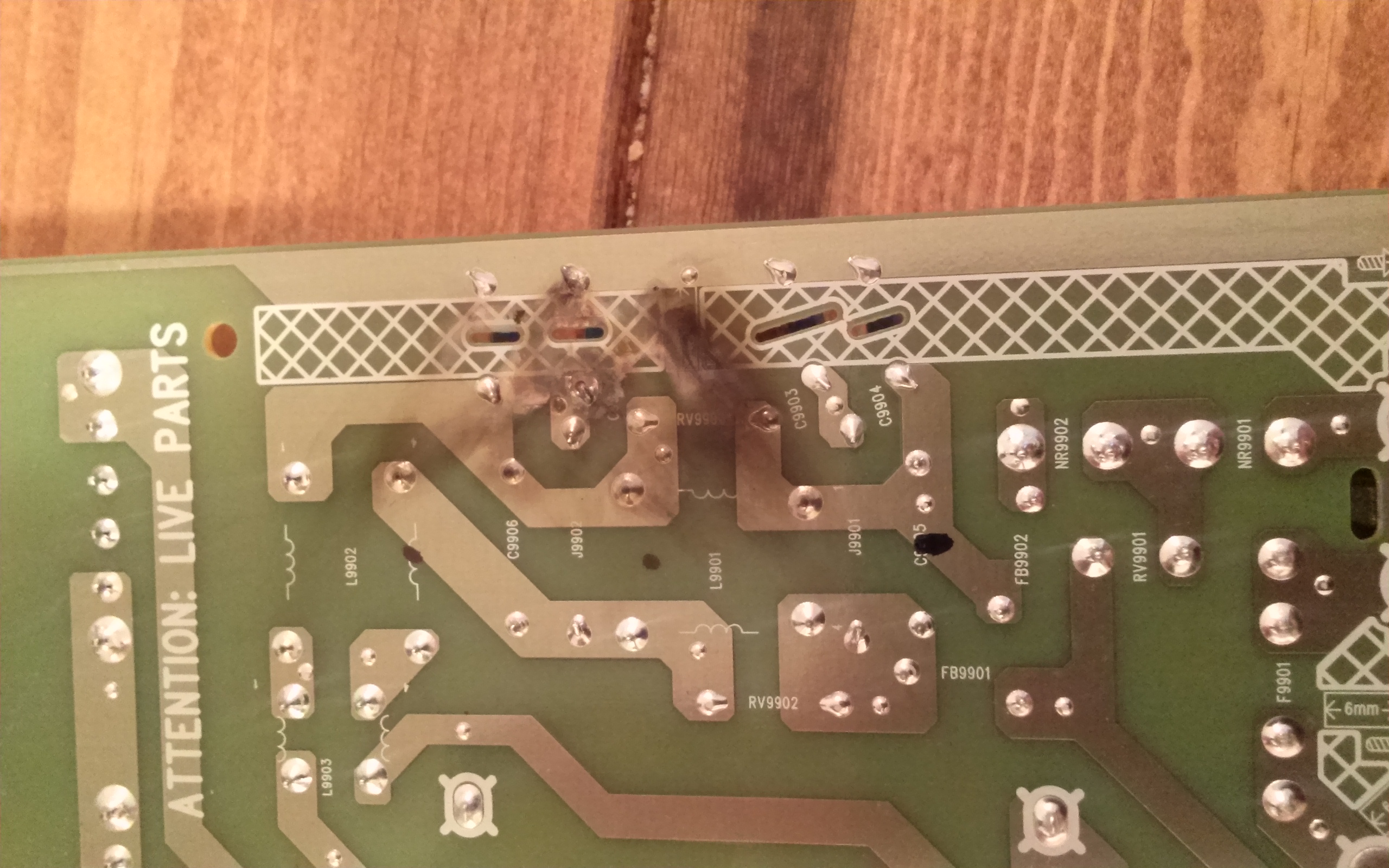 It looks like some one has accidentally touch the trace (HOT) to the chassis GND trace (a piece pf metal, screws?). Those blue caps are not needed for the TV to function.
