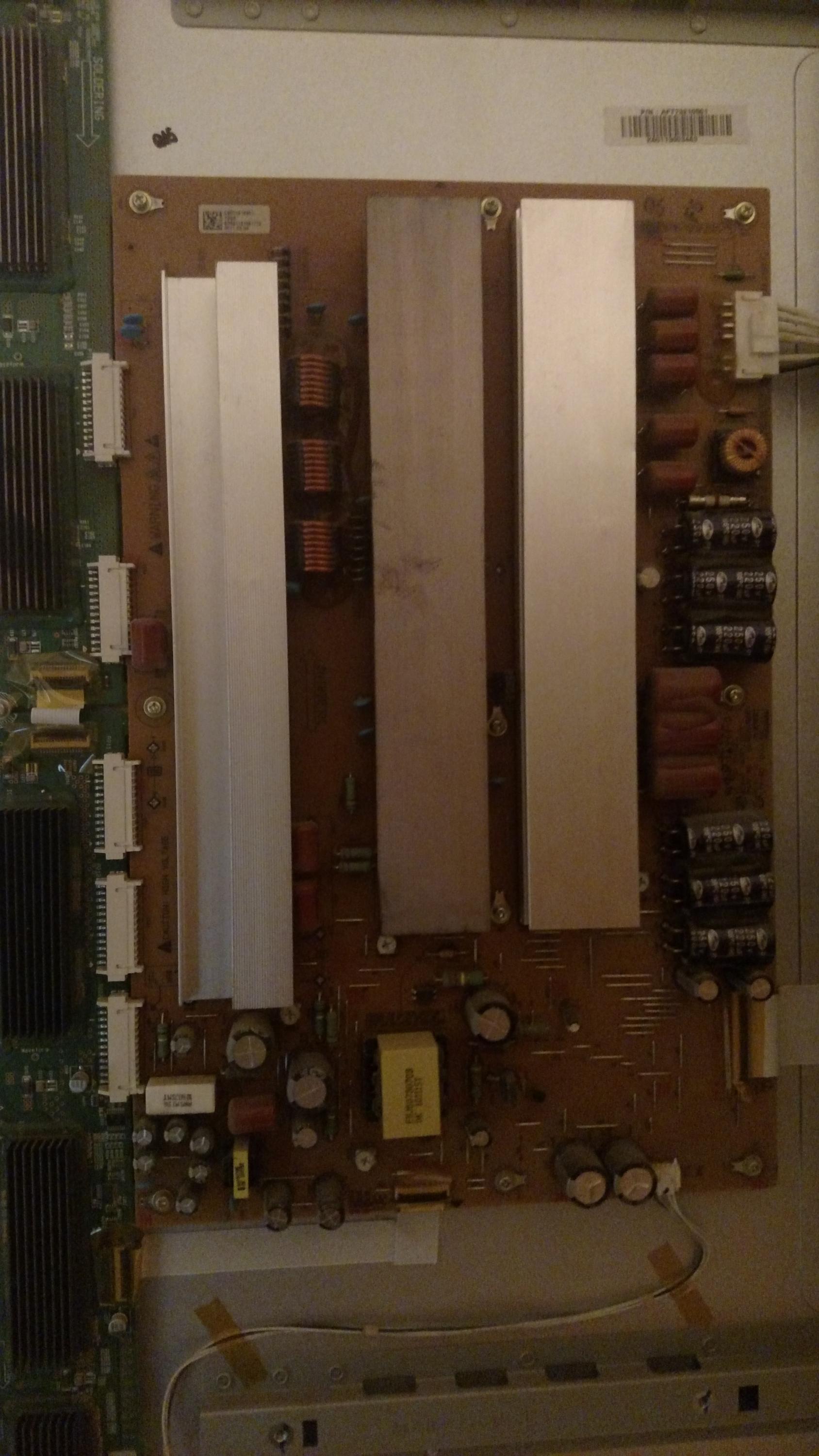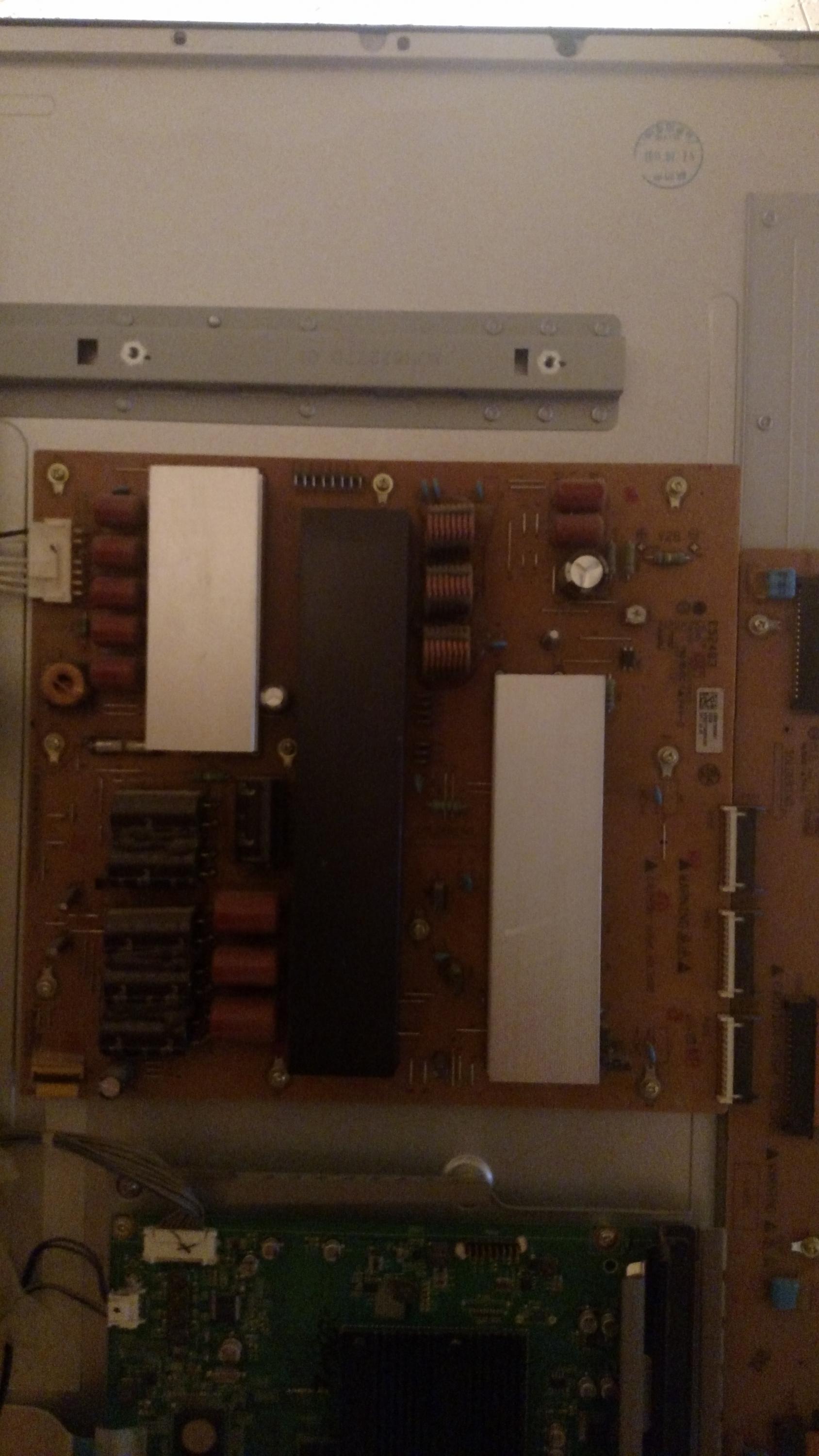 The TV is currently hanging on a wall mount as it was the best location I could test with power, video/audio signal, and leave the TV without risking damage to the glass face. I could not photo the power supply board from this location, if needed I will pull the TV and get this photo.