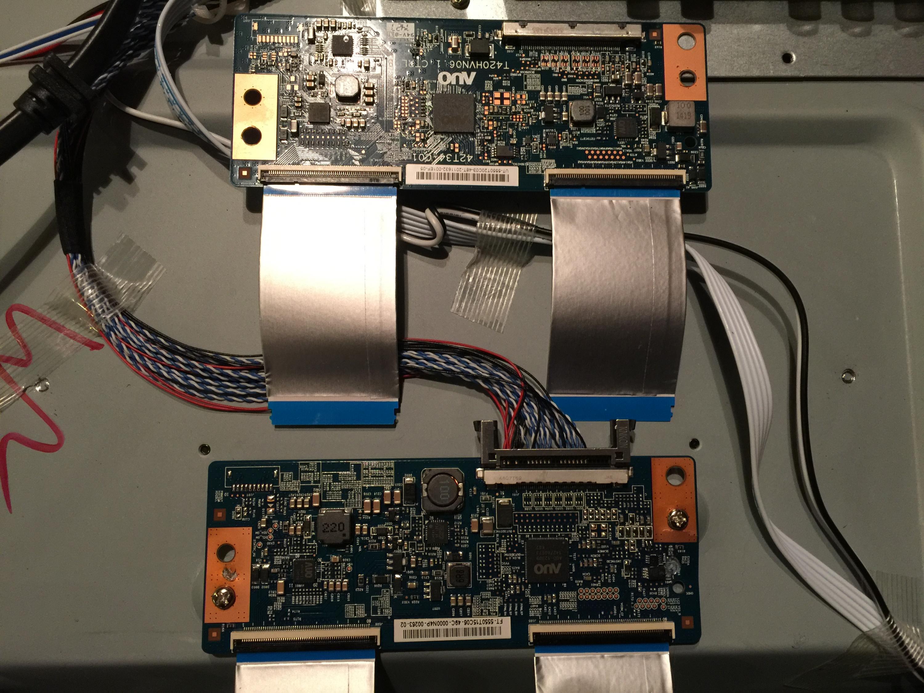 Ok so I disconnected one ribbon of the T conn at a time and no change to screen. The backlights are on and still blank screen with no images. I was confused as to how I go from a white screen to black screen so I hooked up the old T-Con board and disconnected one ribbon at a time and one side goes dark while the other maintains the white screen somewhat. This happened with both ribbons. Attached are pictures of the ribbon removal test of the old T-Con board. I also noticed that the T-Con boards are different in some ways. I attached pictures of them as well. The old T-Con is connected and below the new one I purchased in the kit. Thanks again for any help.Attached Filesif you find these attachements useful please consider making a small donation to the site