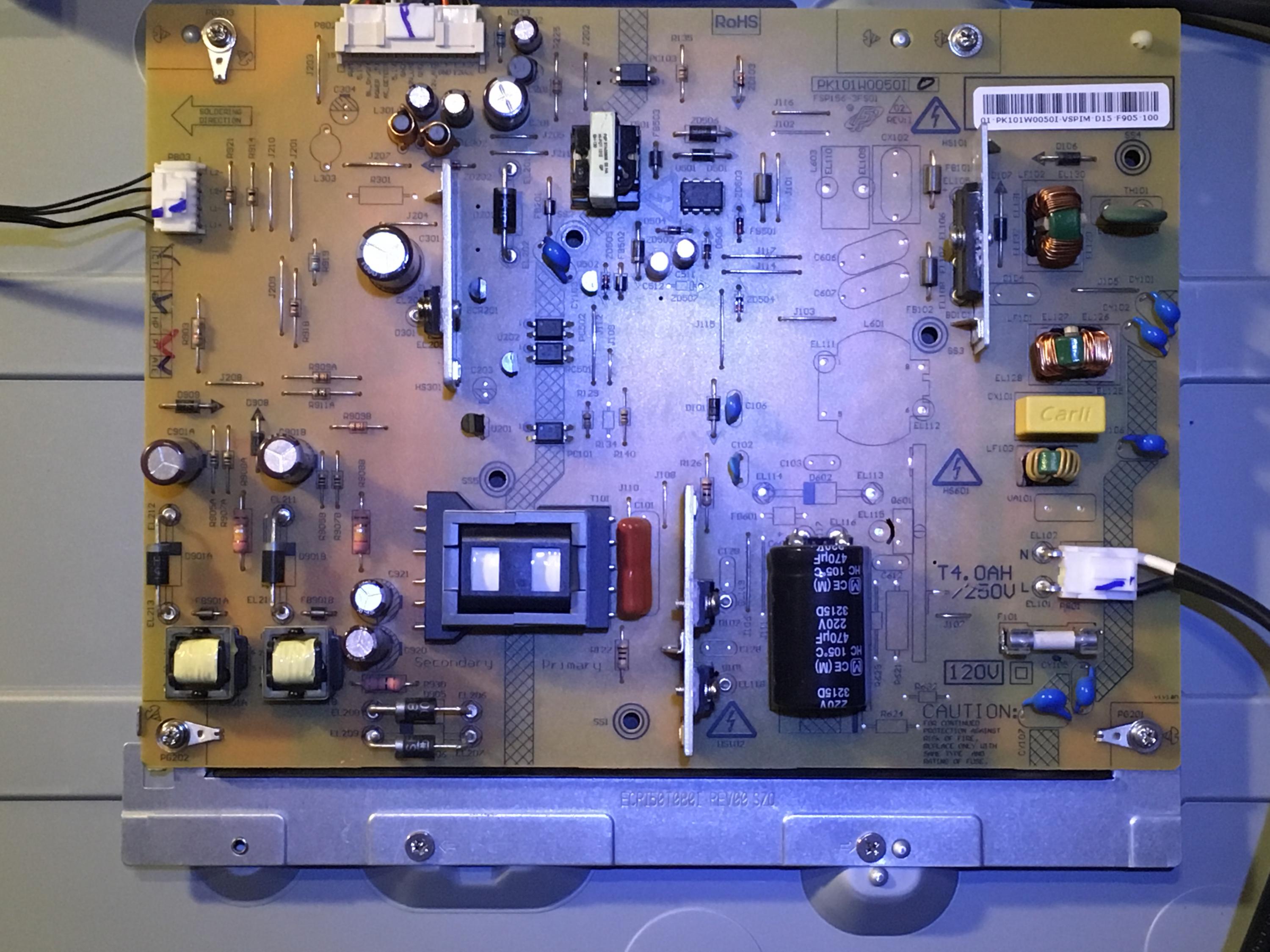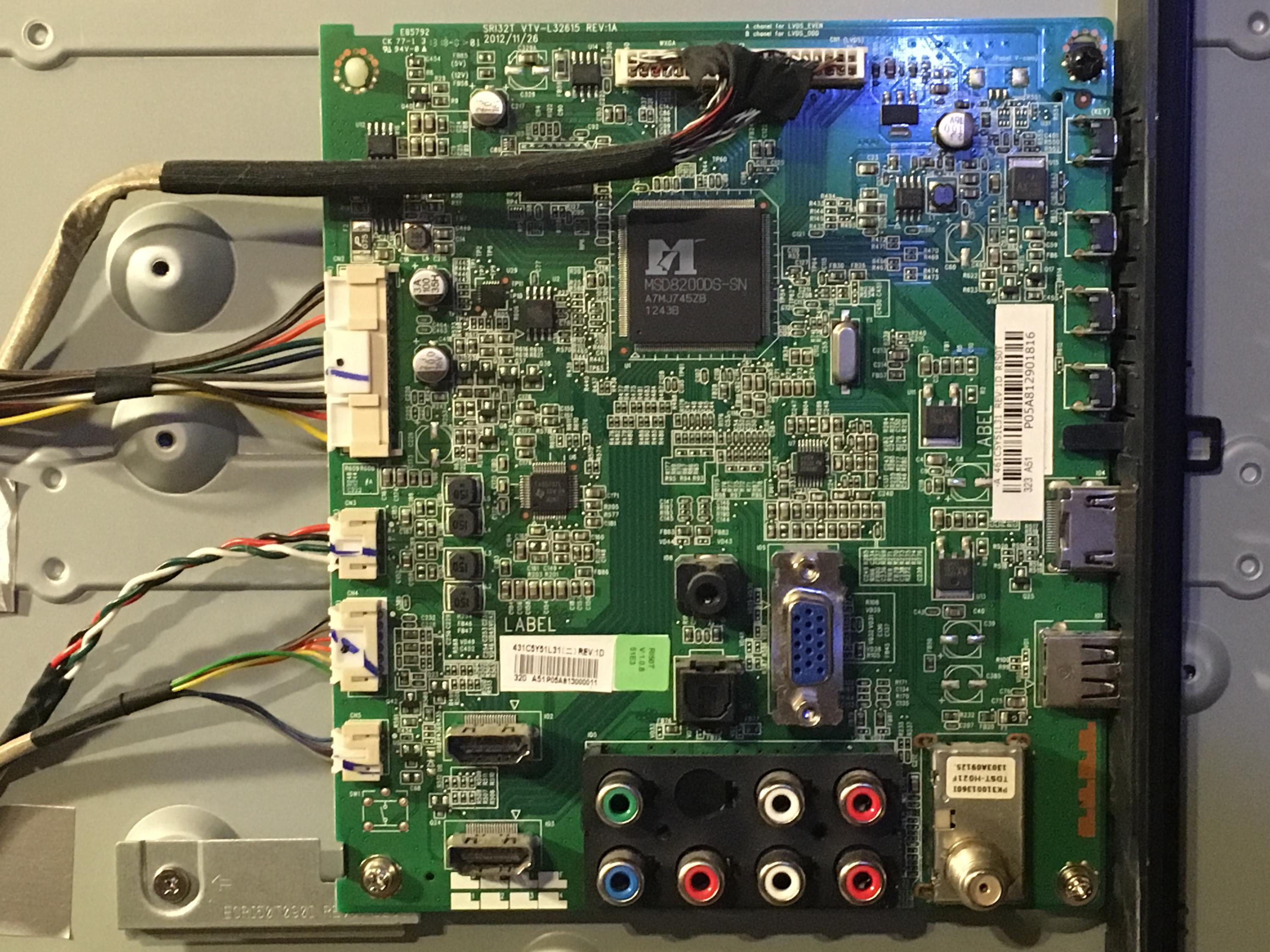 About 4 months ago I went to a friend's house to look at their TV. It was a Toshiba LED model 50L2300U. It had flickering horizontal lines in the bottom quarter of the screen (see attached photos). At the time she did not want to pay to have it repaired so she continued to use it until this week when the screen went black. She purchased another TV and gave me the Toshiba for parts or to fix it if I could.