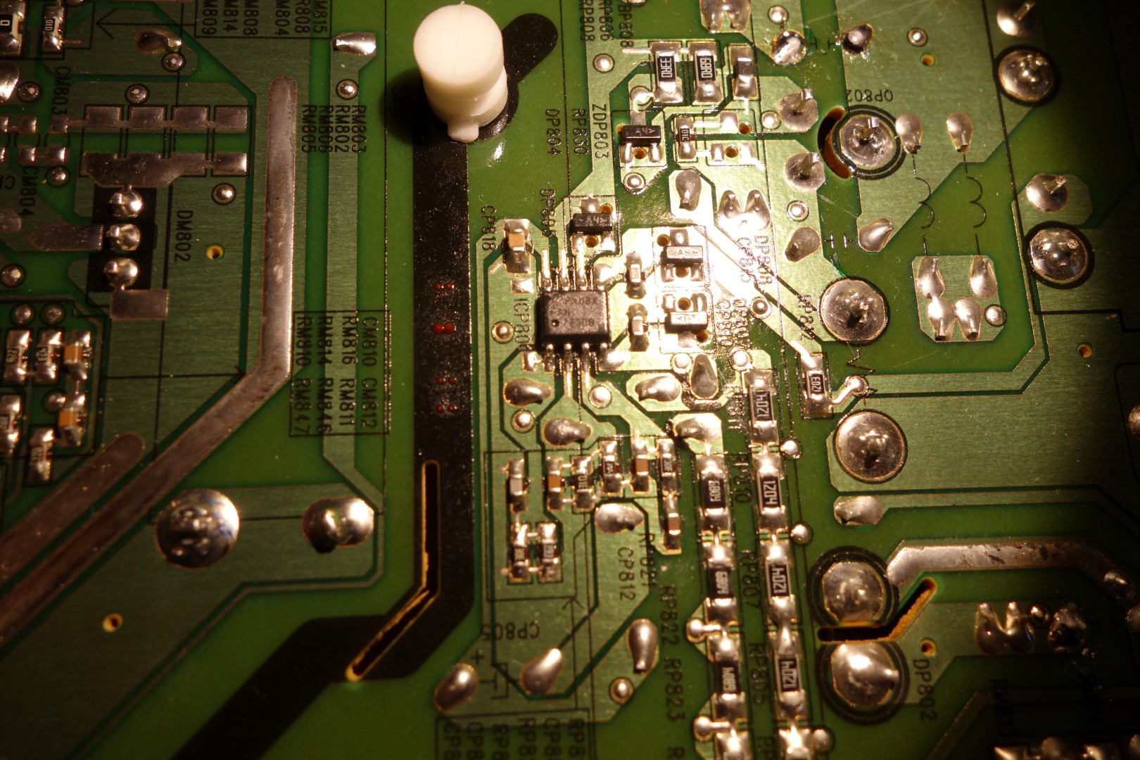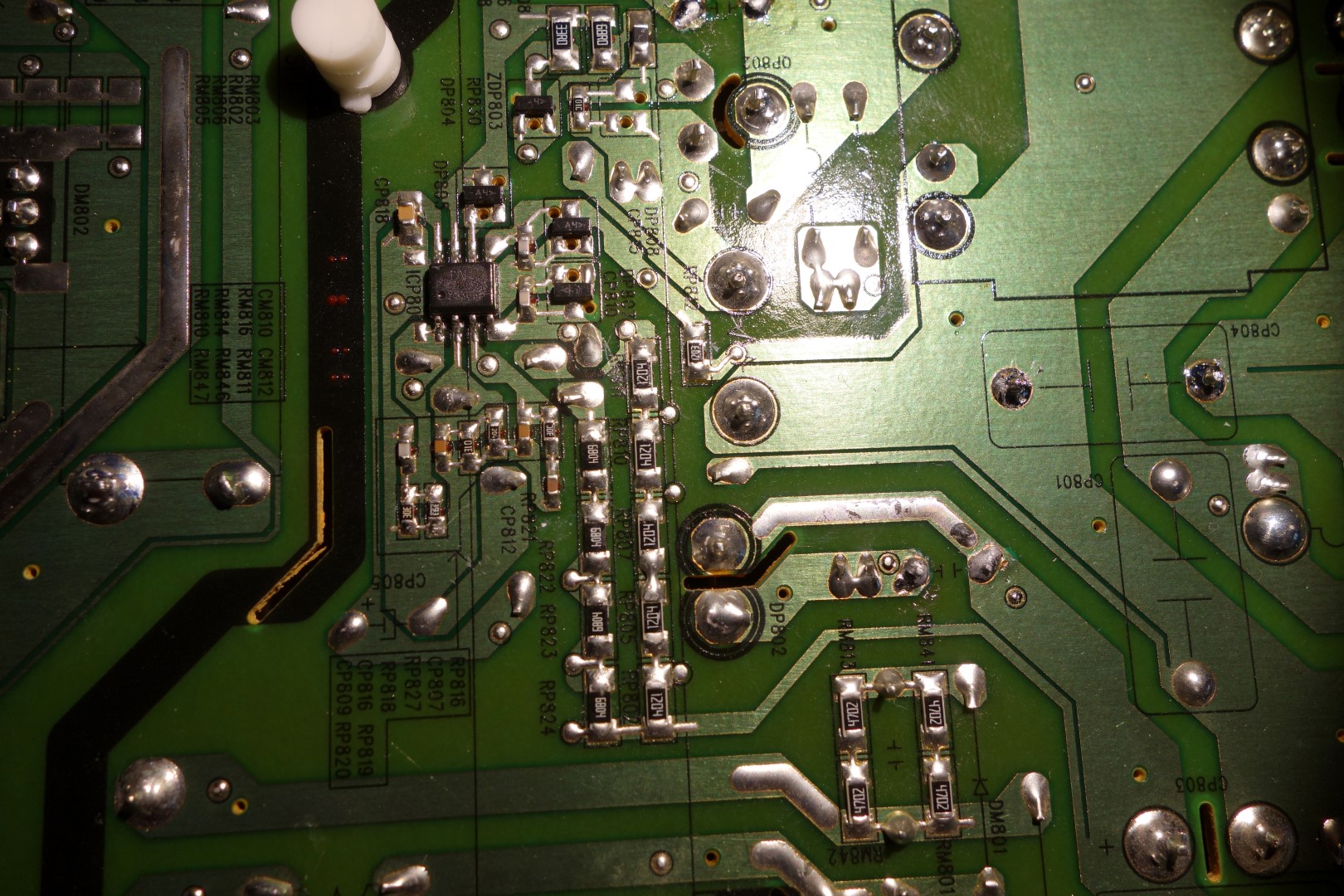 When the TV cold starts, it works mostly fine. I have noted that all backlights are uniformly dimmer towards the middle of the screen. As the TV remains on, the dimmer spot progressively goes away. Right about the same time the backlights are uniformly on throughout, they shut off, about 3 min after cold start. Sound works, picture is there with flashlight test. If I turn the TV off and back on again, backlights stays on for only few seconds and then I am back to sound only, and picture with flashlight only.