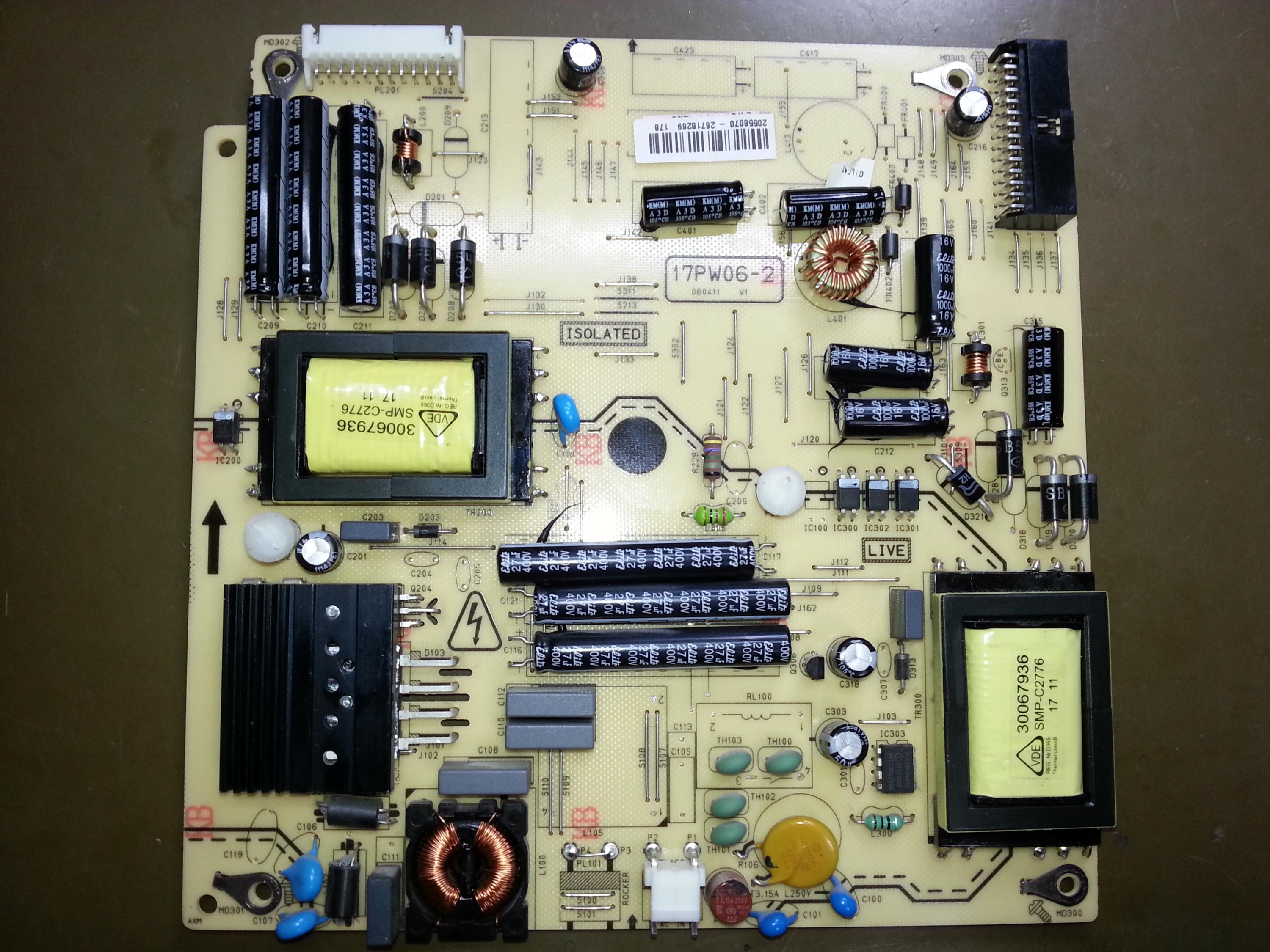 Greetings to all of the wonderful folks here. Hope you can help me with a bit of feedback, like you're always so kind to do, on this Vestel 17PW06-2 power board I'm tinkering with. When I first got this TV, it was completely dead, as not even the standby light would come on. Upon opening it up, the only problem I could spot right away was a shorted diode (D321 to be exact, not sure if you can quite spot all of the labels in the pictures), so I replaced it and now the TV sort-of "wants" to turn on, but doesn't actually do so. What happens is, I plug it in, the power LED now comes on and cycles between orange and blue, indicating the set is powering on and then....nothing: the LED remains blue and that's it - no picture and no backlight. Taking some measurements on the power supply, it looks like I still have a short somewhere, because when the TV is in standby, I read 24v on the 3 caps in the top left of the board (C209-C211), which are part of the LED drive, which is normal, and also 5v and 12v on the respective caps (the horizontal ones, though I can't remember which ones exactly), but after the LED turns blue, the 12v bus drops to around 7v and stays there and the 24 volts also drop (until eventually probably reaching close to 0, since I'm only reading the discharging caps at that point). As far as I know, the LED output should jump to around 100v shortly after startup :|