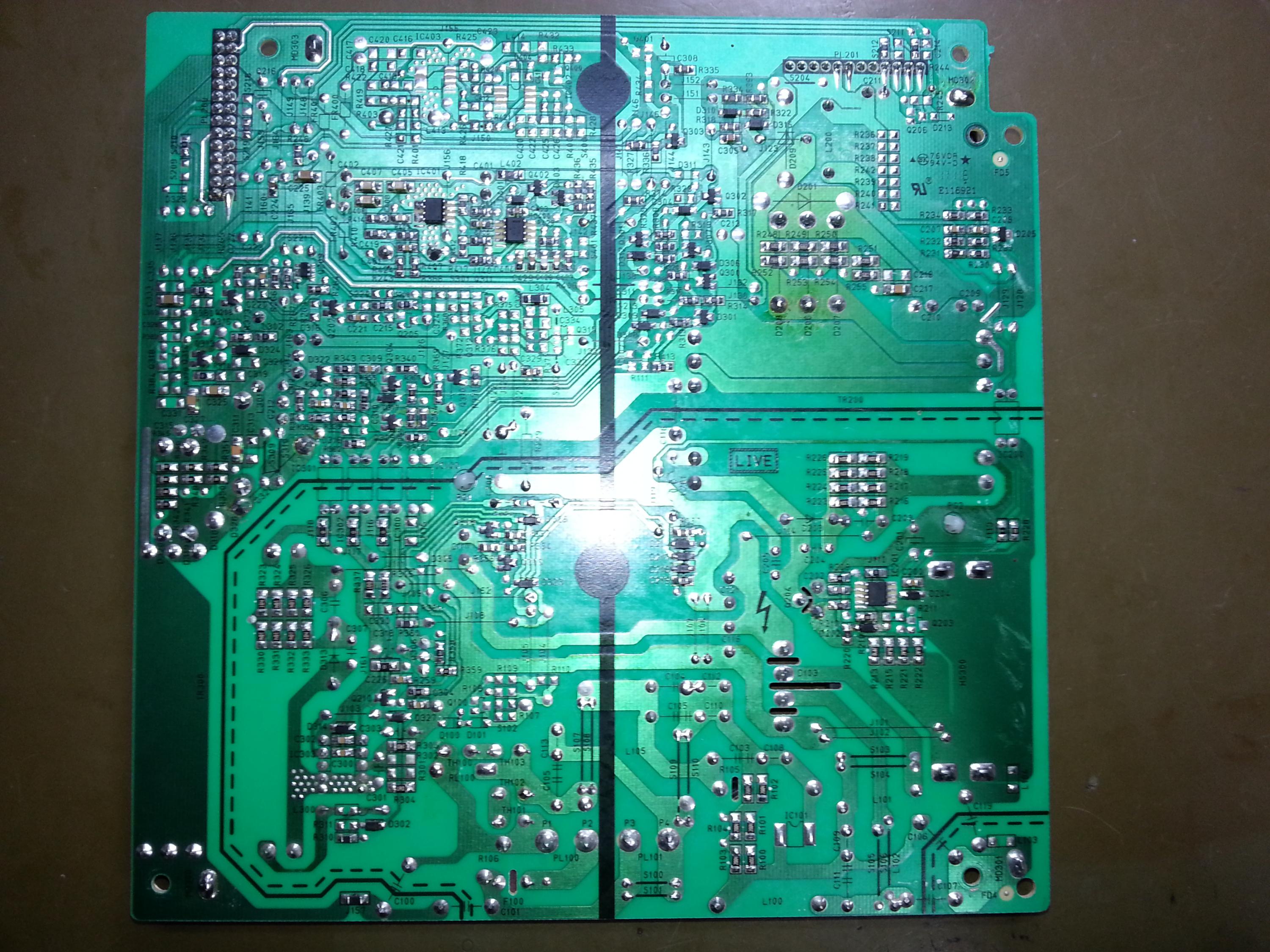 I flipped the board around and on the back I had a look at the two ICs which I pictured sepparately for a better view: the one with the last 4 legs joined together is the one I'm after (IC401). It's a MDS5652 dual transistor and my multimeter reads a short between pin 3 and pins 7-8. The strange part is that pin 3 is the source S of transistor 2 and pins 7-8 are the drains of transistor 1, so is it really possible for the two transistors to become internally "cross-shorted" and cause this "no power up" issue, or am I aiming at the wrong component altogether ? Is there something else I should check ? I've obsiously checked all the discrete components like diodes and trasistors and they seem fine, which is backed up by the fact that in standby I do get correct voltages - it's only when the TV fires up that I get the big voltage drop. I also tried disconnecting the LED connector (PL201 - upper left) but no change. Could it be the main board that's busted ? I'll try powering up just the the power supply and see what happens. Meanwhile, has anybody else faced this issue ? I've read around, but couldn't find an exact answer. Cheers.