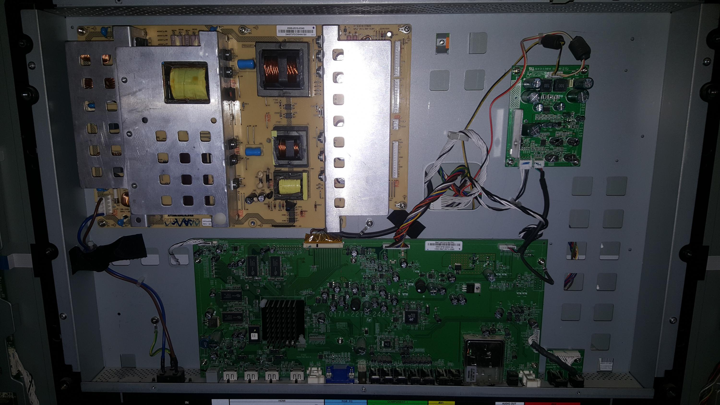 Troubleshooting: I've inspected the PS and found no visible signs of blown caps or damaged components. I've inspected the other boards including the inverter boards and have found nothing visible either. I've disconnected the inverter boards, turned on the TV, and it will do everything mentioned in the symptoms but all within 1 second. I've checked the voltage on the 24v rails and 5vsb and all read 0v. My reference on the cold side was a chassis ground.