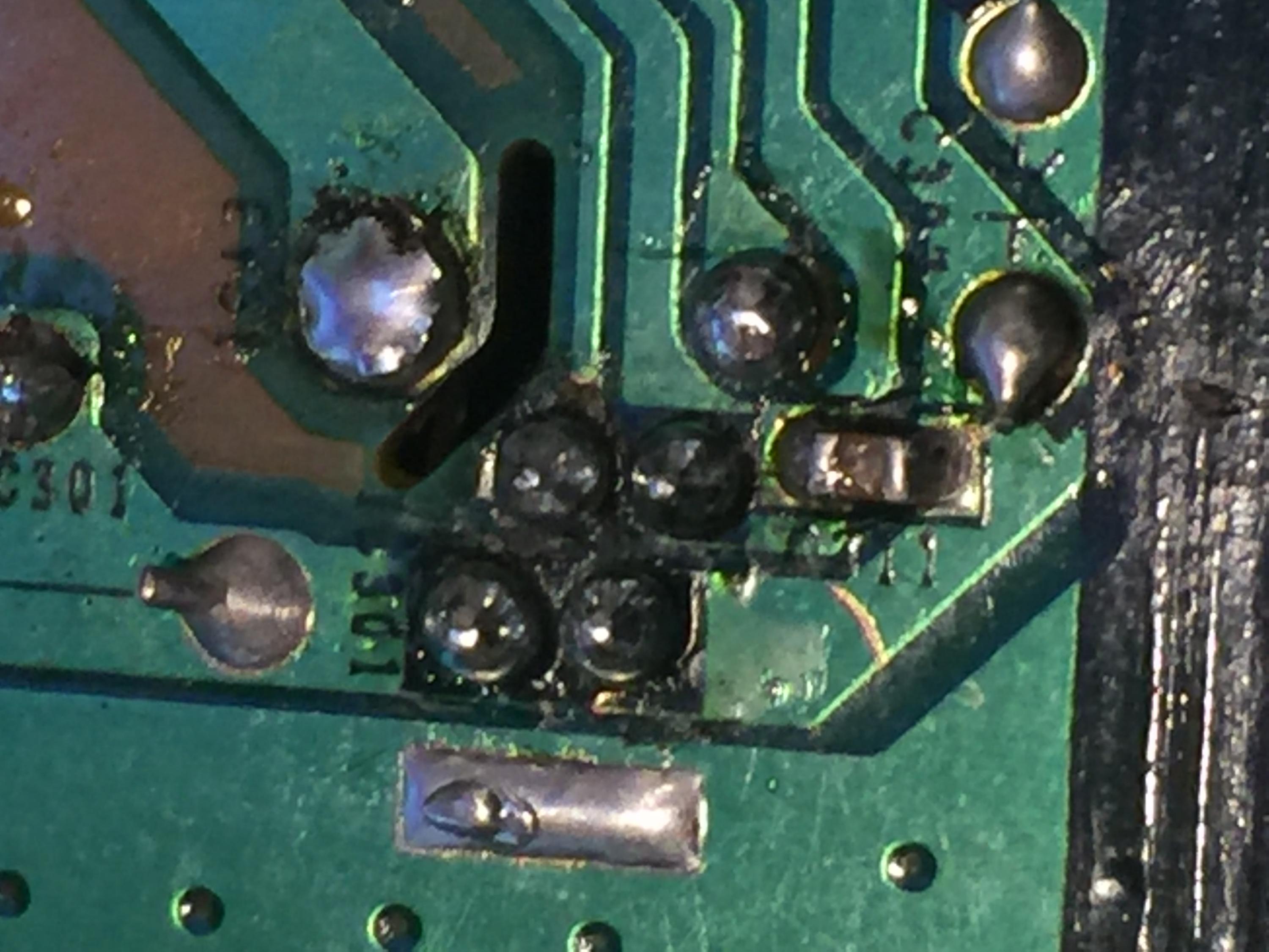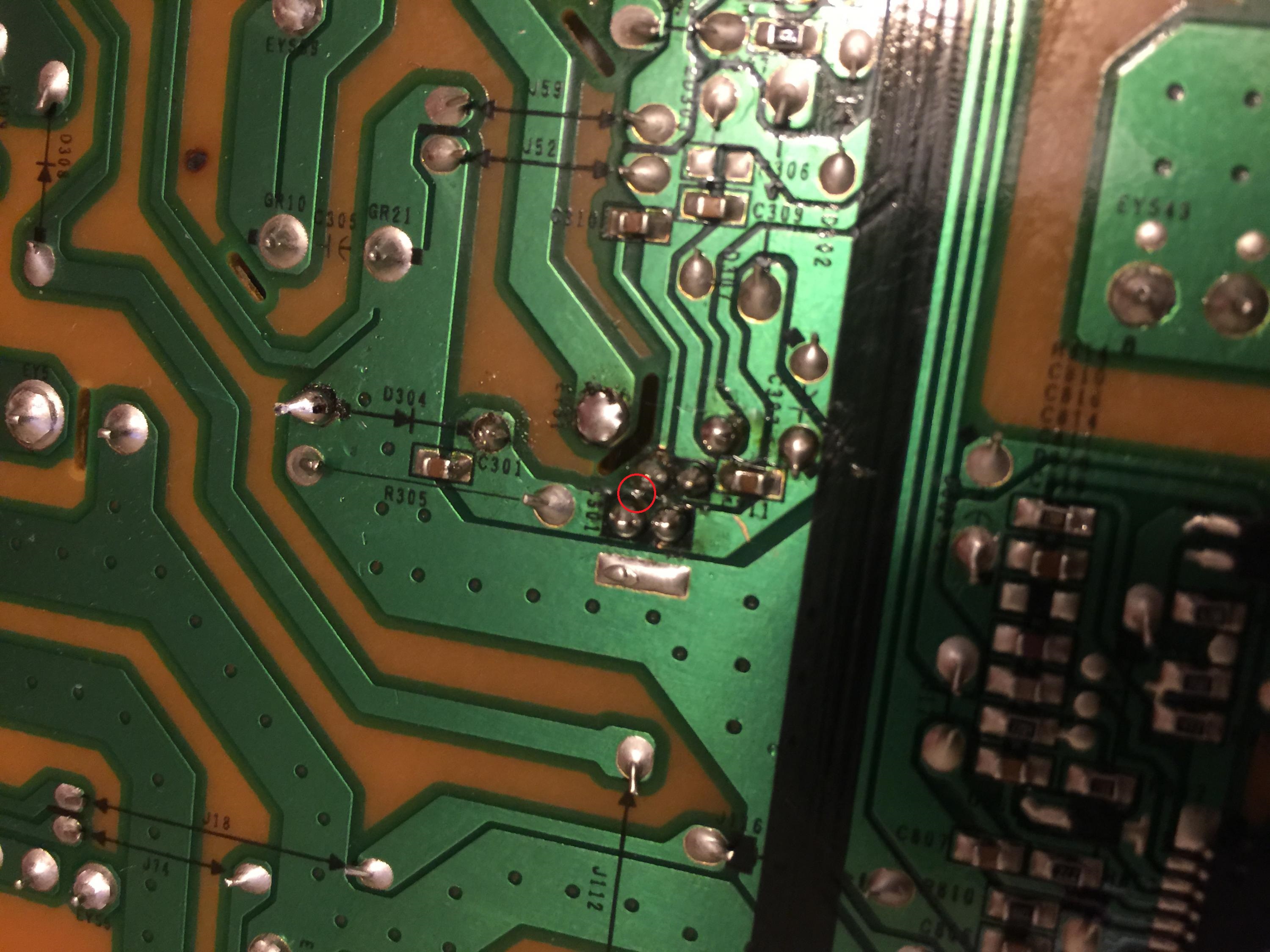 I assume I damaged something there. I removed the solder and looked and resoldered but not really knowing much about printed boards I'm not sure what damage to look for. I'm sure I fumbled up something replacing that IC301.