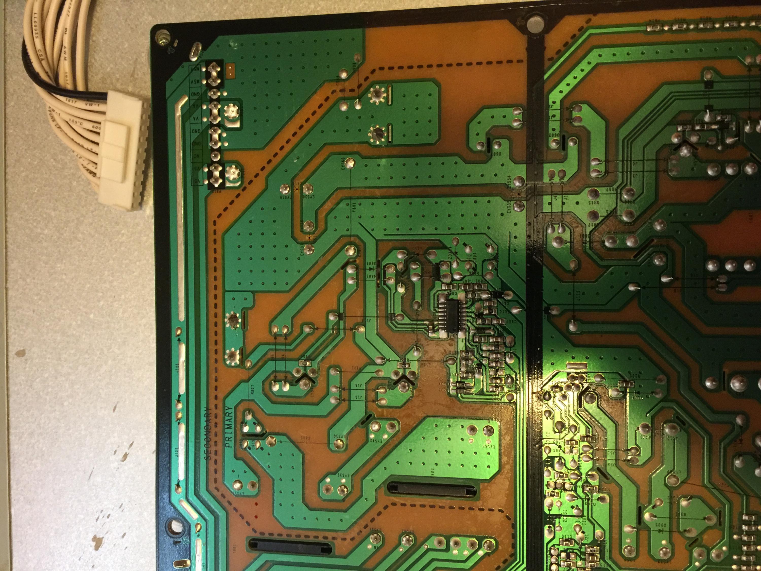The TV clicks when trying to power on. The screen will flash gray a couple times then the set shuts down. I've unplugged both y and z boards and turned on the TV to only exhibit the same behavior. I've checked all capacitors for failure and there is none visible. I've checked the 3 white resistors in the upper right of the board and they all measure 10.4 ohms stable. I have also removed the board to check for broken solder points and nothing jumped out at me there either.