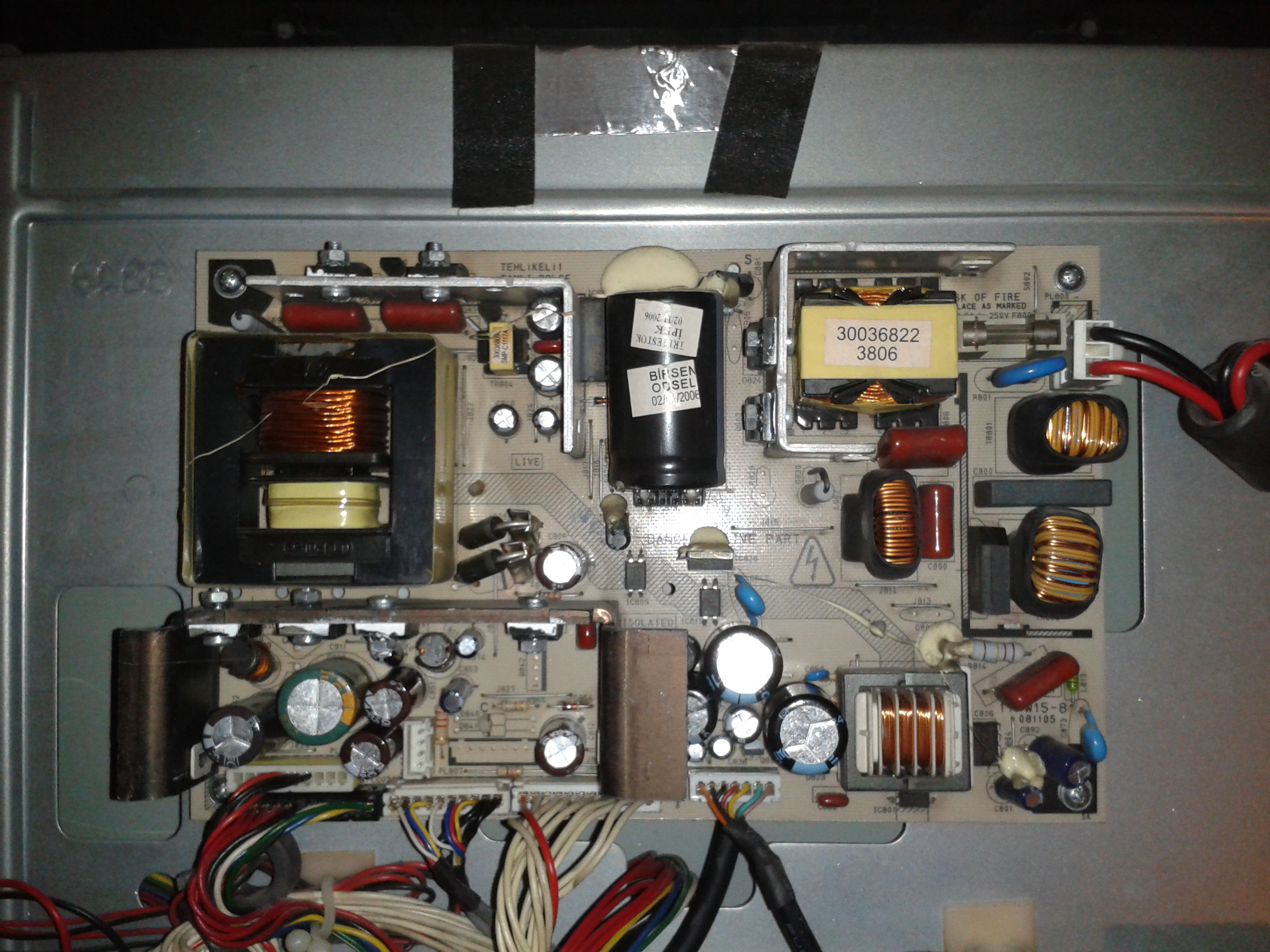 I am currently trying to repair a Grundig Vision 9 37 9880 T USB LCD TV for a friend that has a weird audio problem. Basically everything works fine except for the heavily distorted sound when the Subwoofer module is connected and there is a buzzing sound coming from the PSU PCB.