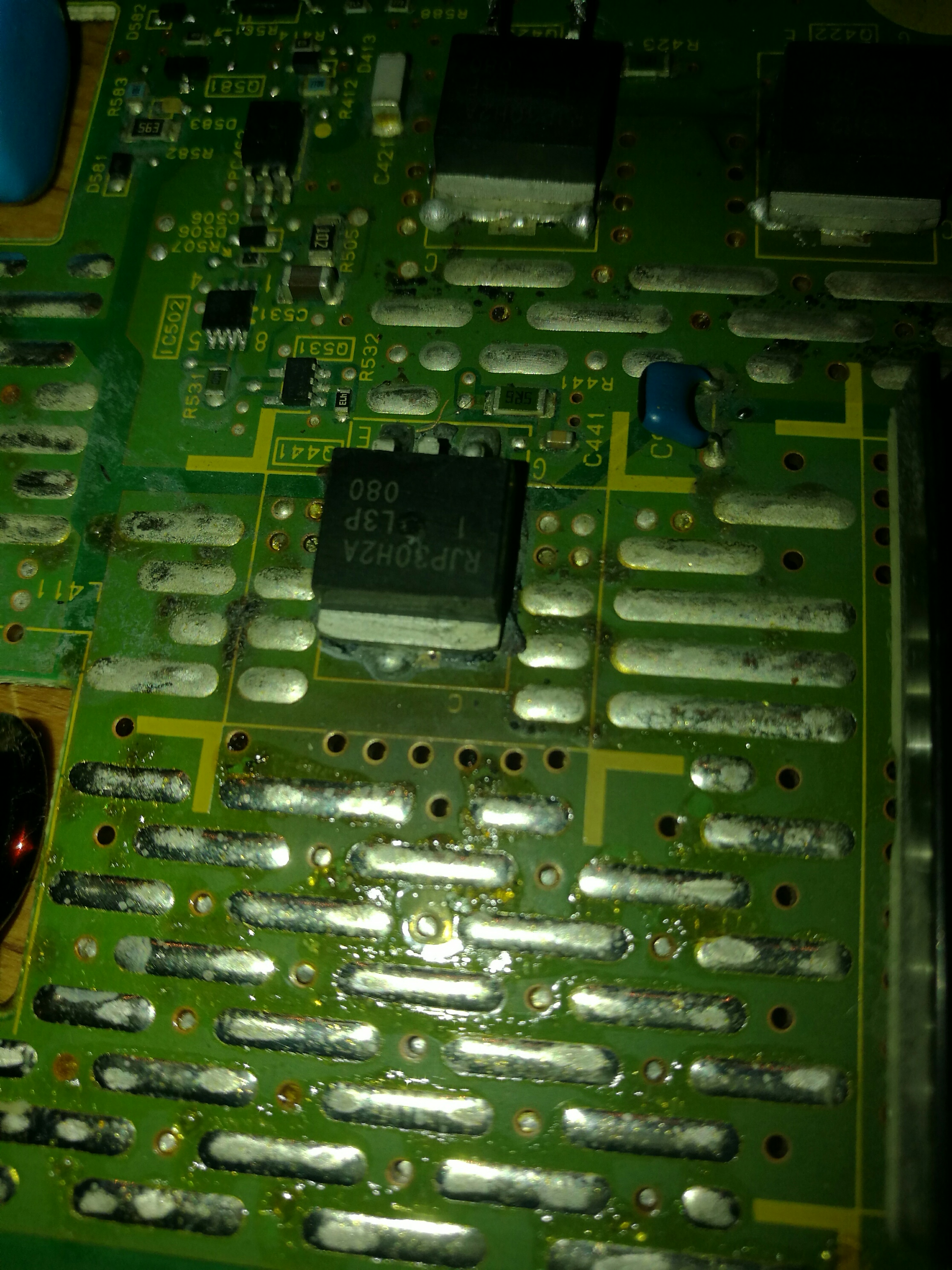 " but i was wrong. Over the last year i got more damaged boards then working boards. Not because of my soldering or knowledge but because of FAKE parts. Fake 30F131 , RJP30H2A , DG302 and RF1501 blew most of the boards. On the pictures you will see boards that i received from people that tried to repair the 7 blink problem. Not only you will see "bad" soldering by those people but also fake parts and the results. Fake parts + not cleaning the board will result in blowing diodes/fets and fire!