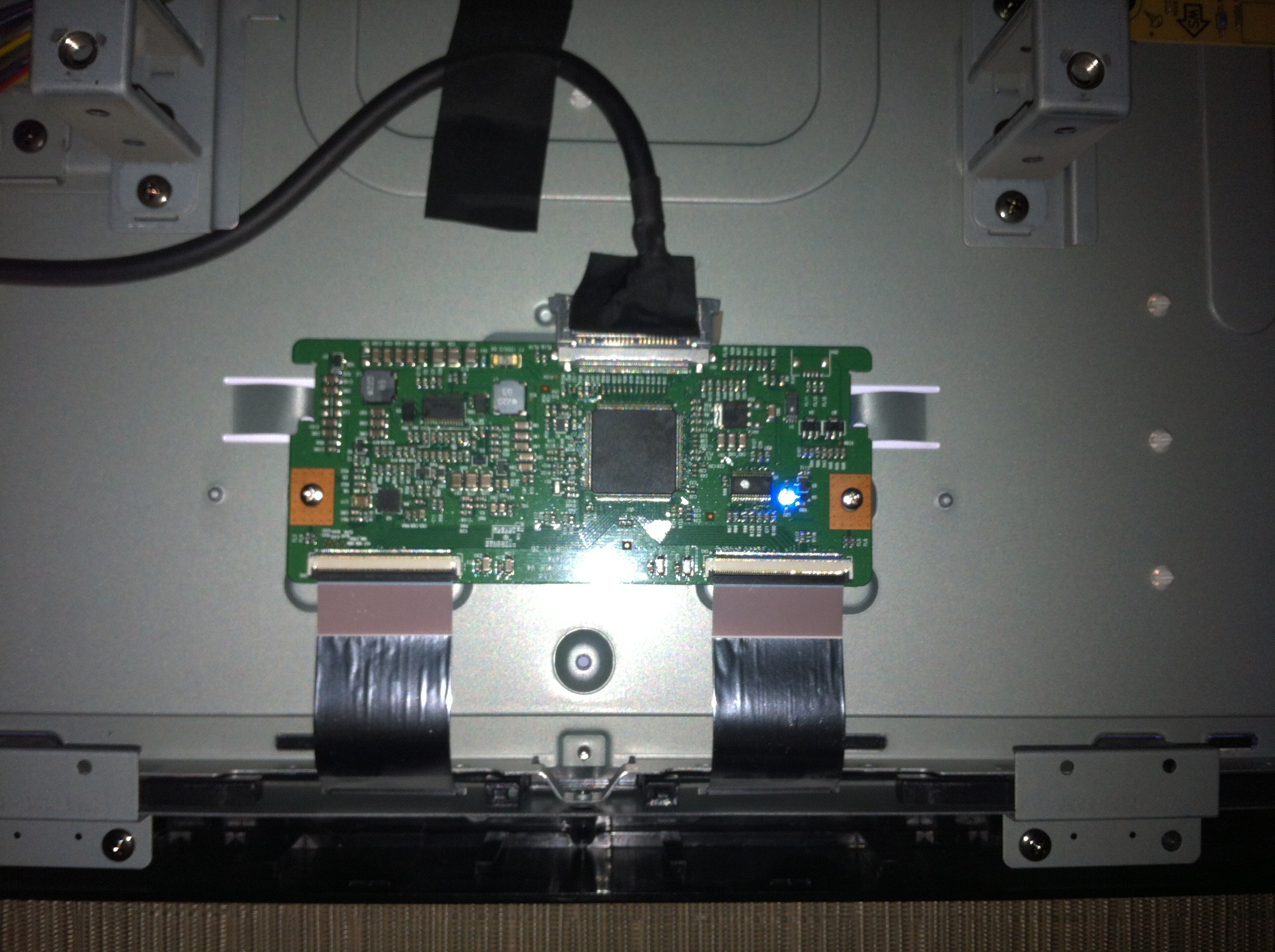 I pulled the connectors for the T-CON board. When I pull one connector from T-CON the corresponding side of the screen goes blank, vise versa for the other connector. When I pull the connector feeding the T-Con the whole screen does blank...