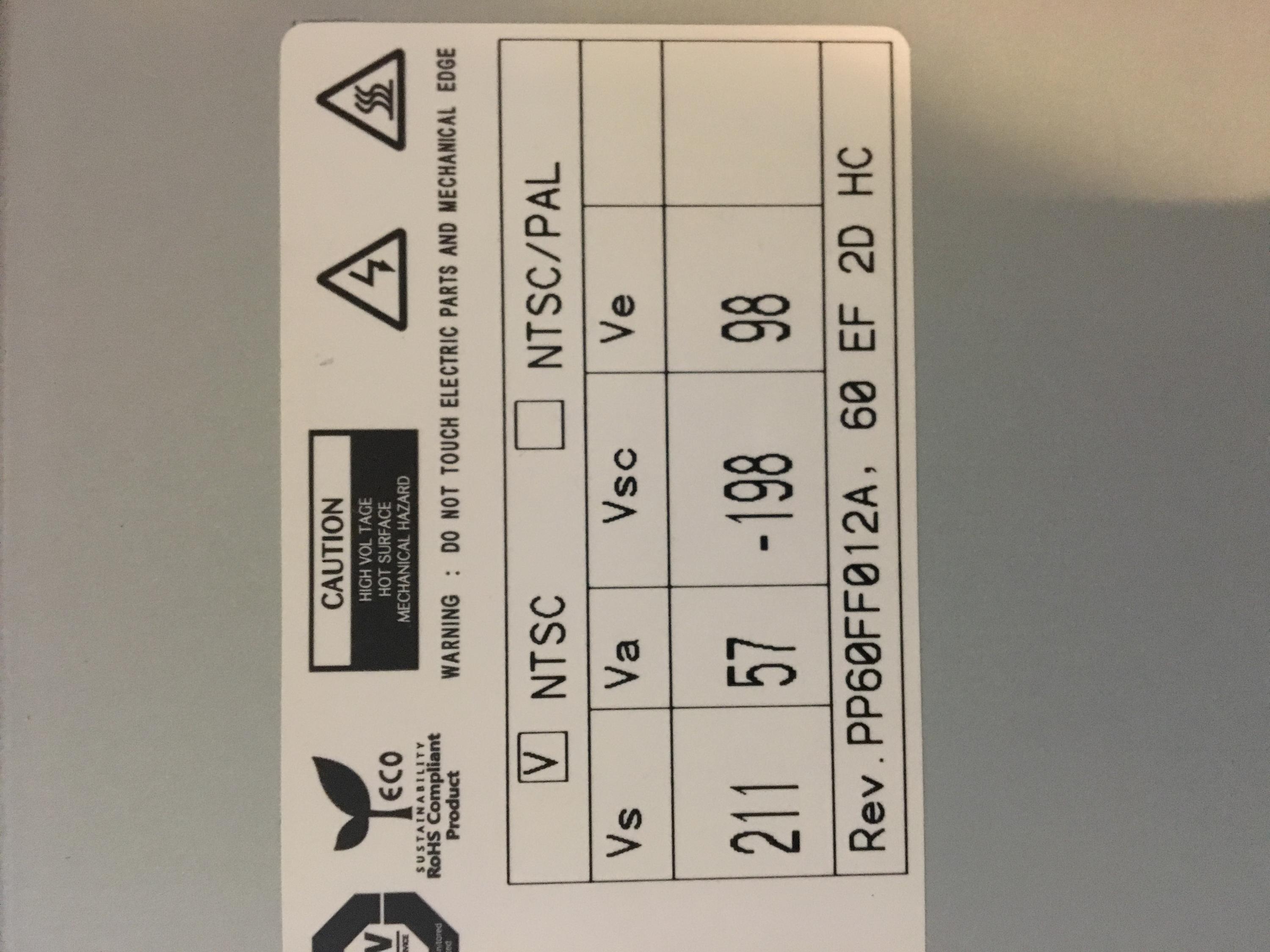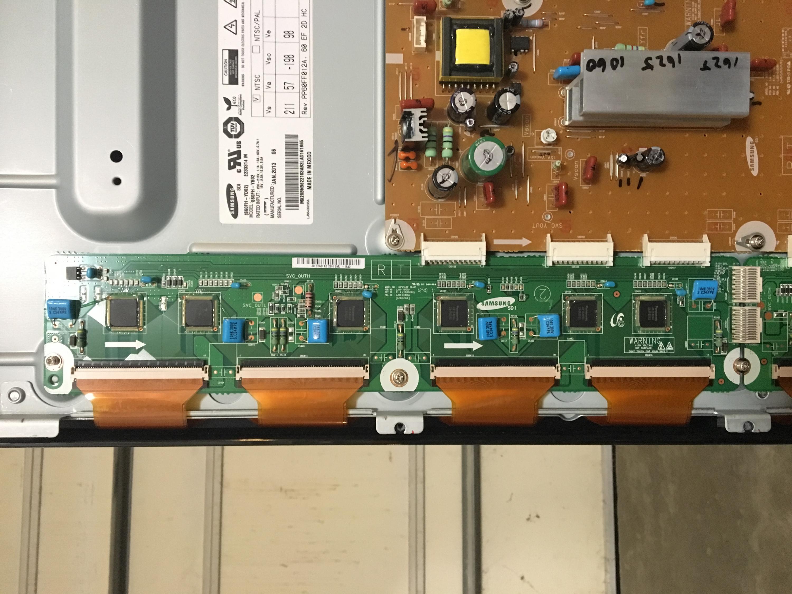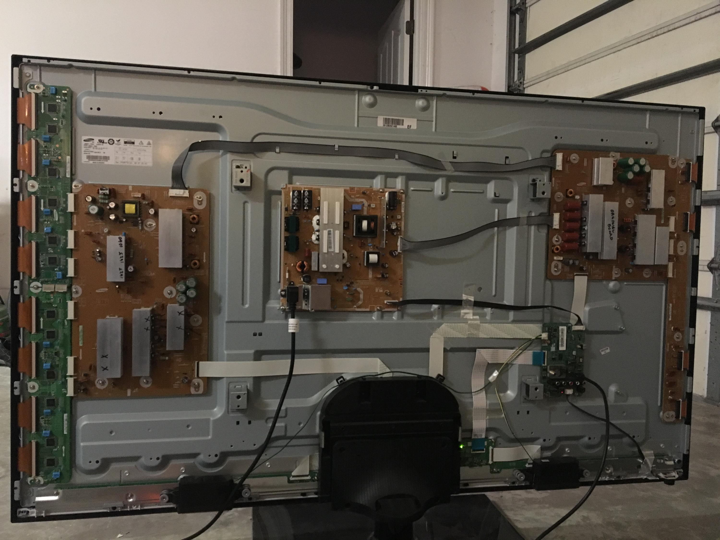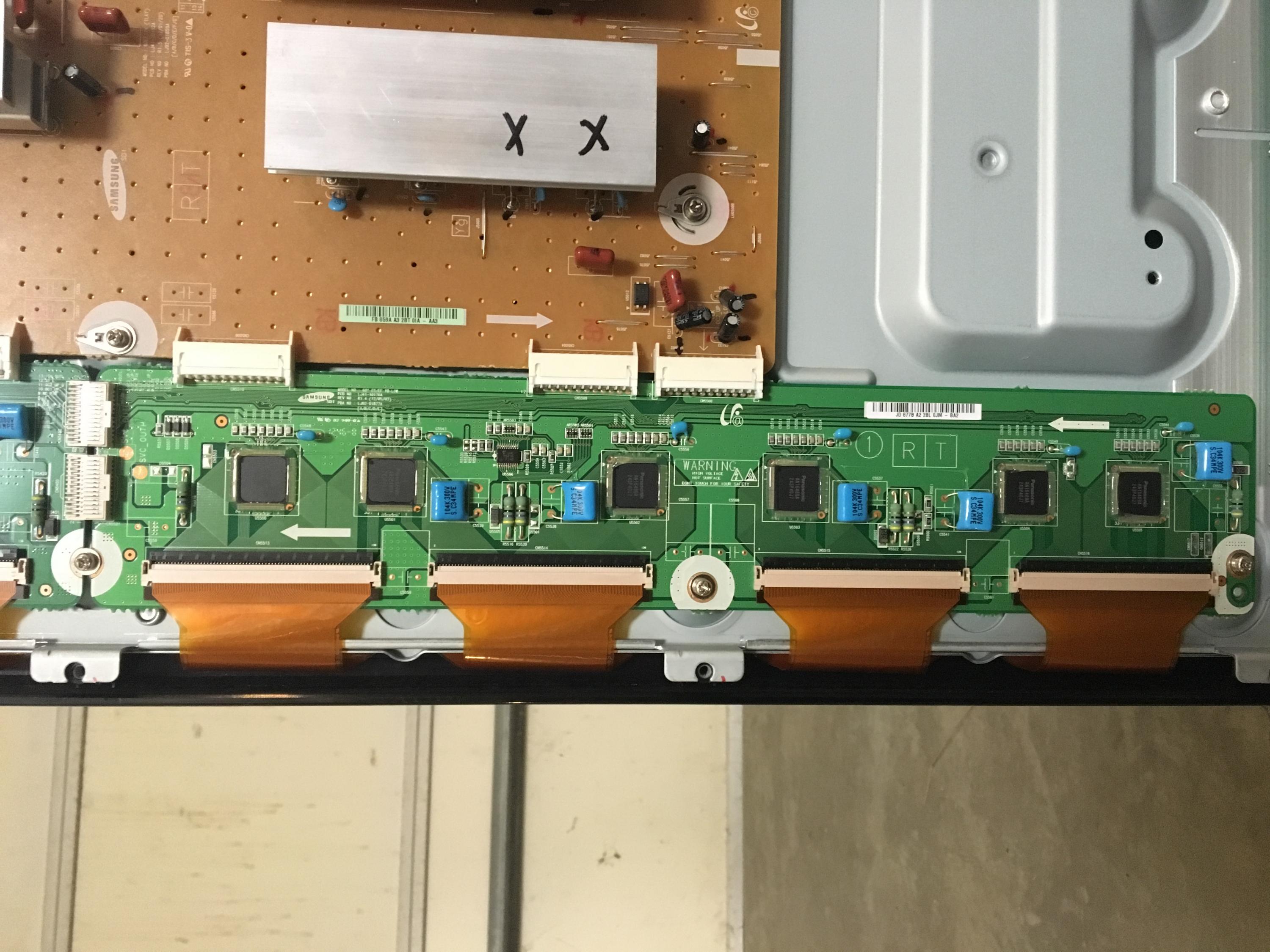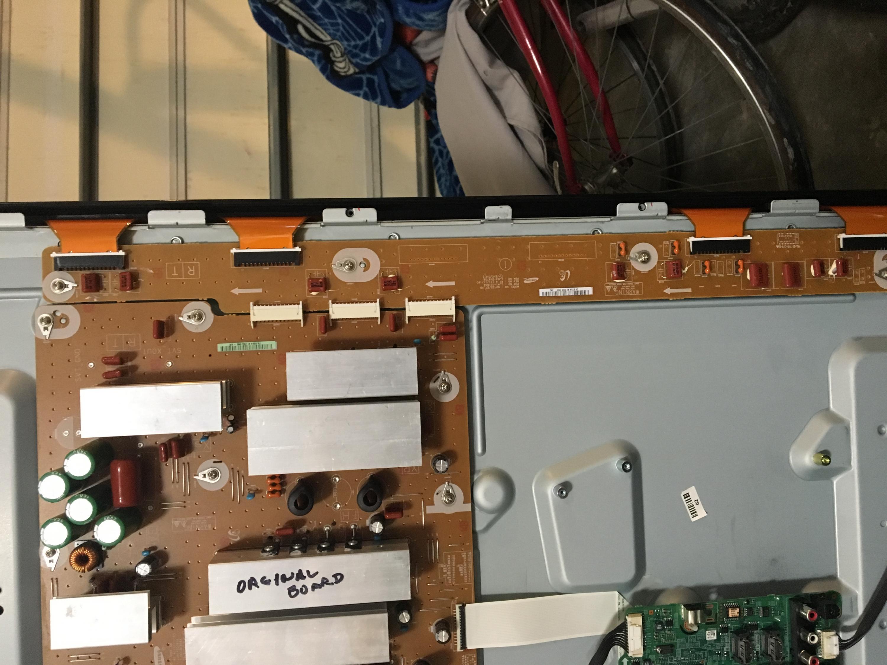This TV was given to me by my father. He said that the TV just wouldn't turn on one day. Didn't want to spend the money fixing it and bought a new TV. It had a great picture when working and thought I could learn something along the way by trying to repair it. After doing a great deal of research on this fantastic forum thought I would give it a go. I noticed that when I tried to power the tv on that it had sound but no picture. I disconnected the Y-main connector and ribbon cable and when I powered the TV on I got the Va, Vs and the Ve to remain steady. Vs was 211v, Va was 57v and Ve was around 15.5v and got the led to blink every second. I replaced the IC on the Y-main at location U5014. P/n 3BR0665JZ and the three small blue caps marked 106 at location c5046, c5160 and c5162 that were on either side of the IC I replaced. I saw that on previous posts that had fixed this no picture but sound issue. The Vs, Va, Vsc and Ve all came up to spec and then dropped off. From what I have read the ERC is still detecting a fault. Noticed that the light was two seconds on and maybe five seconds off. So I thought I would go ahead and replace all the small blue caps marked 106 with new electrolytic 10uf 50v caps except one in the middle of the board that I couldn't determine which way the negitive should go. After pulling each one off and replacing it I found one that I couldn't get a capacitance reading with my multimeter. I replaced the center blue cap with the highest capacitance reading out of all of them. It read 9.38uf. Put the Y-main back in and the thing powered up and got a picture but had the reddish/ sparkle issue. Found my Vs and Ve were a little off so I adjusted them to within .2 volts as you had recommended in the stickie on troubleshooting plasma tvs. No help. Thought maybe what had affected the Y-main may have caused an issue with the X-main. I know this is the shotgun method but I replaced it with a know good X-main from shopjimmy but still had the same issue. The voltages are all with .1 of the label. I'm at a loss and need some guidance. Sorry for the rambling I just wanted to give you all the info.