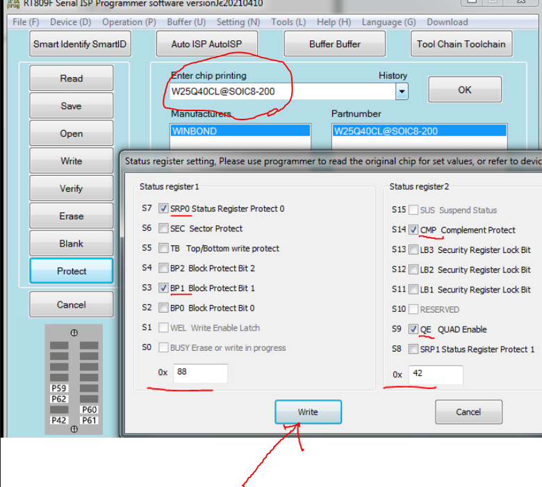 No when i writed firmware i have not setted register o 25q40 and 25q80. Now i rewrited firmware on 25q40 and setted register such as yours image. 25Q80 required same setting status register?