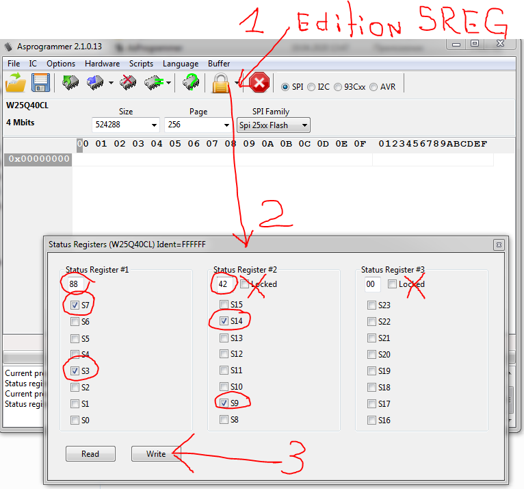 4. Set the status register (0x88, 0x42), check the boxes and click "Write"