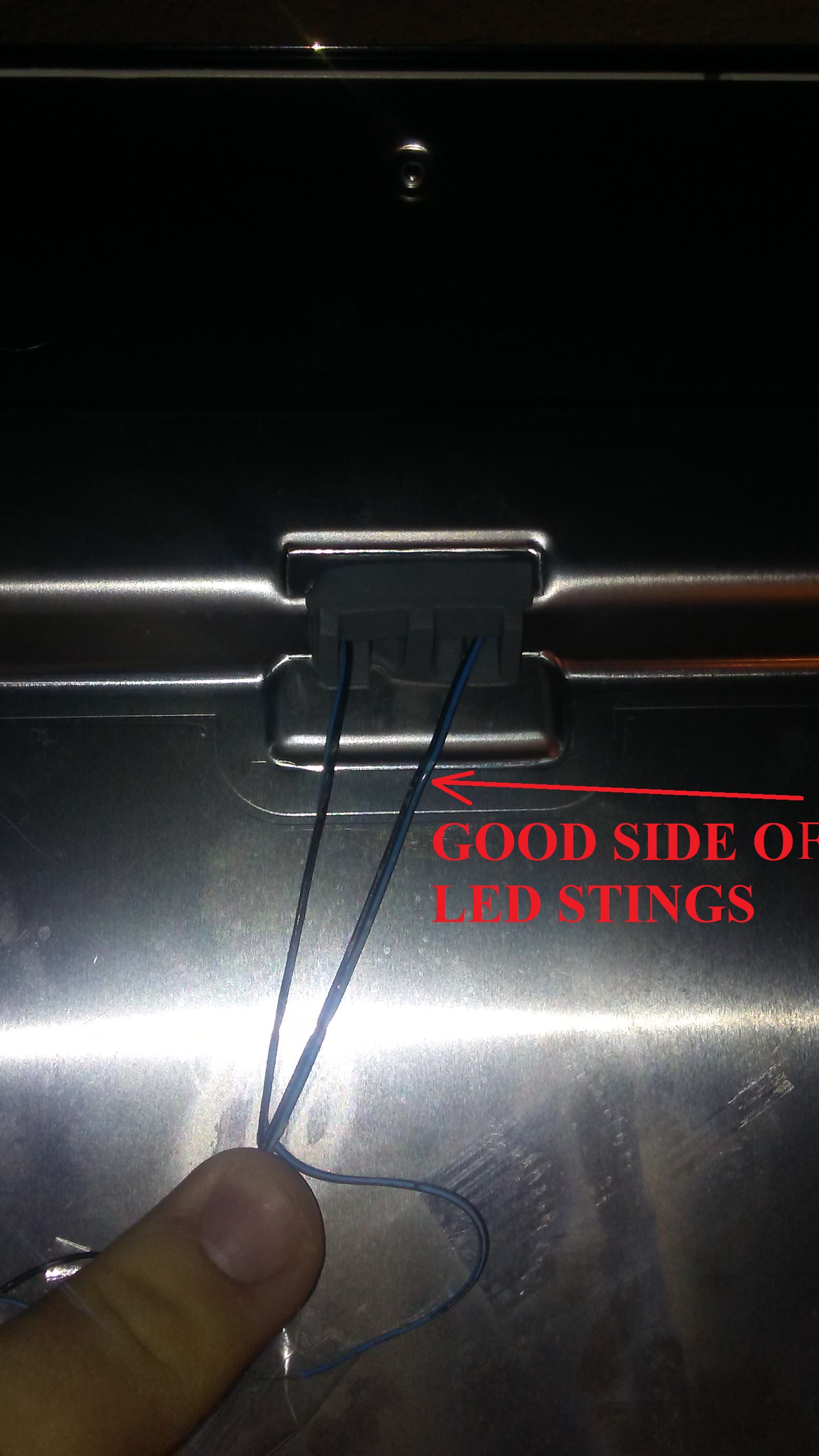 On the tv where led power wires wires go into screen it looks like they are branching of directly to left and right and they are not connected. I have working strip connected as in the picture bellow and it lights up one side only. if i try other side its not doing anything and measures dead, no resistance or changes anything on meter where i measure it in either diode mode or ohm mode.