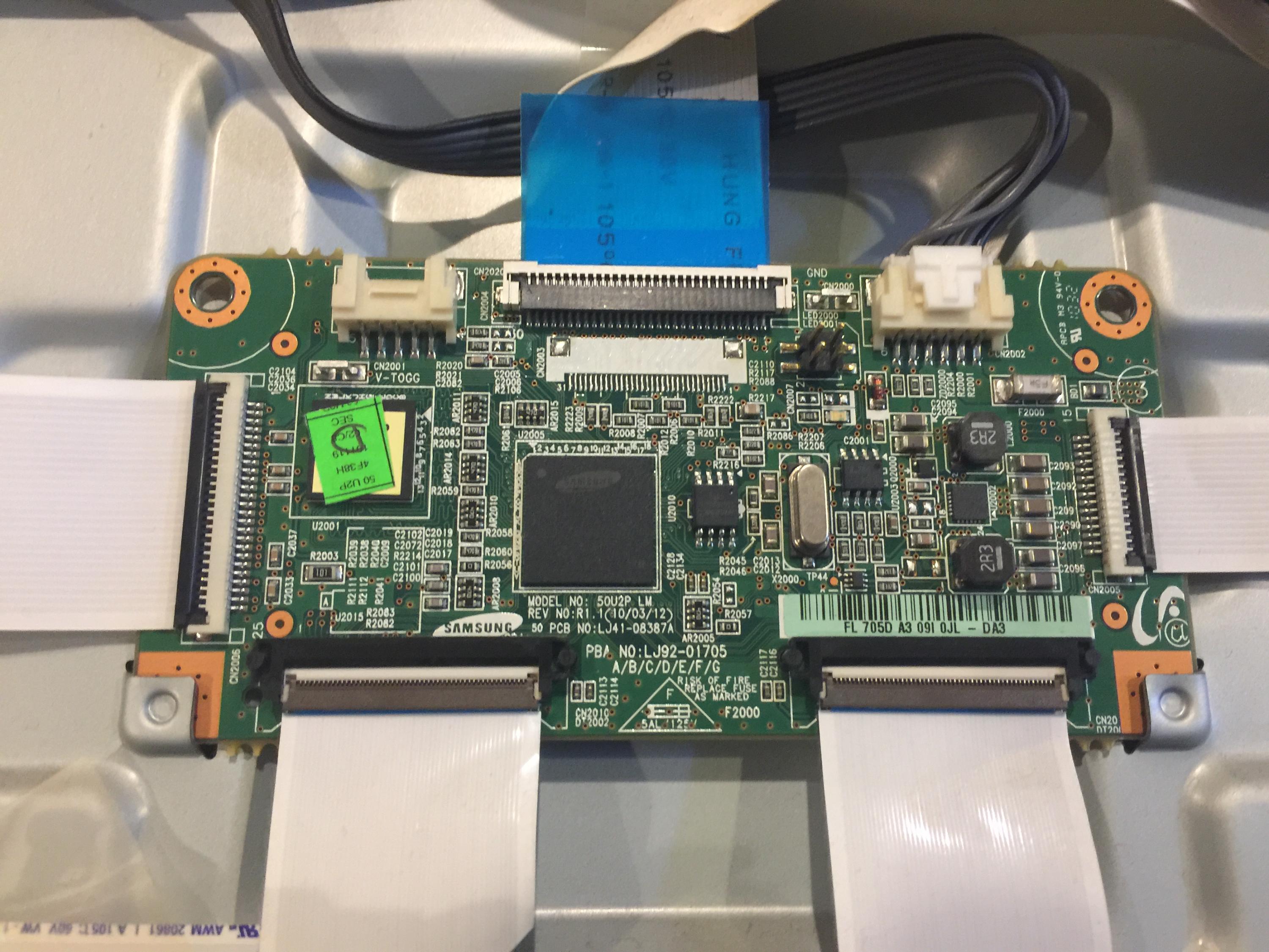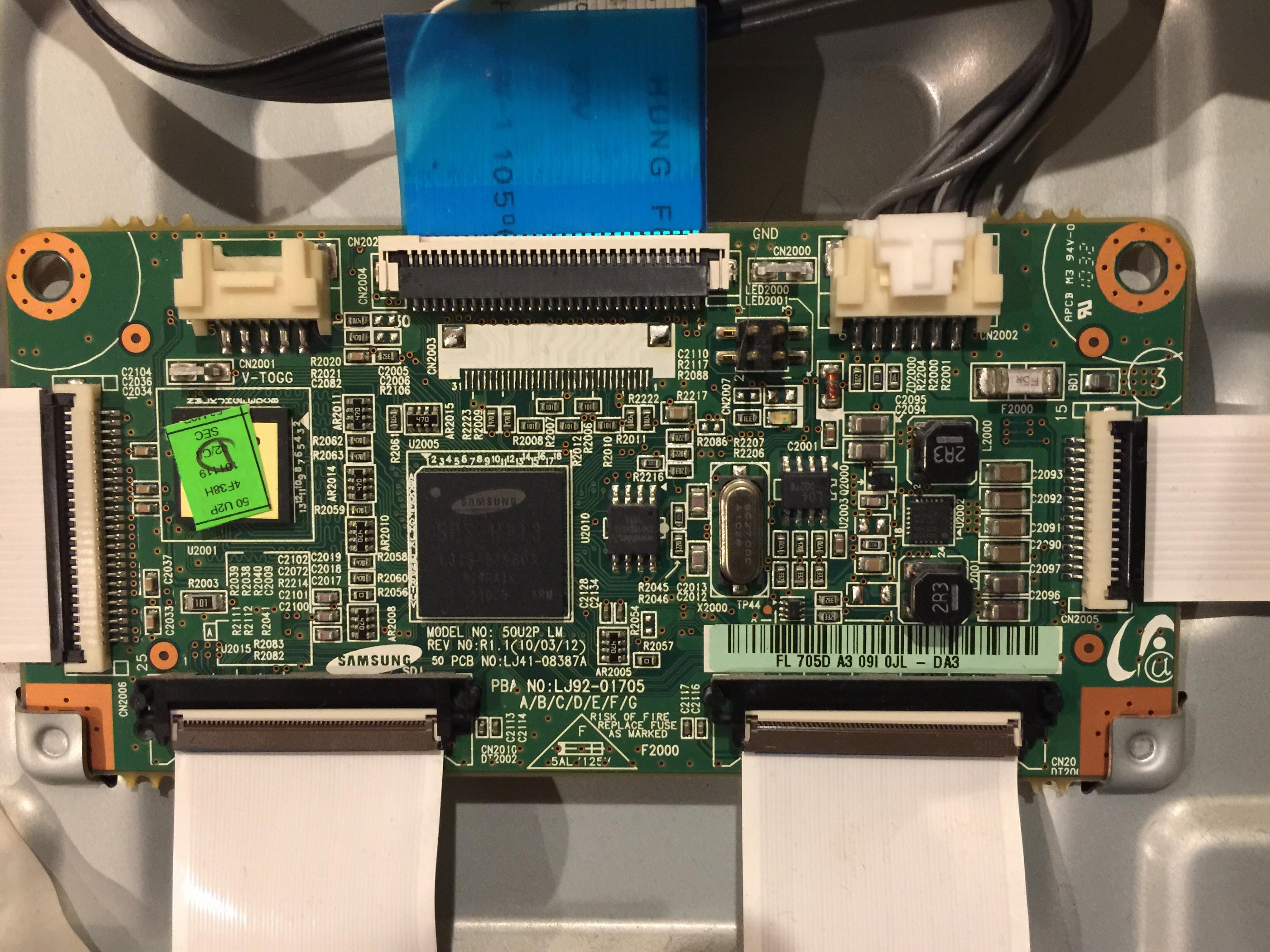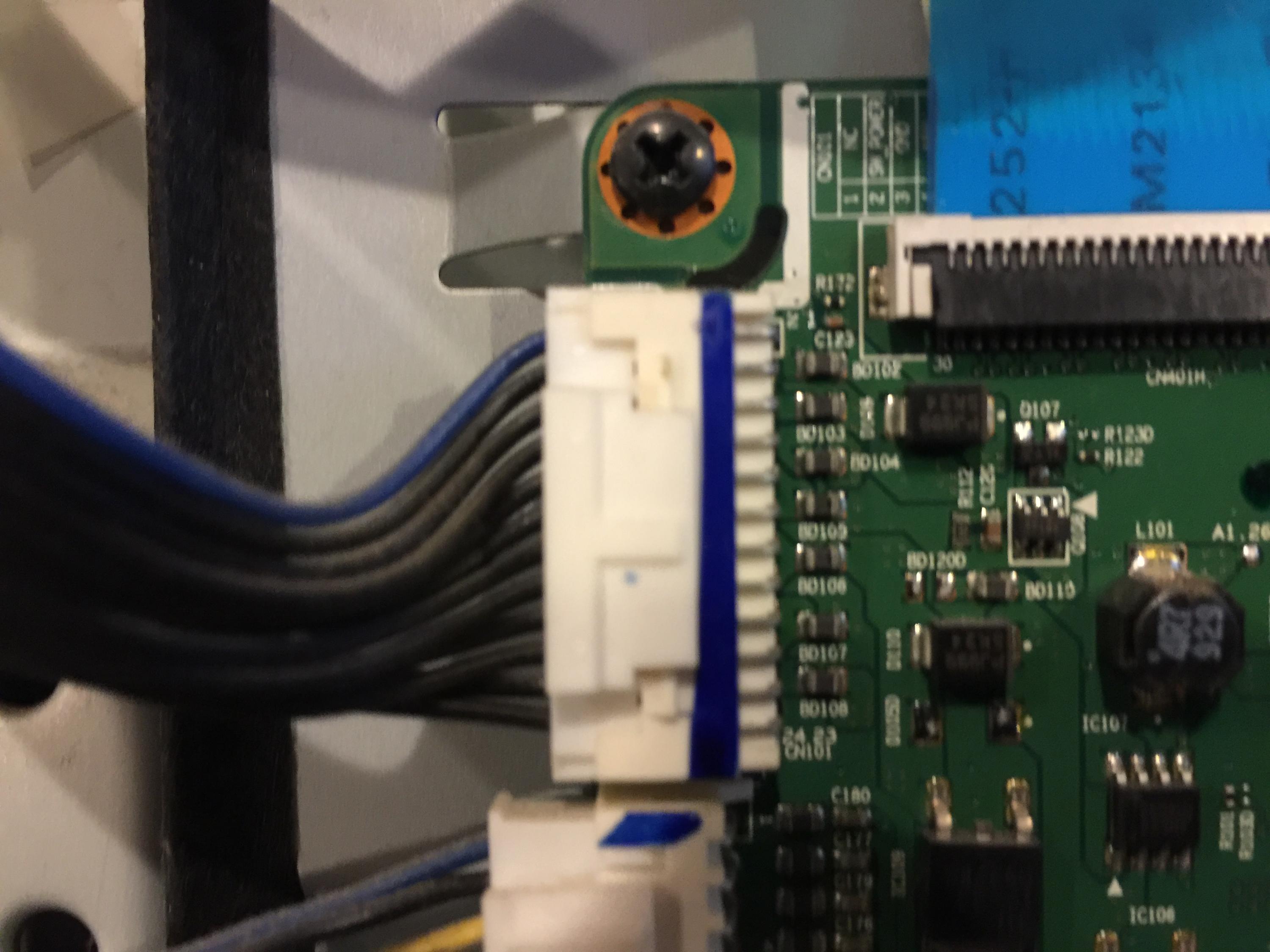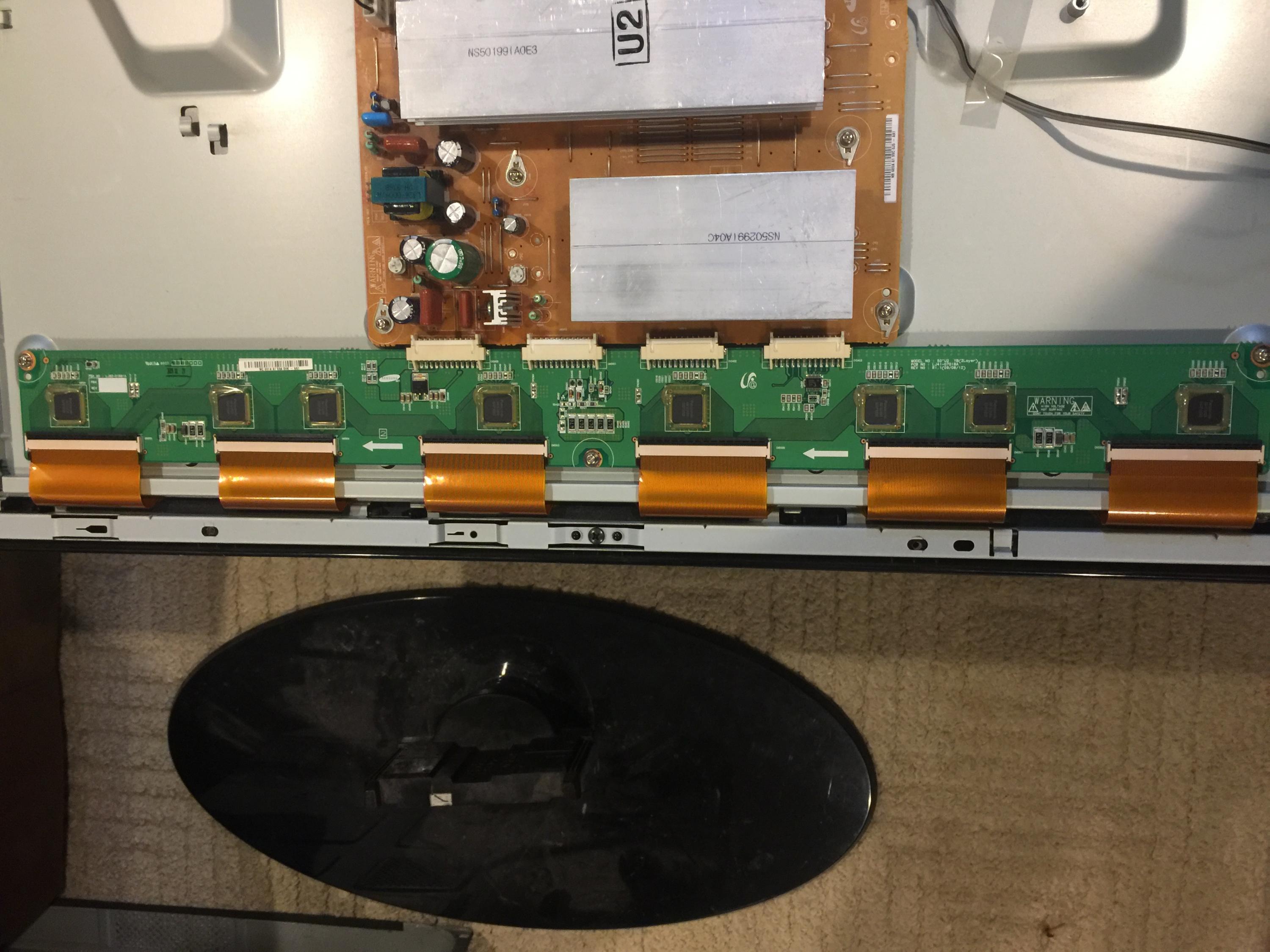 The TV turns on (chimes and Ctrl board LED blink every 5 sec.) but no picture. He had already replaced the Ctrl board and I'm checking with him on the orig part # to be sure he replaced with the exact same board. The VA and VS voltage on the panel sticker say 55 and 209 respectively. When I test the points on the Power Board I get 0.00 and 6.3 for the VA and VS voltages (DC).