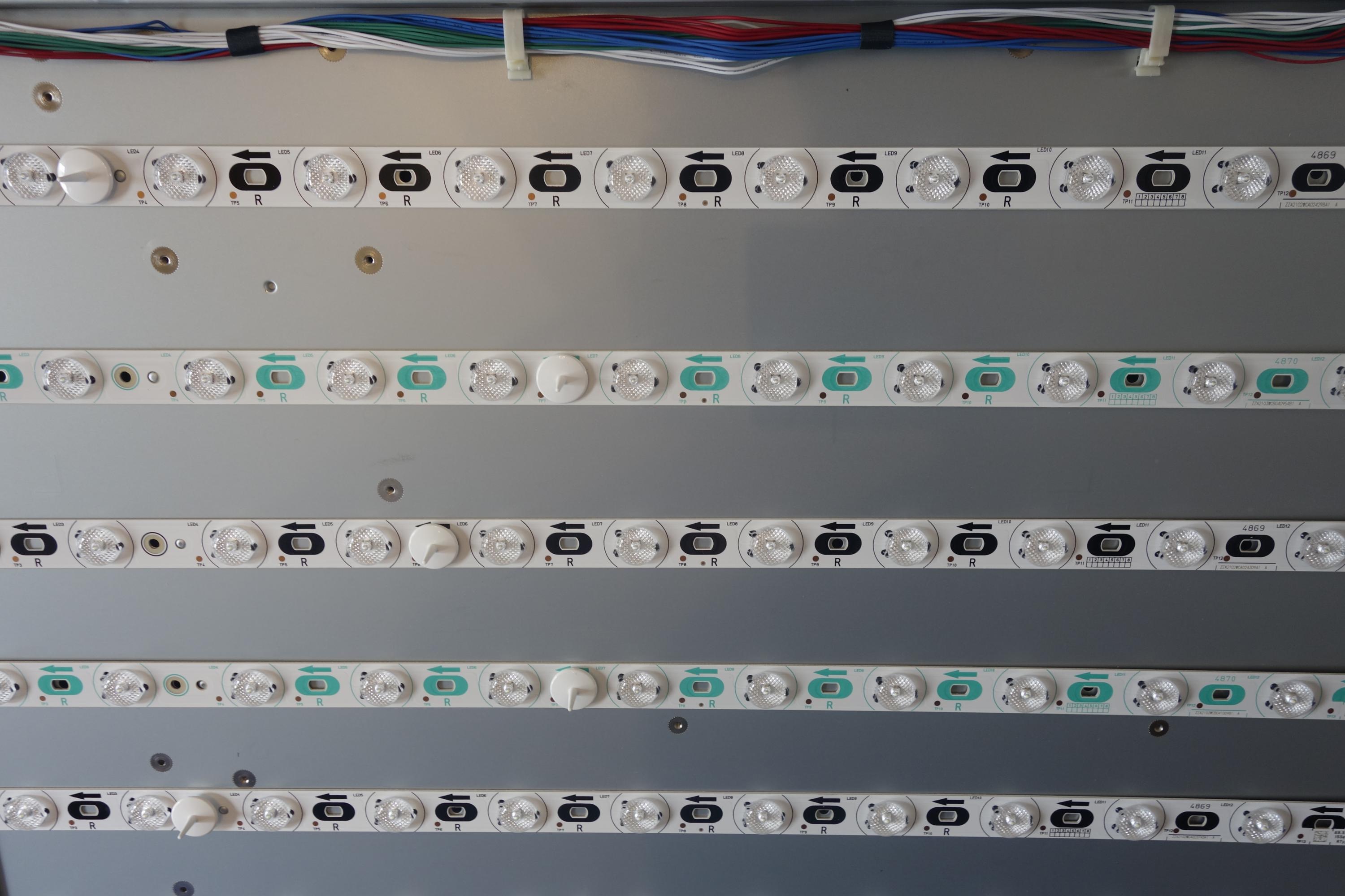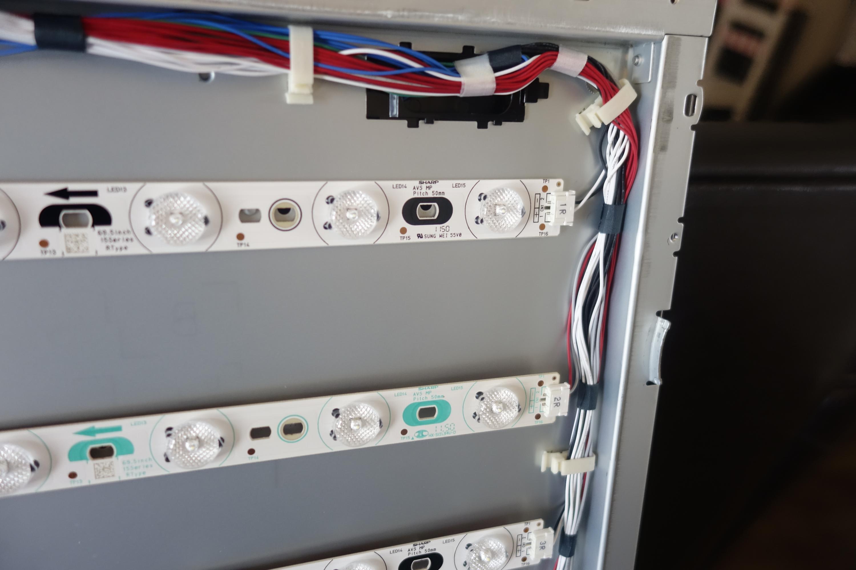 The cabling only comes in from the right side of the tv, so the wiring runs to the left side of the tv are longer. There are two led strips per row. On the first row the labeling would be 1L(1 Left) and 1R(1 Right), the second row would be 2L and 2R, etc. The black and green references are for the coloring on the led pcb units, the leds are a slightly different tint, this may not show up in the pictures. I took voltage readings on each of the test points on each led strip. The initial readings are as follows: