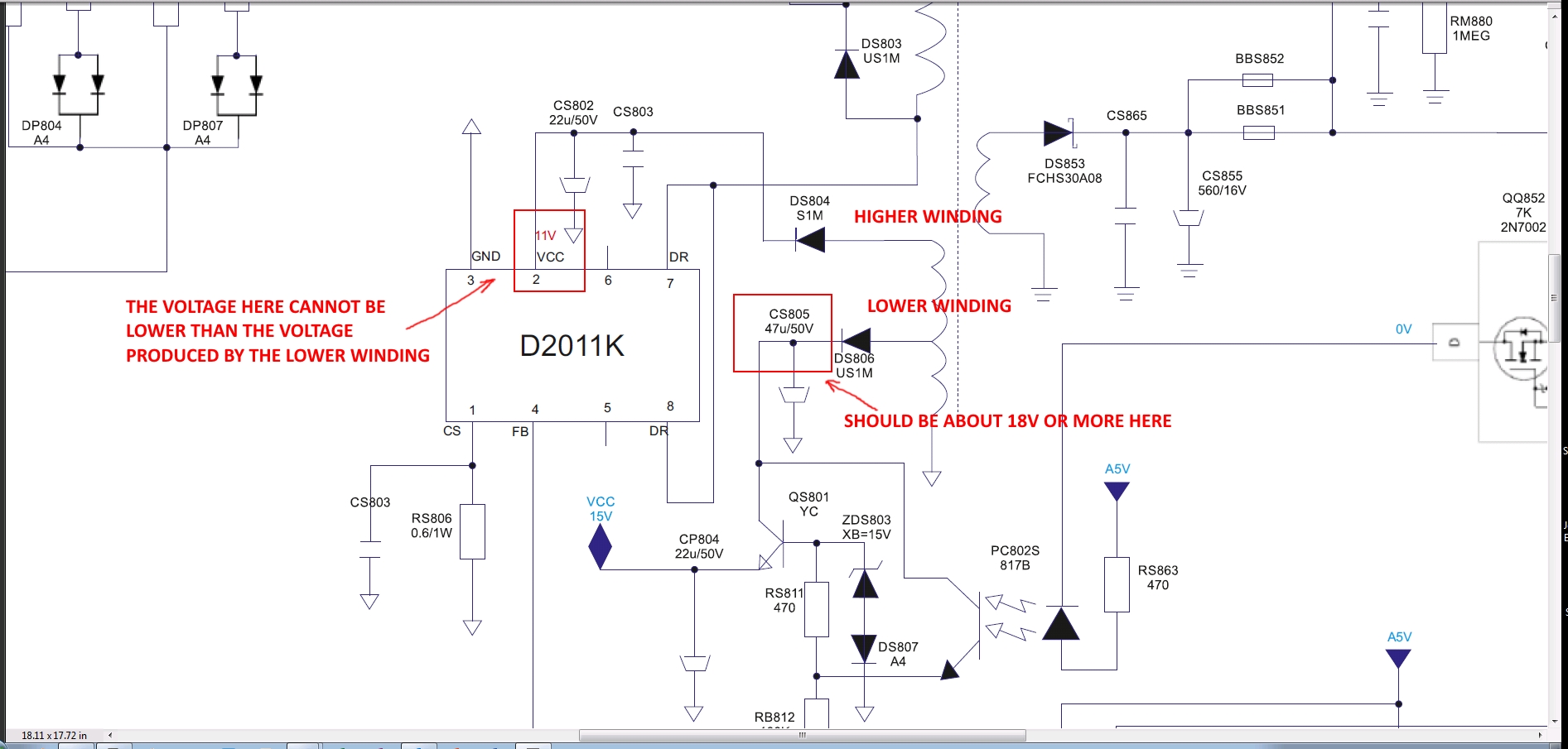 That reversed engineer schematic has lots of errors, if you look at how the DCV is generated by the HIGHER AND LOWER Transformer windings, it is impossible to have lower Voltage on the HIGH winding than the low winding.