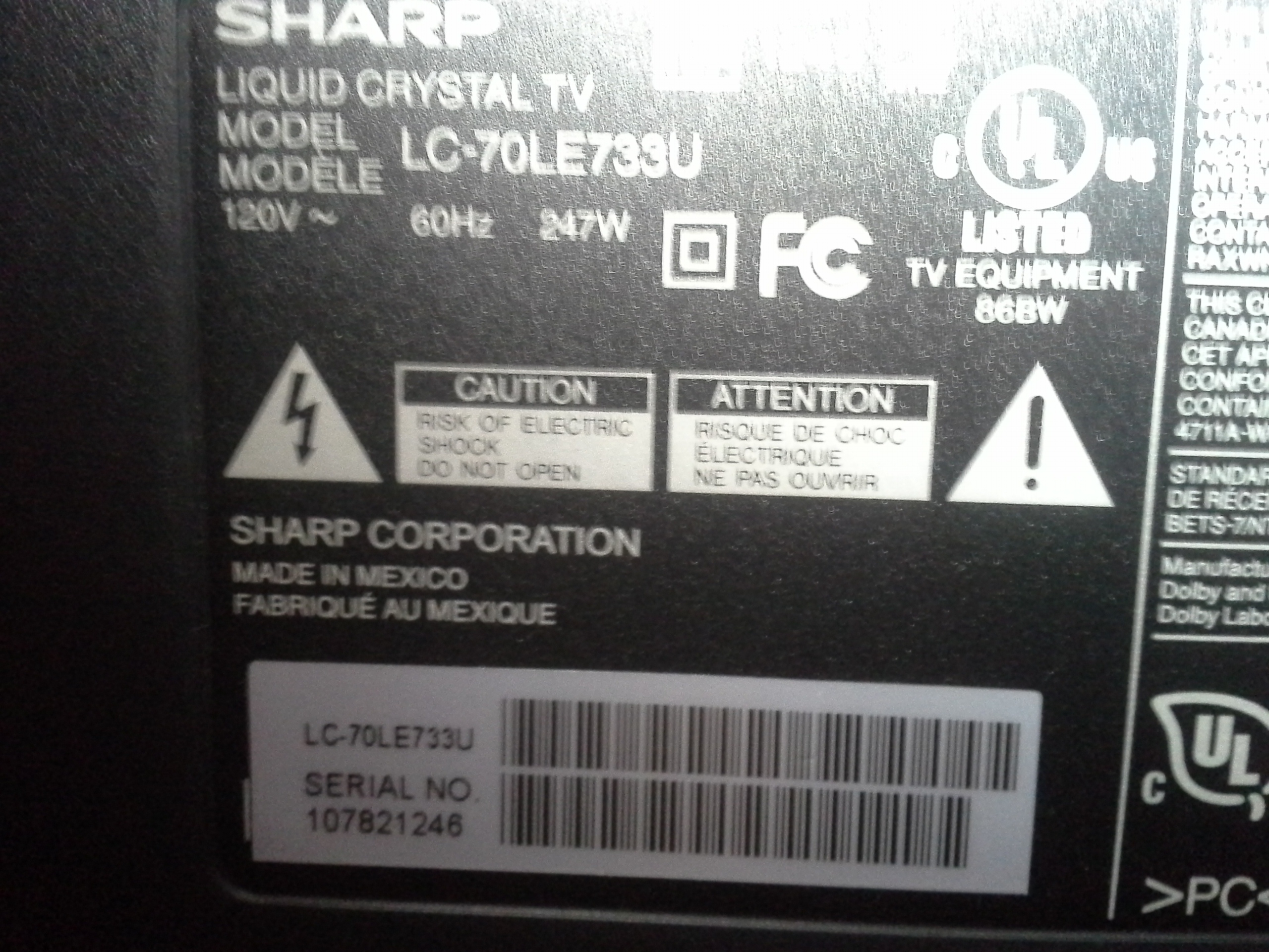 Ok.....here's something else I just noticed. Before, I could never access the menu because I had no picture. I thought I'd access the menu to see if there were any "light errors" and if so, I'd erase them. I held down input and volume down while plugging in the tv and noticed the following. The back of the tv lists model number LC-70LE733U but the service menu lists model number LC-70LE633U. Where is this model number generated from? could this have been the TV's problem all along?