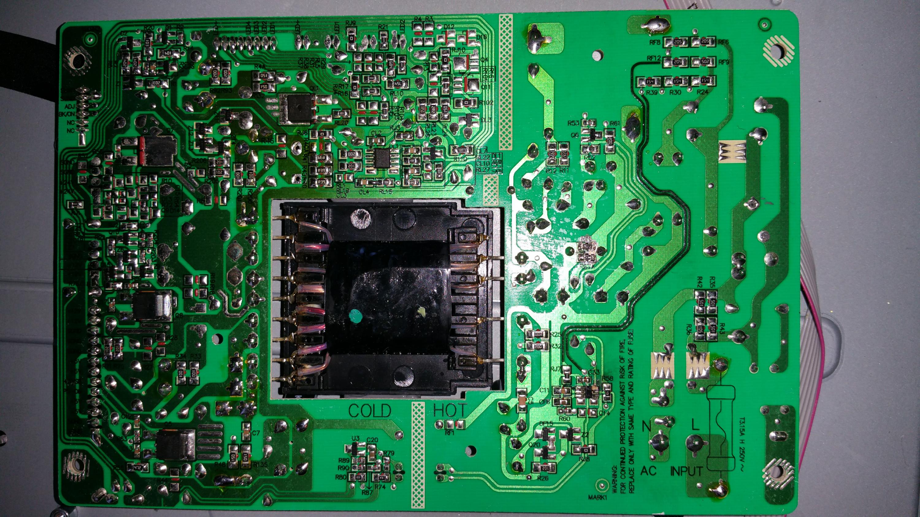 Picked up this 39" LED TV that won't power on. There IS power all over the hot side of the power board. Nothing on the cold side anywhere. There was a burn mark on the back side of the power board right in the middle of the hot side. Took a pic of that and then cleaned up the board and took another.