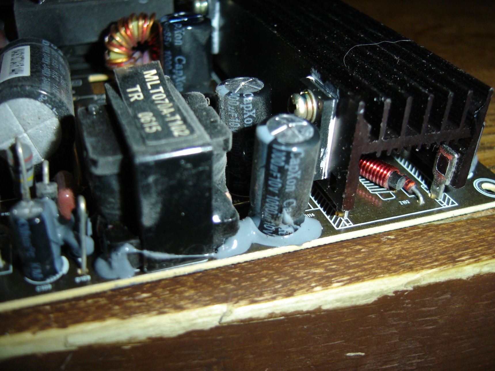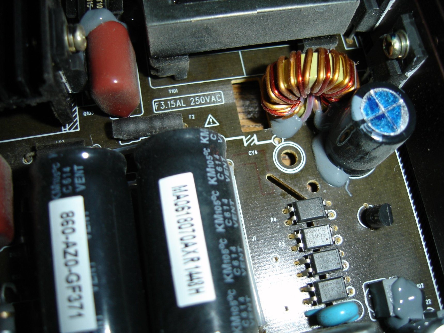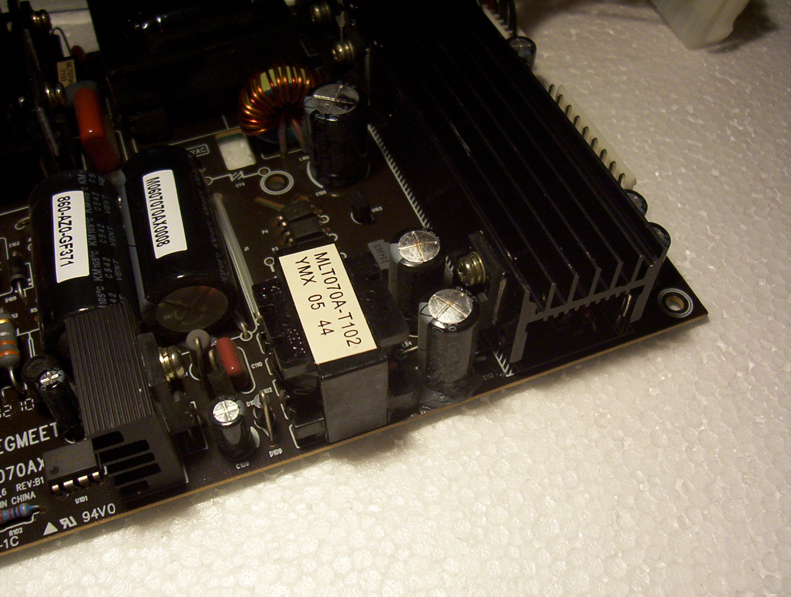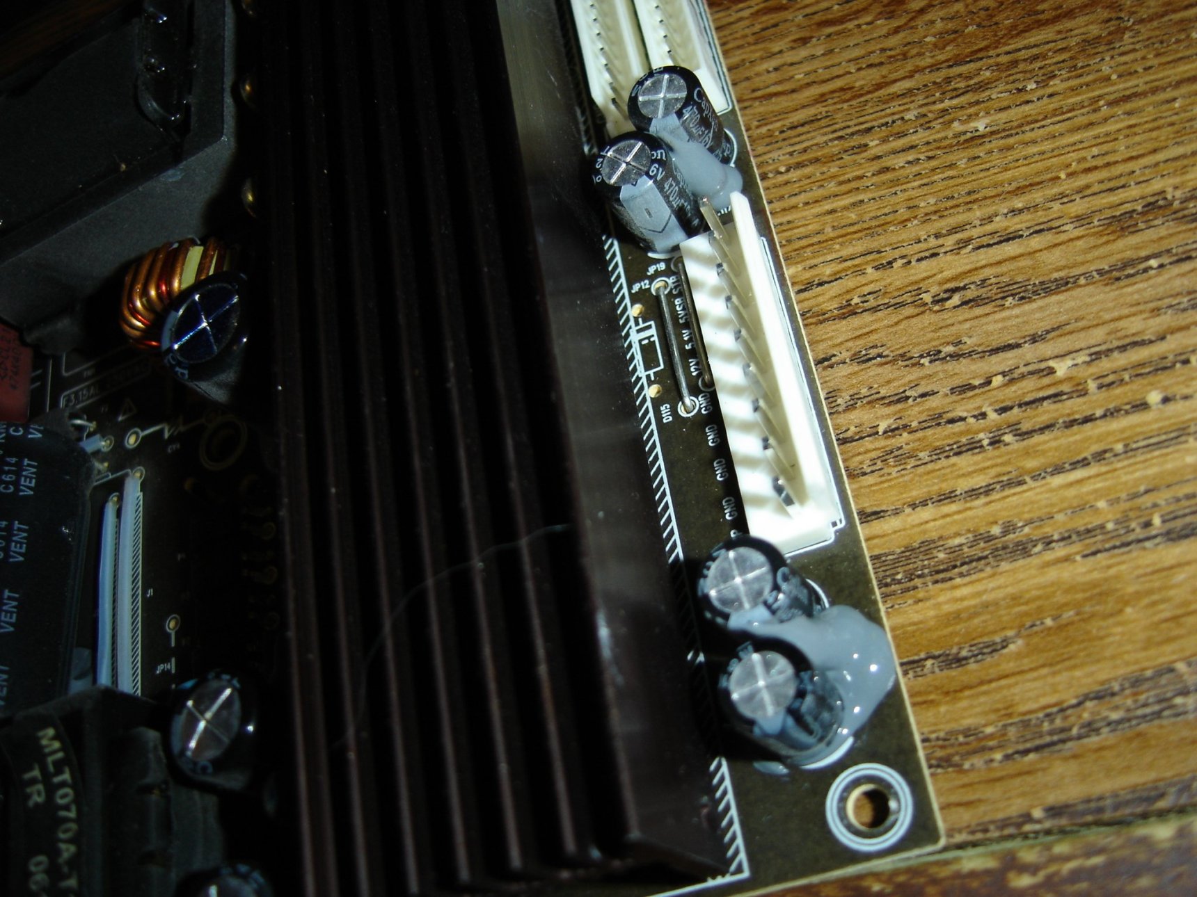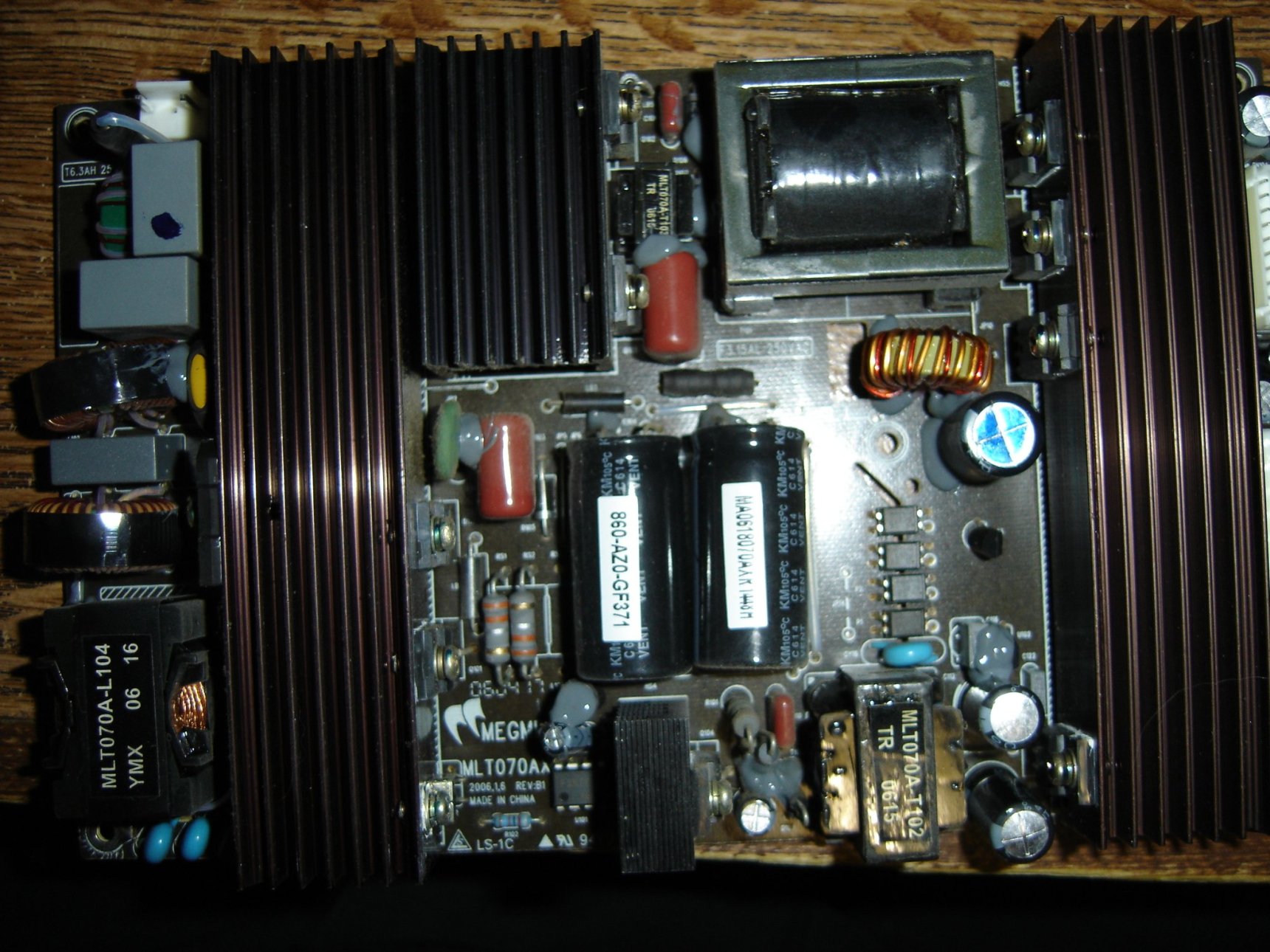 Anyway... Being as it was a free LCD TV, I'd like to see if I can get it fixed up. I took it apart, as from previous experience with fixing my Samsung monitor (which was repaired following a previous poster's experience with the same model on these very forums), I figured it was some bad caps on the power supply. Lo and behold, there are a couple of bulging caps on the thing.