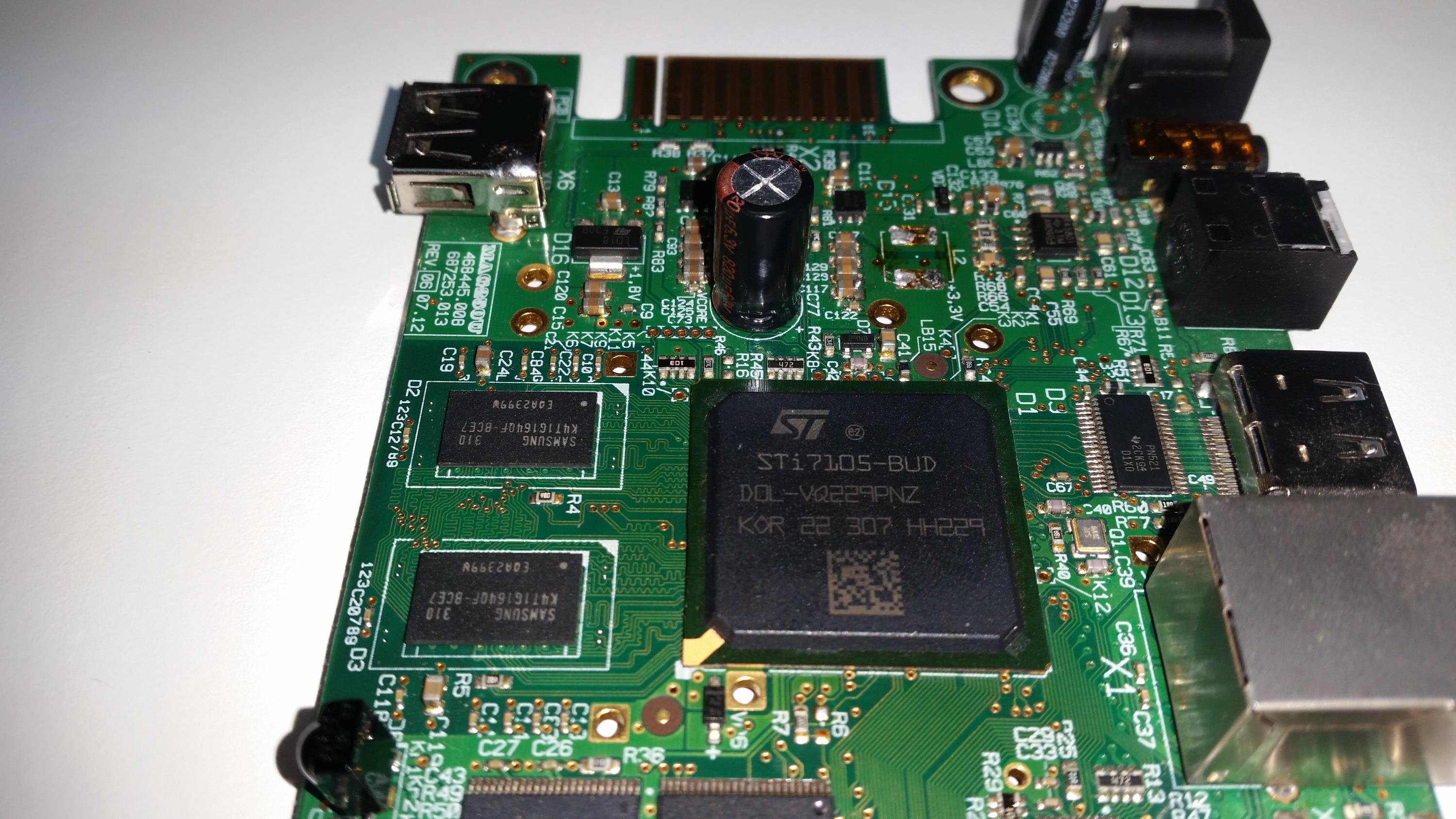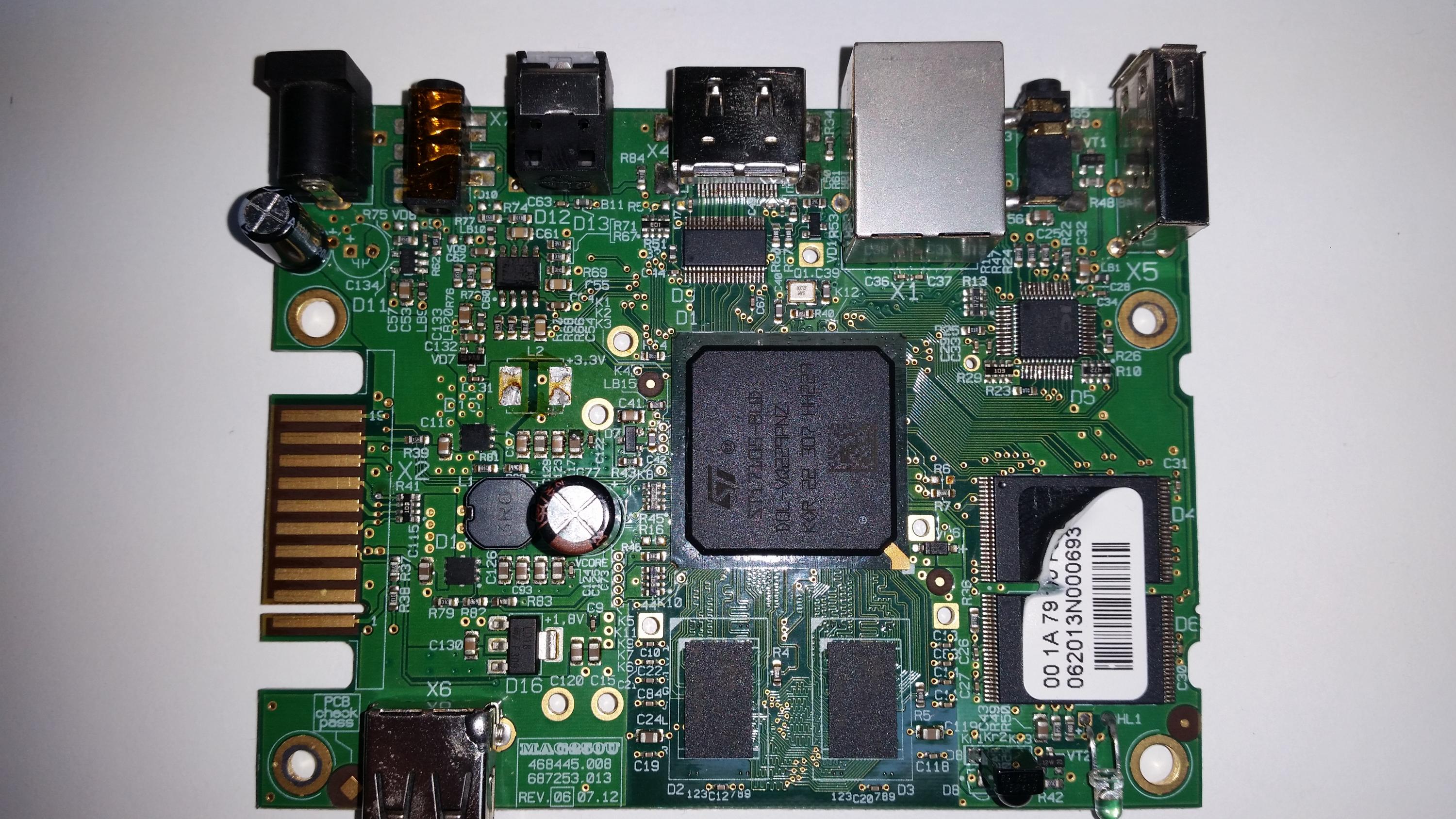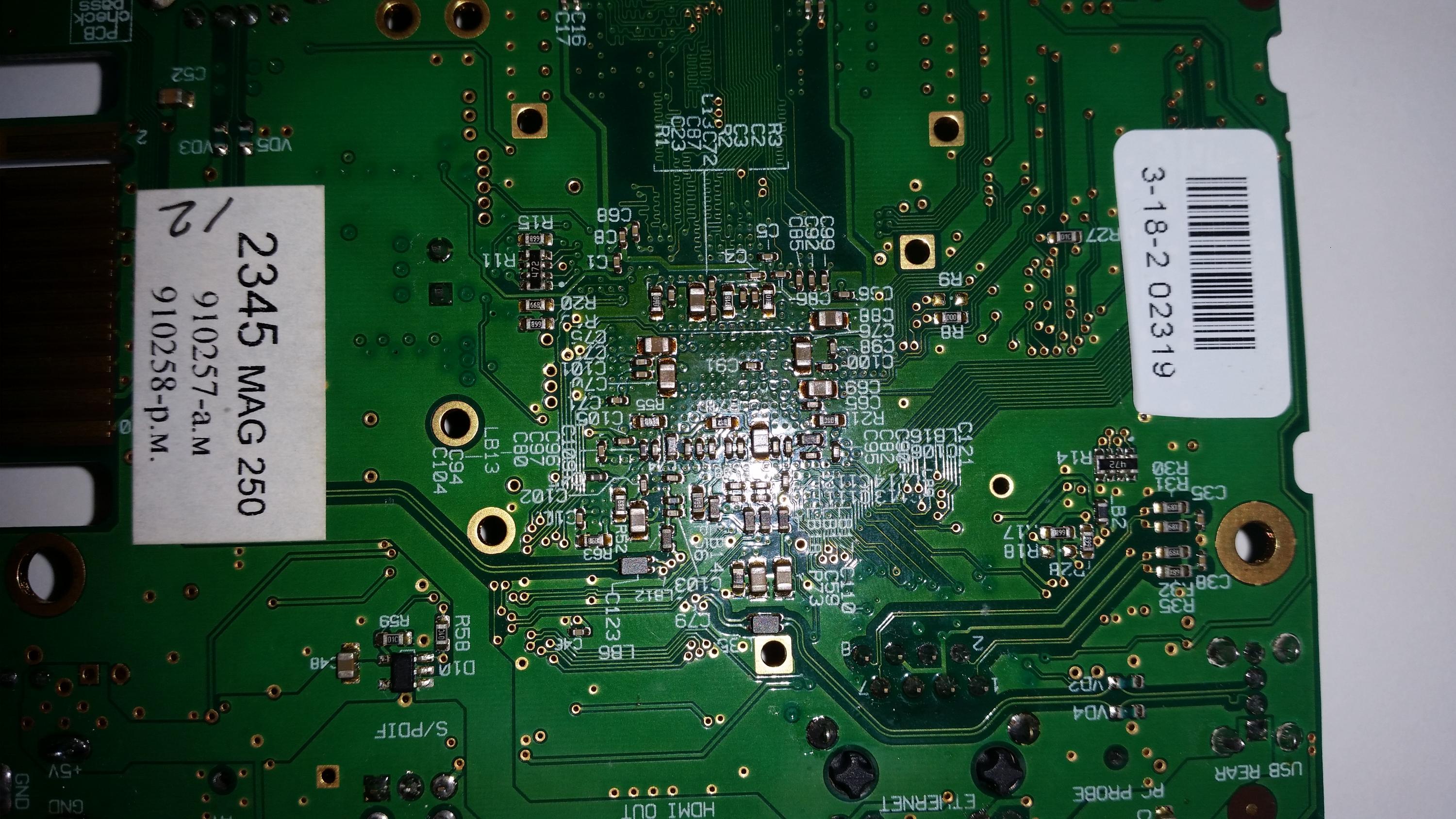 I have two of these MAG250 boxes here, both faulty. After initial fault finding I determined one of them has a short (low resistance actually about 12ohm) on the 3.3V rail and the other has a similar problem on the voltage rail marked vCORE.