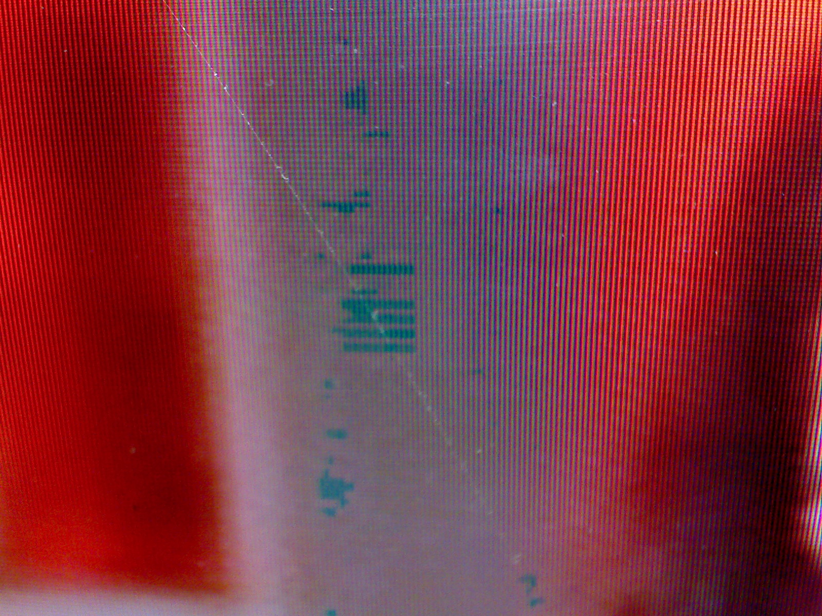 The problem is with shadows on the screen with wrong colors, that appear usually if there is a high contrasting image on the screen, including gradients. I am attaching a pictures. What do this artifacts mean? Look at the blue shadows, that appear on the parts of the image, where there are gradients of certain colors. Sometimes the shadows are blue, sometimes red - depends of the background color...