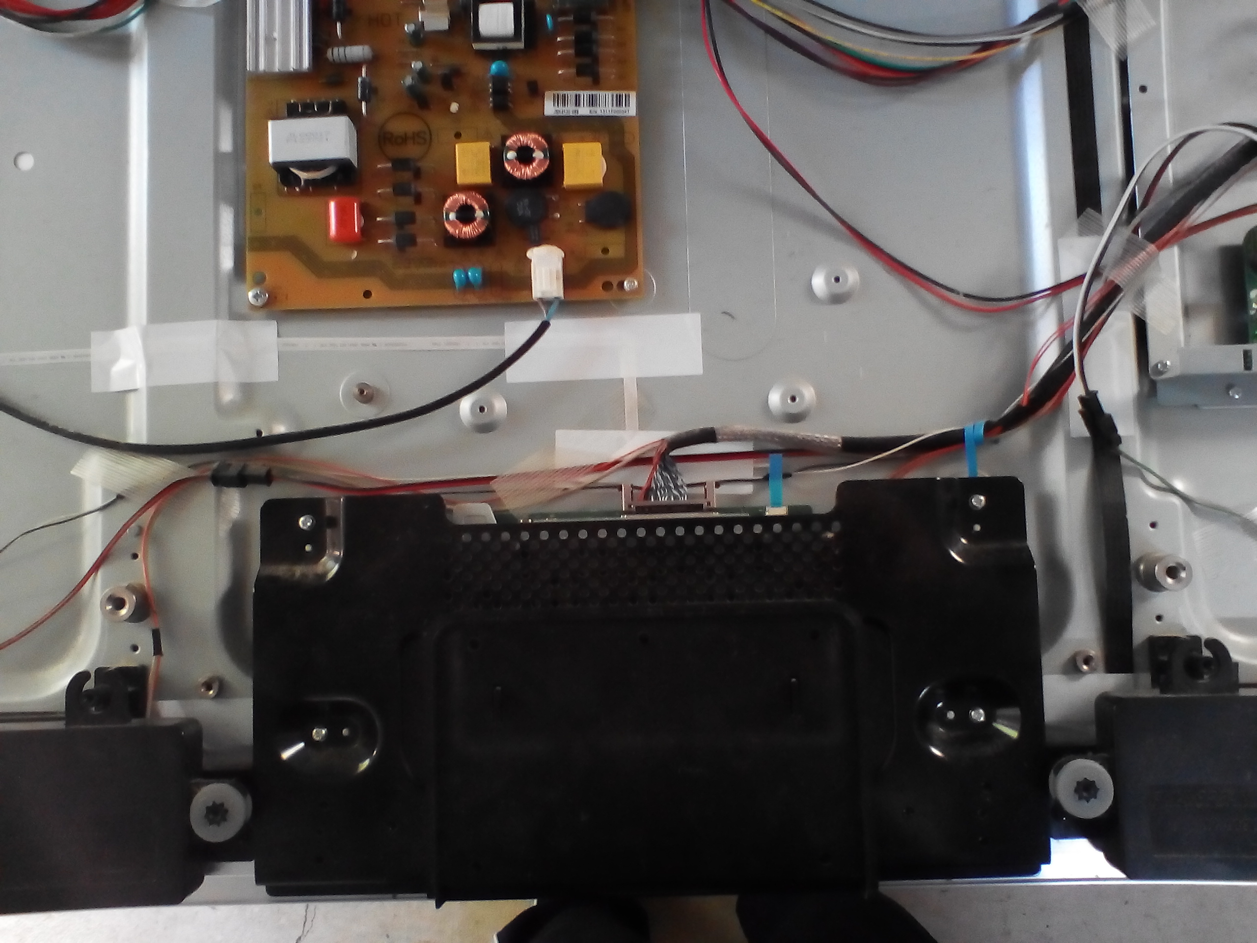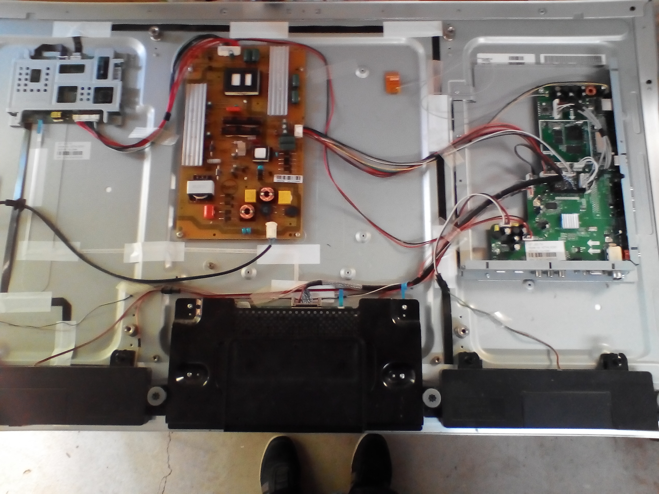 Well woke up to rain with thunderstorms so had to get flash pics anyway. On the mainboard in middle of pic is a red based connector with 3 wires reading o.5v 3.5v Gnd and the fuse under that connector is OK. The inverter board has 24.6v at fuse and on pos leg of both ecaps. The small strap runs to it from tcon which only has the usual main board connection to it. To me it seems the set having gone off due to whatever tried to restart itself by turning PSU back on OK then got to backlight turn on stage where it has locked up. But as input buttons work but don't activate anything I'm now inclined to a main board problem. What I don't know is when does eeprom kick in - is it at display logo stage or earlier but I don't think it has anything to do with backlight operation. So some ic on main is not cooperating with voltage signals???Comment