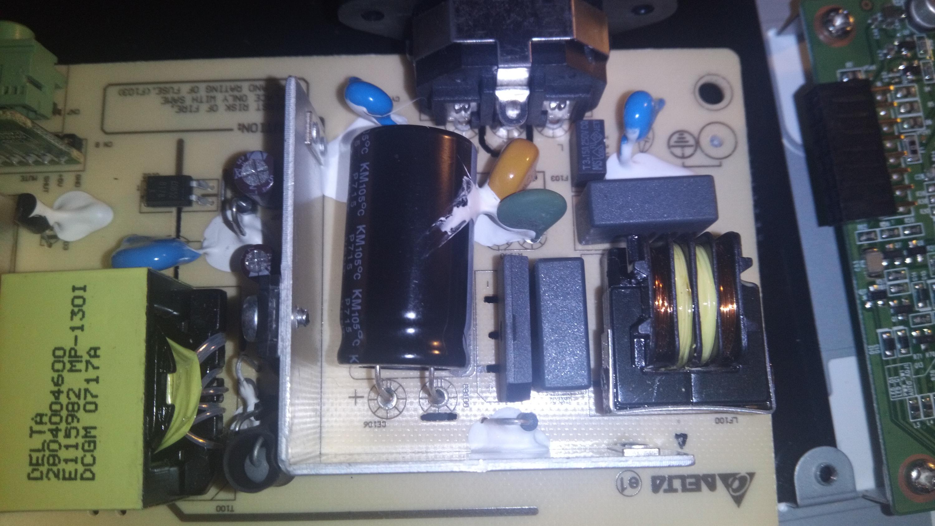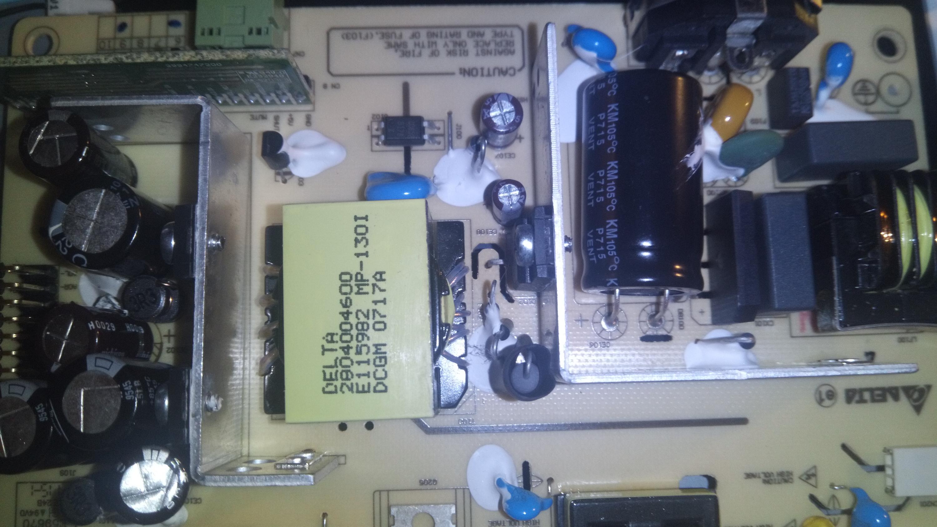 So I got one of these monitors for free, and I'd like to put it back into action. I plugged it in and got no power, so I opened it up (it's really easy to open). Found 3x 25v 220uF CapXon KM's that were bad, one pushed its bung out and skyrocketed. I replaced them with 560uF 25V nlC caps. I went through and did all of the others except the 2200uF 25V cap, using a combination of Marcon, Nichicon, and nlC.
