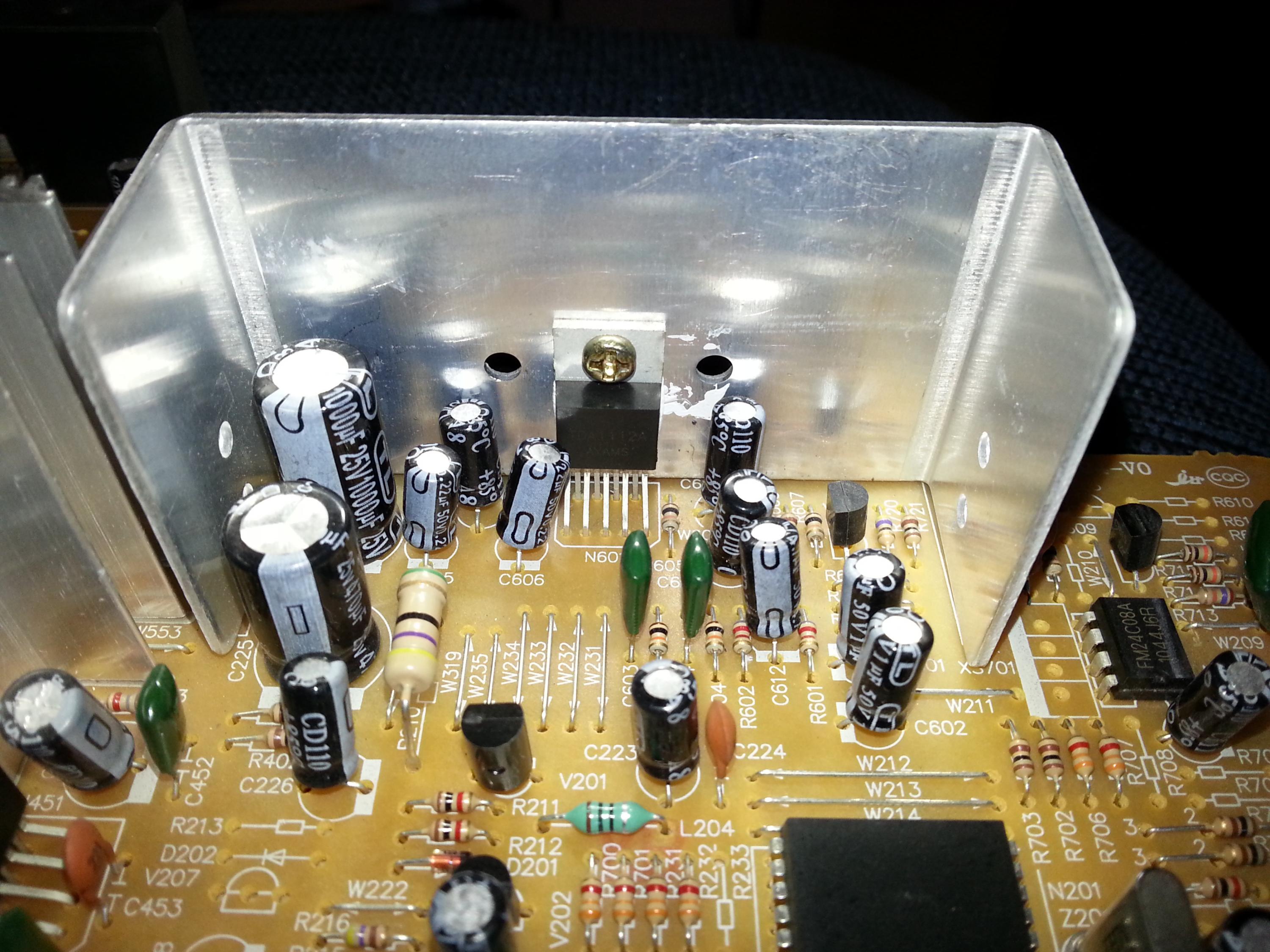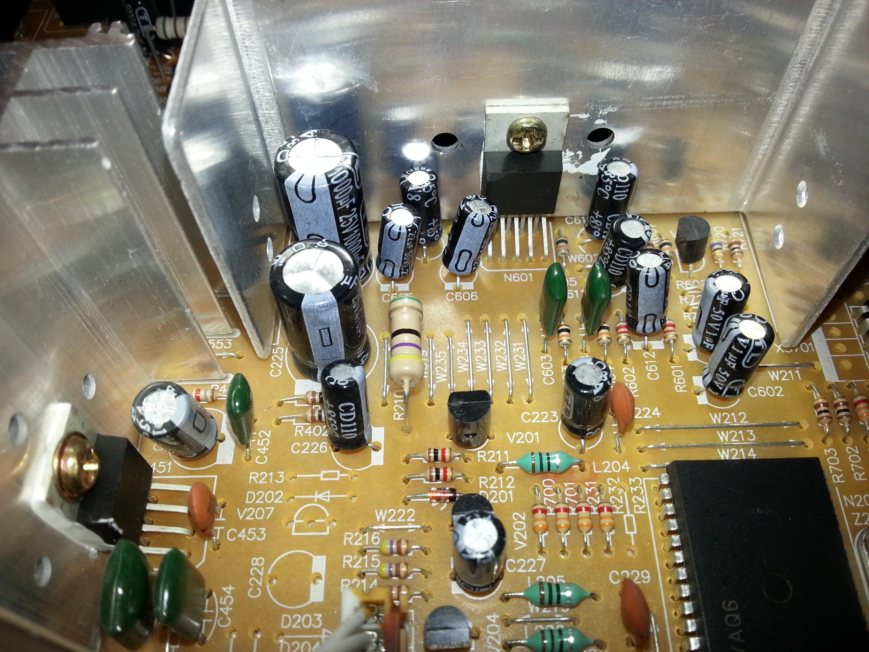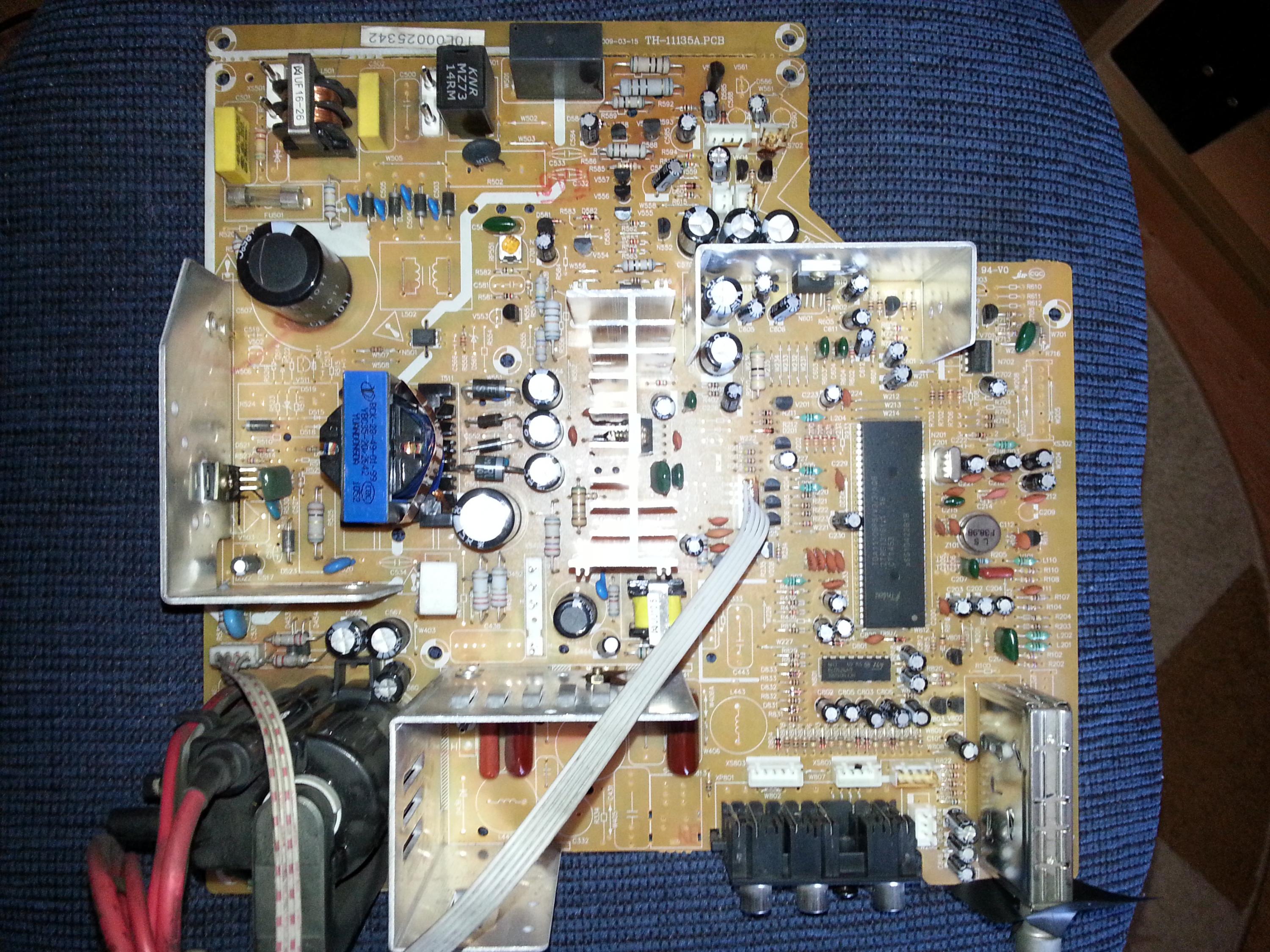 Good day folks. Not having enough money or not wanting for whatever reason to get a LCD TV, a friend of mine asked me to take a look at his CRT TV which developed this buzzing sound which reacts to the picture after power went out and then came back during a thunderstorm, supposedly subjecting the set to a power surge. It's audible over the speakers and it changes in tone depending on the picture displayed - it would react to subtitles going on and off for instance. I looked into it a bit and apparently it's called "sync buzz". From what I recall, the buzzing stops when the TV is muted or the volume turned all the way down to 0, but it appears as soon as you turn up the volume even to 1. Not having worked with CRTs before, mostly out of fear of all that HV going on, I was a bit reluctant to open it up and inspect, but nevertheless I did this yesterday, pulled out the chassis, which is a TH-11135A (I've attached the schematic - might not be the best quality, since it's split in half but it was the only one I could find) and located the TDA1112a audio chip which I believe it's the culprit for this - it's located in the top right of the second page of the schematic I provided. I took some pictures of the whole board and the area in question. Trouble is: what's causing this buzzing all of a sudden ? Should I replace the audio chip entirely or some of the caps around, like the VCC one or perhaps the AC coupling ones for the speakers (C606 and C605) ? I couldn't find the datasheet for this audio chip so I don't know what some of those pins do, mainly 3 and 6 which seem to be labeled as CTV or CIV (not too clear) and RR respectively. From what I can tell, I'm either picking up noise from the flyback somewhere, or there's a filtering issue on the 18v bus which also powers the audio amp. The 18v come from a SMPS which also produces a few other voltages. It's not convenient at all to start replacing components blindly, as I'd have to test it out every time, which means putting all the wires back in place which is a chore in itself and then also discharging everything once I see it's not working and I have to go back in there to change something else. Any thoughts ? Cheers.