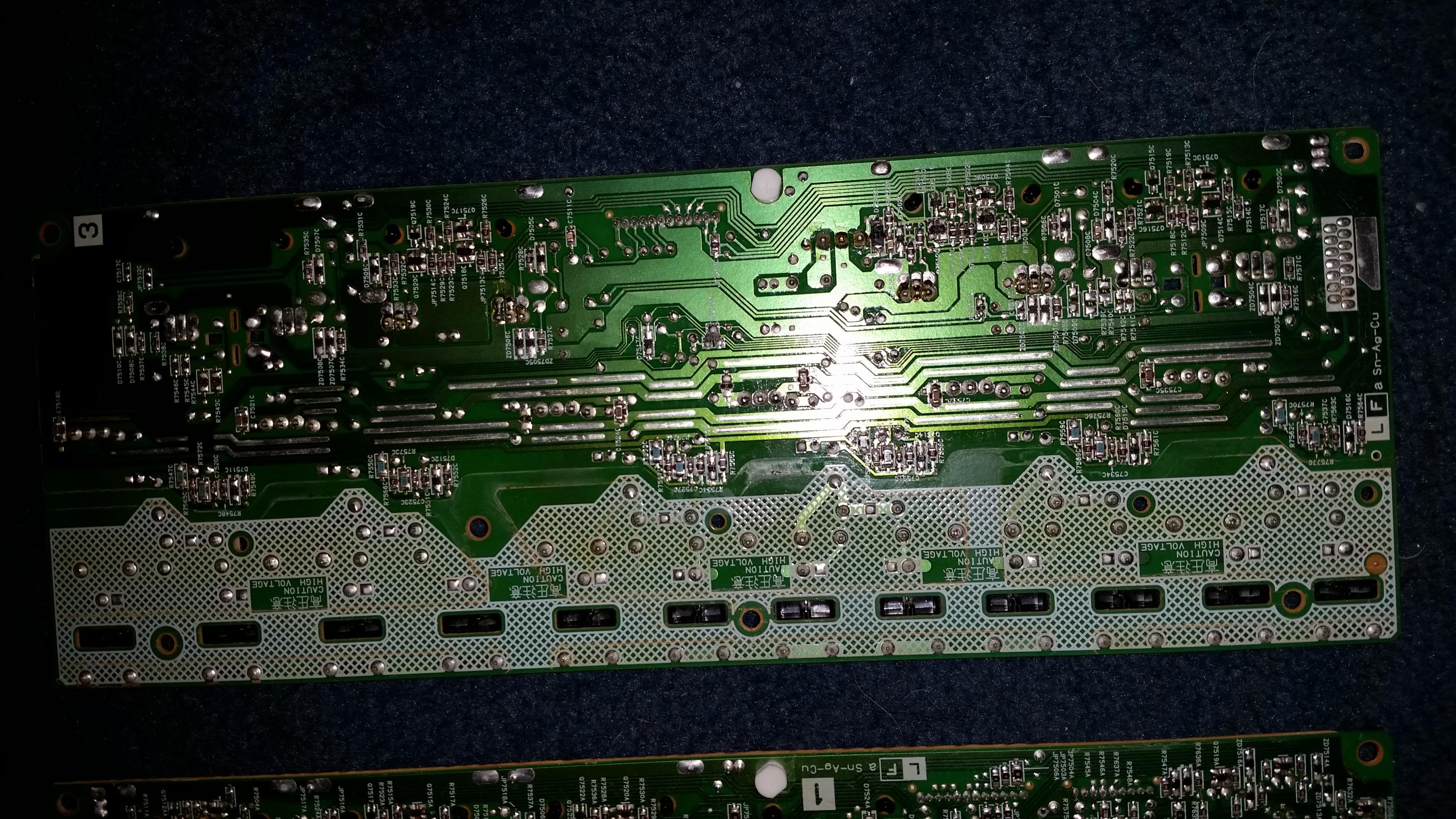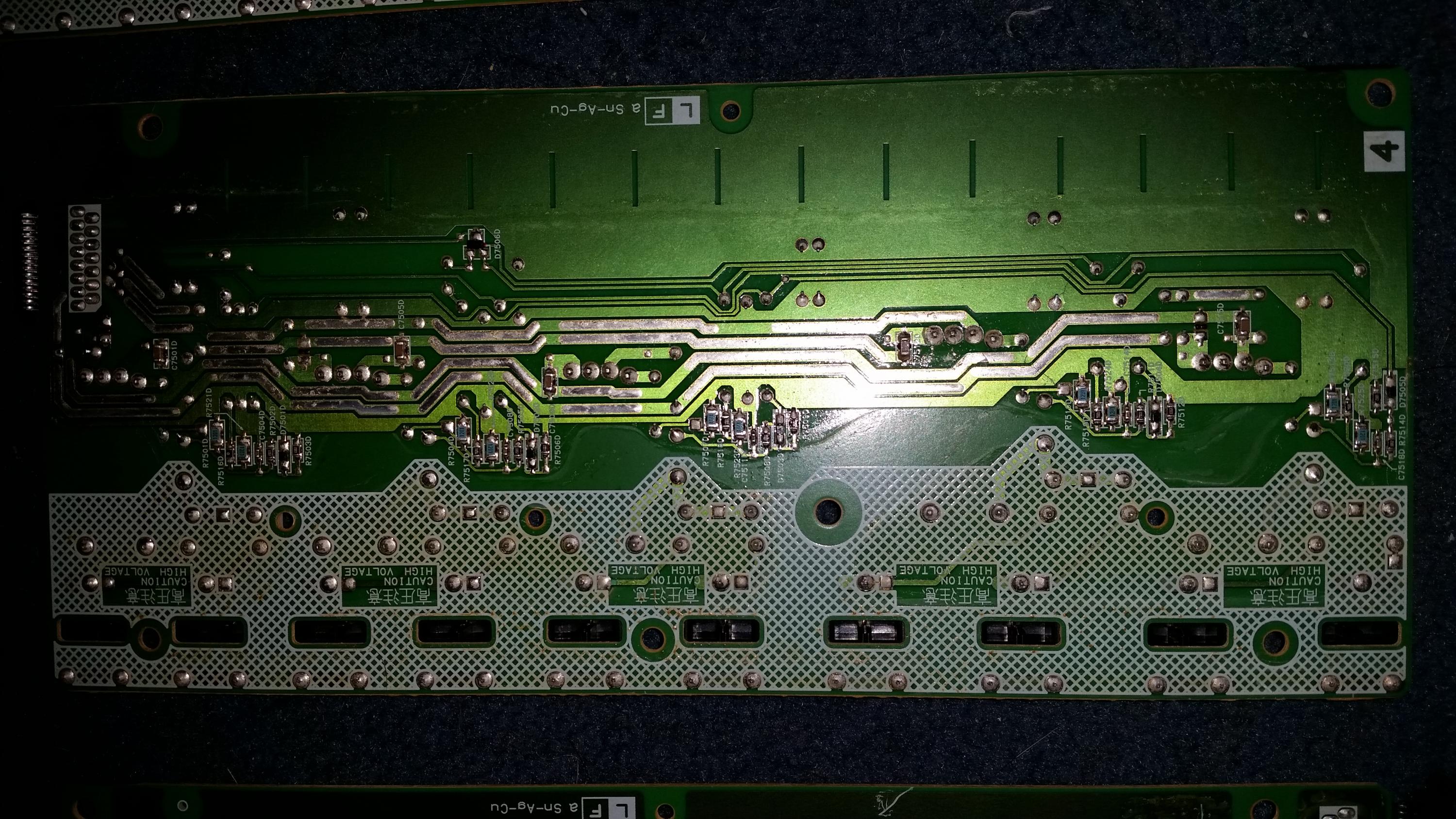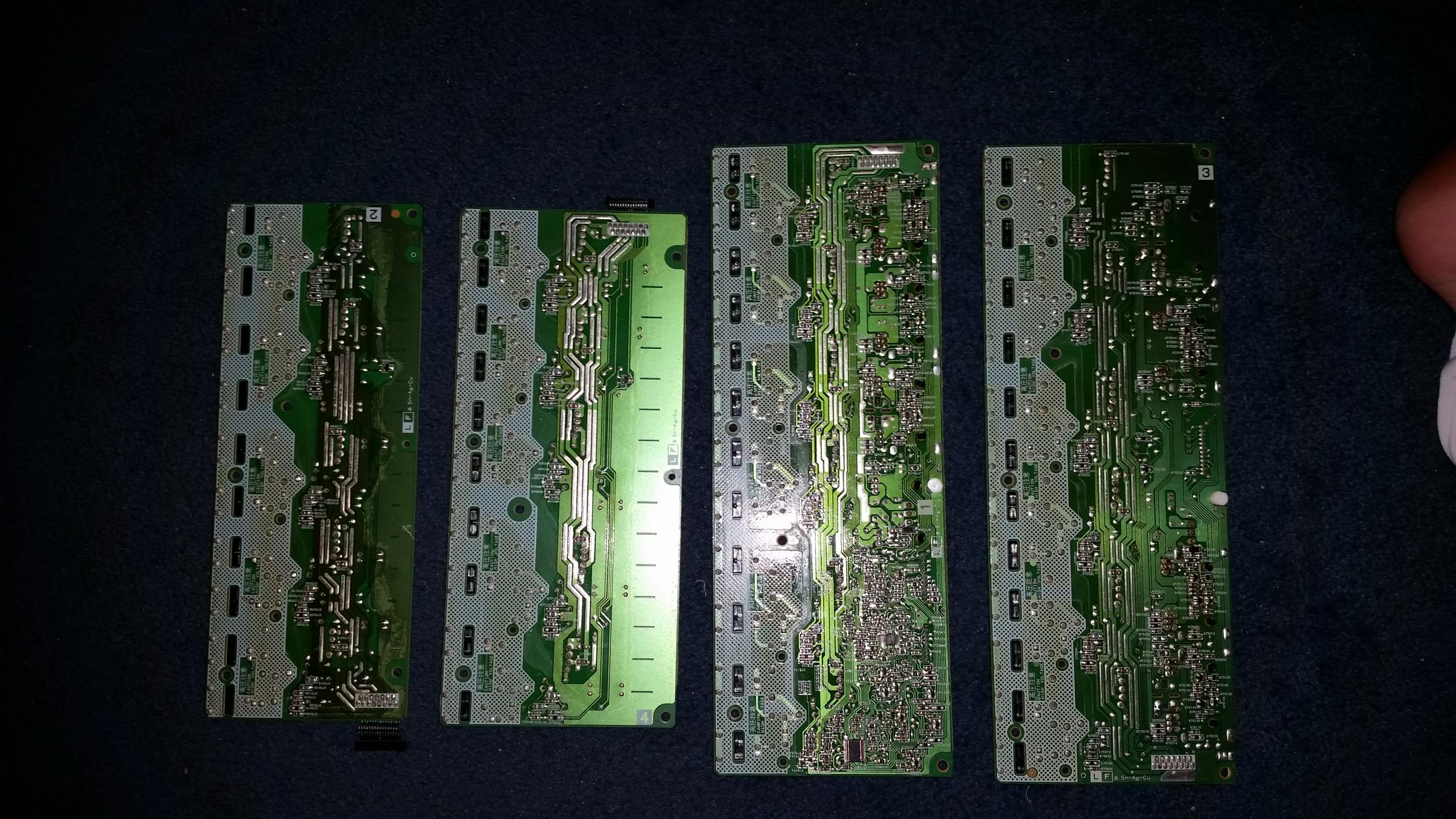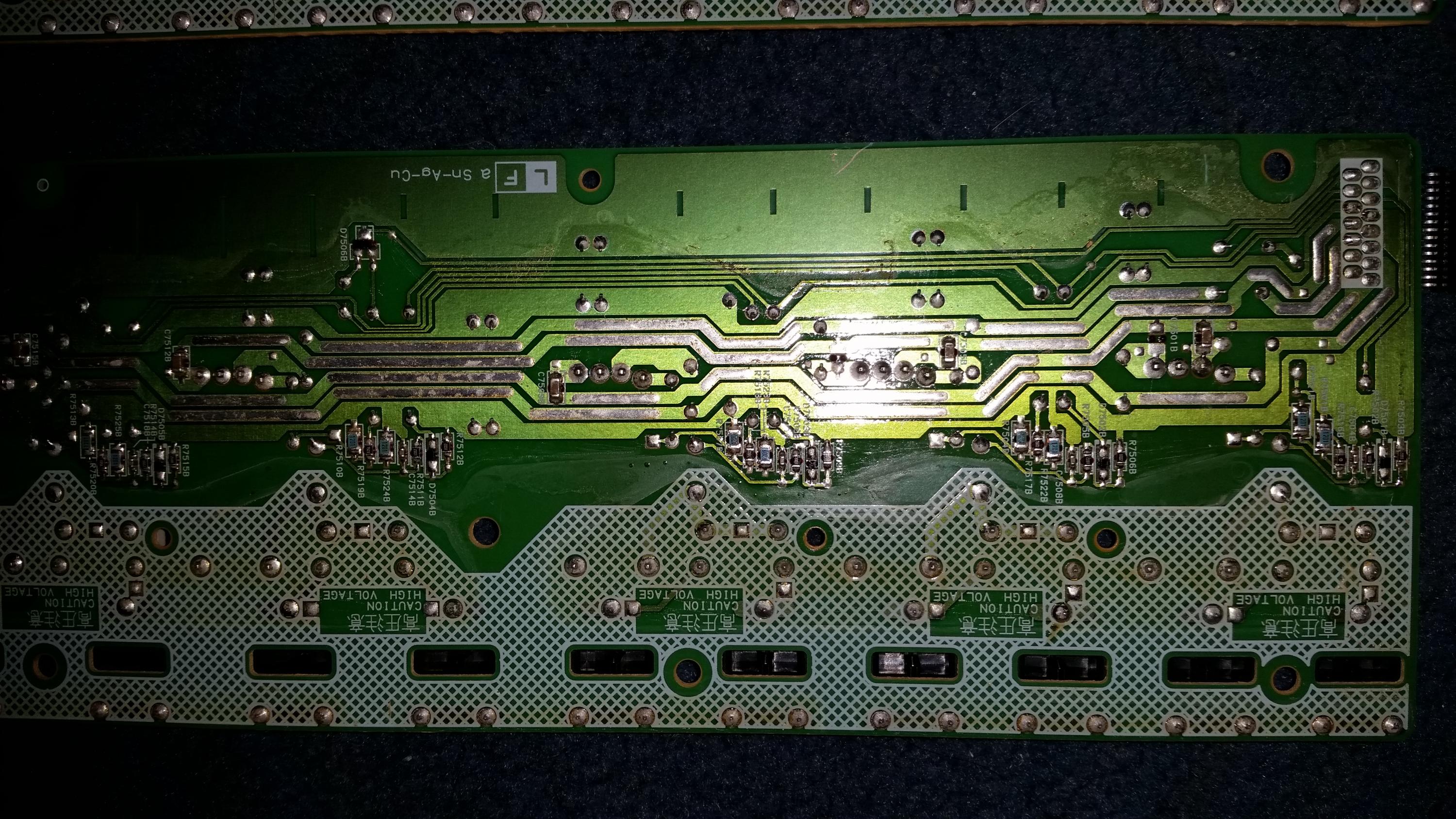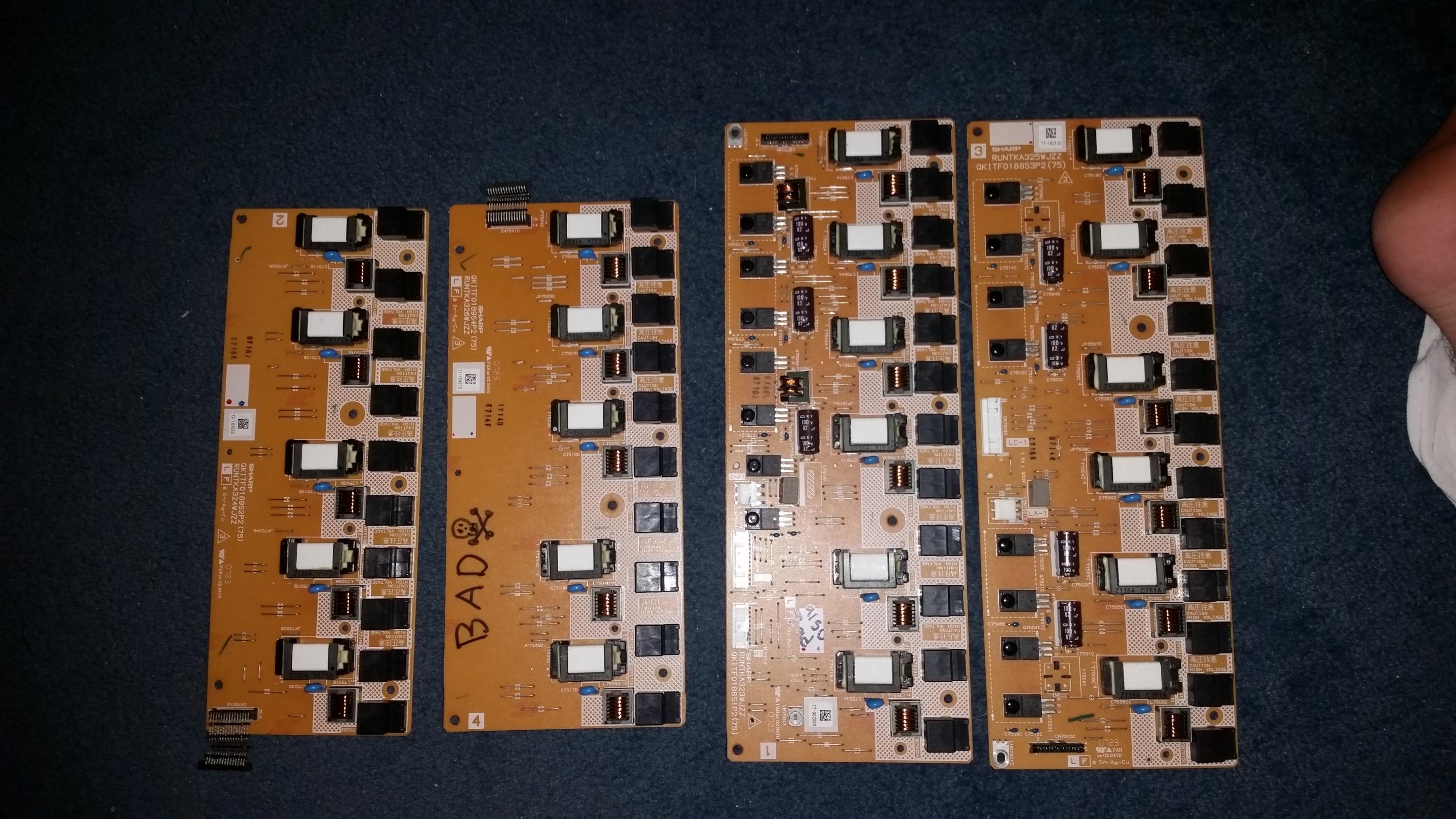 I was wondering if it would be possible to repair the inverters of this TV and get it back in fully functioning order, and someone elsewhere said this was the place to be. There are 4 inverters on the TV, powered by two separate 12v/60v/GND 3-pin power points on the main power board. They each have a model number, RUNTKA###WJZZ where ### is 323, 324, 325, and 326. RUNTKA323 seems to be the main control inverter, as it has an LM2901 voltage comparator and an OZ9928SN CCFL backlight inverter controller, whereas the rest of the boards have only small unlabeled components. The capacitors look fine on all of the boards, but I'm no expert. I had a friend look at them, and they labeled two of the boards as bad, but they did not say why, and I cannot contact them any more. Attached are several images of the boards.