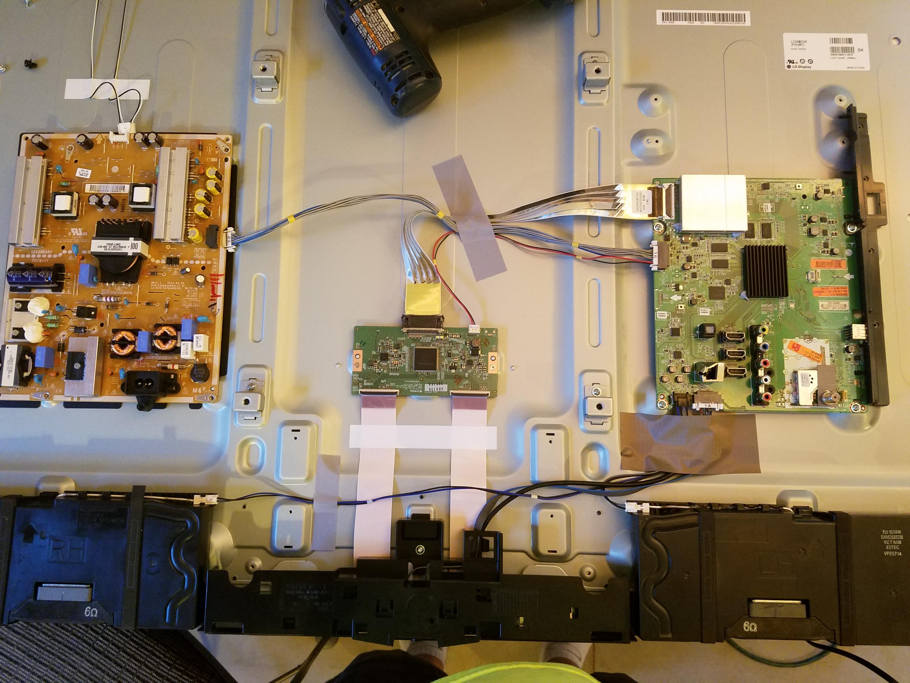 Also to clarify and update after further testing... It is a dim lit screen when I turn it on, not a bright white (1st picture). When I unplug one side of the T-Con it gets bright white on one side (2nd and 3rd pictures). Also I have been able to get volume coming out of the TV from an input. I think that this might mean a bad T-con? Is that correct?Attached Filesif you find these attachements useful please consider making a small donation to the site
